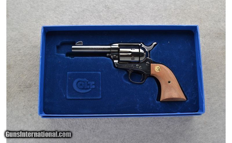 Description: This Colt Model Shopkeepers SAA is a 6 shot single action revolver in .45 Long Colt Cal. It has a 4 inch barrel. A blade front sight and an integral notch rear sight. The grip is a smooth walnut with golden Colt horse logo medallions. It has a checkered hammer spur. It comes in its original boxes. .45 Long Colt SOLD Chambers: 6 shot fluted cylinder. Metal Condition: Excellent. Wood Condition: Excellent. Bore Condition: Excellent. Barrels: 4 inch. Triggers: Single Action. Weight: 34 oz. Sights: Blade front. Integral notch rear. Item Location: Richfield, WI |