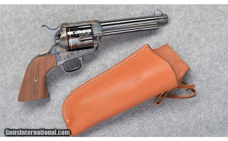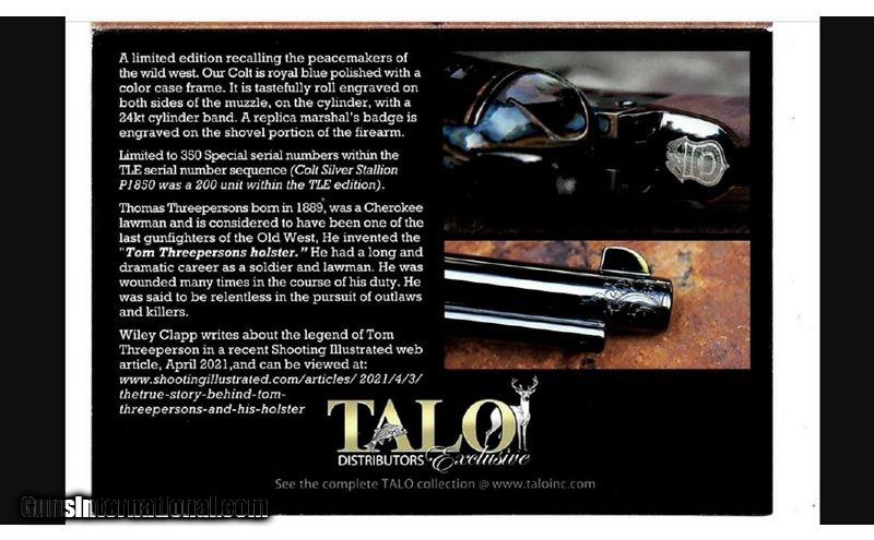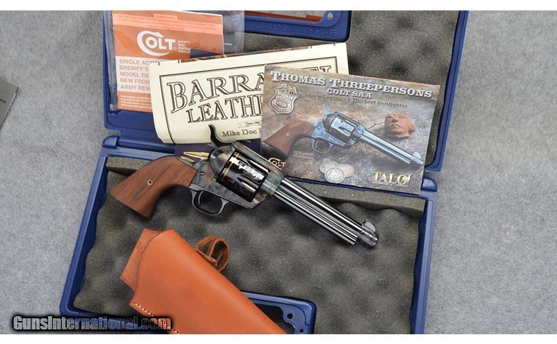 Description: Talo Distributing has partnered with Colt to offer this limited edition Thomas Threepersons Single Action Army. Highly polished Colt royal blue, case colored frame, foliate engraving on the muzzle and cylinder with 24K gold cylinder band and replica marshals's badge engraved on the backstrap. New in factory box with holster by Barranti Leather Co. in the design popularized by Tom Threepersons. .45 Colt SOLD Metal Condition: Blued and Case Hardened Wood Condition: Smooth Walnut Bore Condition: NEW Barrels: 5 1/2 Inch BBL Triggers: Single Action Weight: 38 oz. Sights: "Notched Frame, Blade Front Item Location: Buda, TX |