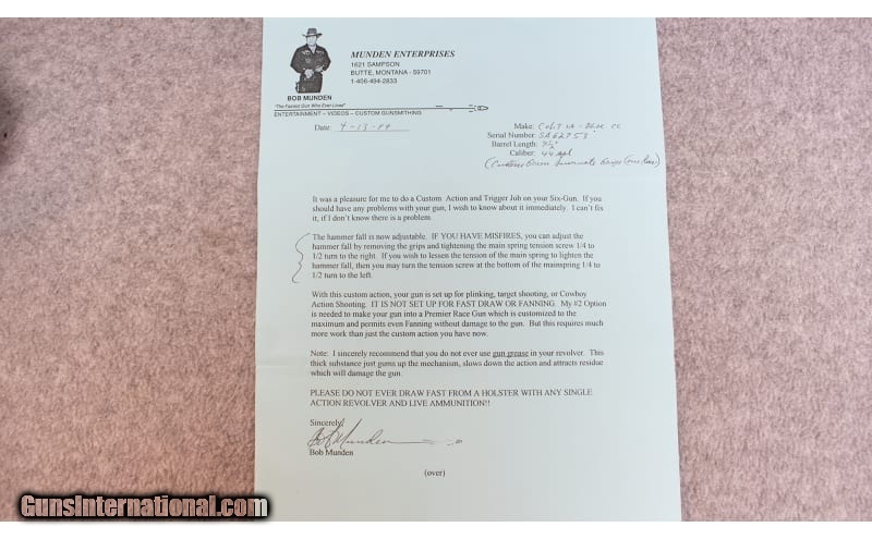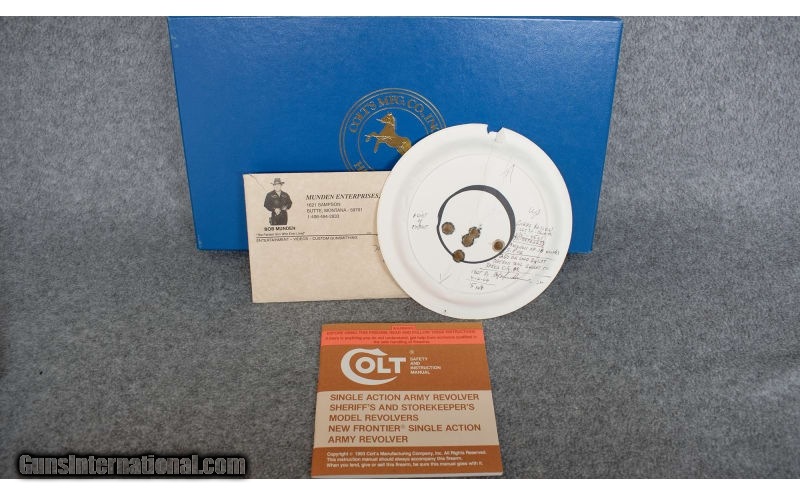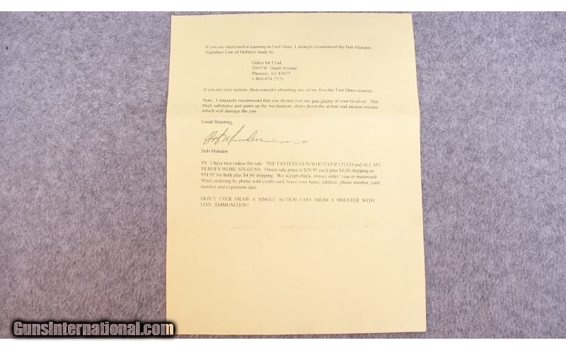 Description: Robert (Bob) Munden was an American exhibition shooter who performed with handguns, rifles, and shotguns. He is best known for holding 18 world records in the sport of Fast Draw and having the title "Fastest Man with a Gun Who Ever Lived" bestowed upon him by Guinness World Records. .45 Long Colt SOLD Bore Condition: Bob Munden Test Fired Item Location: Billings, MT |