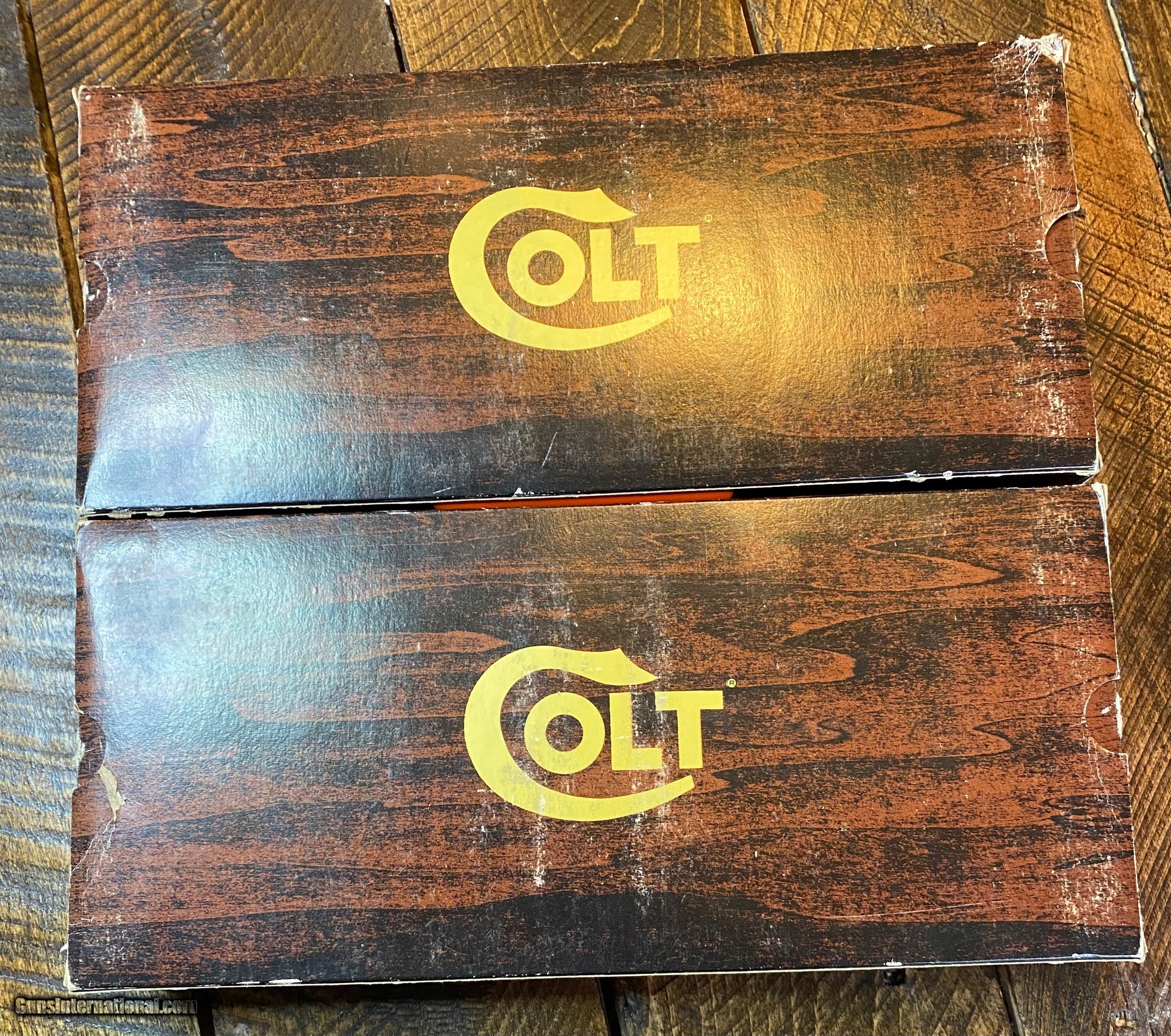 Description: Pair of Consecutive Serial Numbered Colt Single Action Army New Frontier Model. Guns are identical set ups. 7.5" Barrels. No turn Lines Nice Styrofoam and original Plastic Bags, Hang Tags Serial number 16656NF Has Label and more paperwork-SN is not struck well as shown. Serial Number 16654NF Label Worn off-less paperwork as pictured Both appear to be unused and unturned Awesome looking case colors and deep blue. Original Wood grips look new. You are purchasing both guns. Shipping is $35 for both to your ffl dealer and will come priority. Consecutive SAAs are really hard to come by especially Unfired in the boxes. Don't wait on these! No CC fees! Whiskey Rebellion Firearms is a Disabled Veteran owned small business. SOLD Handgun Caliber: .45 Colt Manufacturer: Colt Model: SAA |