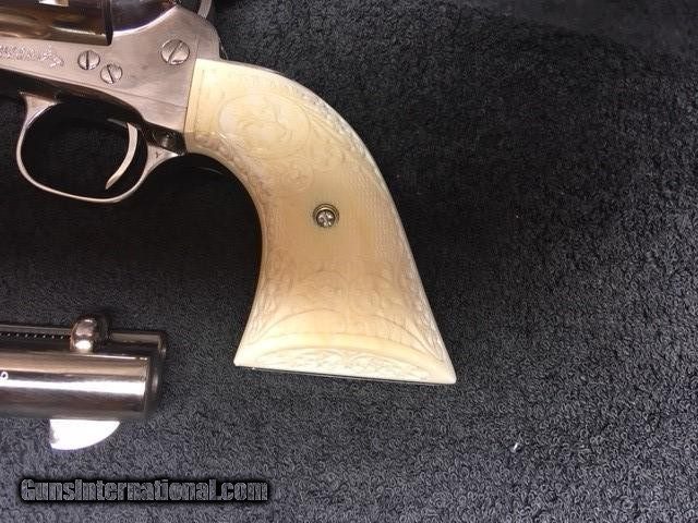 Description: HERE IS A MATCHED PAIR OF CONSECUTIVE SERIAL NUMBERED, NIB SINGLE ACTION ARMY'S!!.... THESE GUNS ARE NEW / UNFIRED / UNTURNED. COMES WITH ALL FACTORY BOX,PAPERS ETC.... WHAT MAKES THESE GUNS KILLERS IS THAT THEY ARE BOTH WEARING STUNNING CARVED AND CHECKERED IVORY GRIPS!!! GUNS ARE BOTH NICKEL PLATED, AND CHAMBERED IN .357 MAG, AND HAVE 4-3/4" BBLS, THEY JUST DONT GET MUCH SLICKER THAN THESE!!!! ADD$75 FOR FED-EX SHIPP& INS SOLD |
