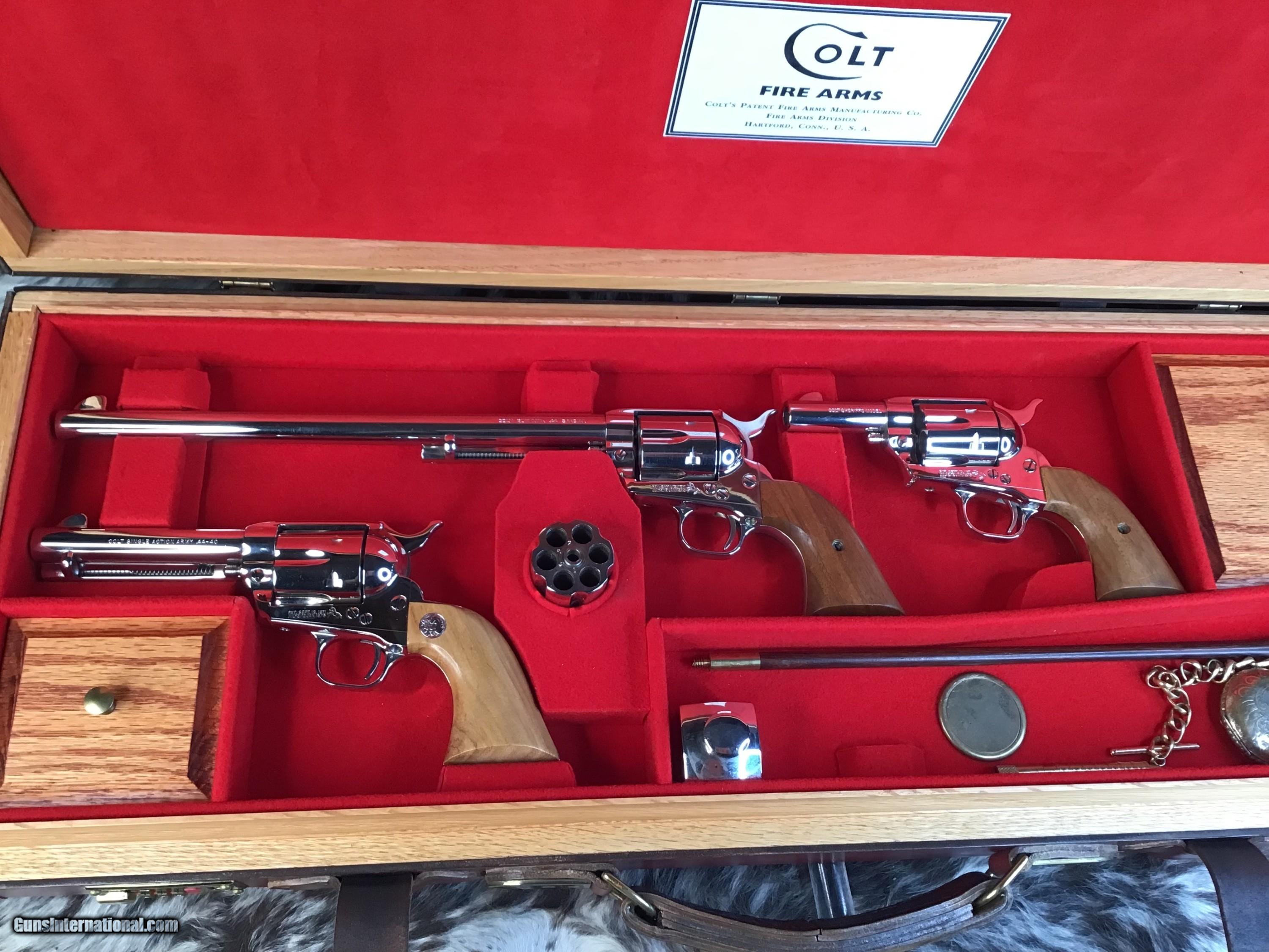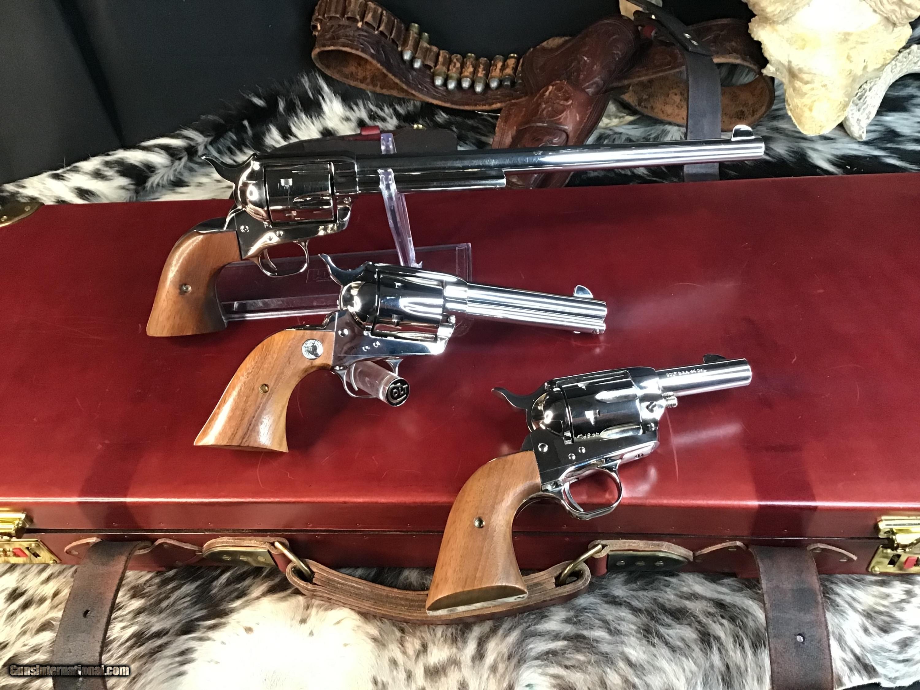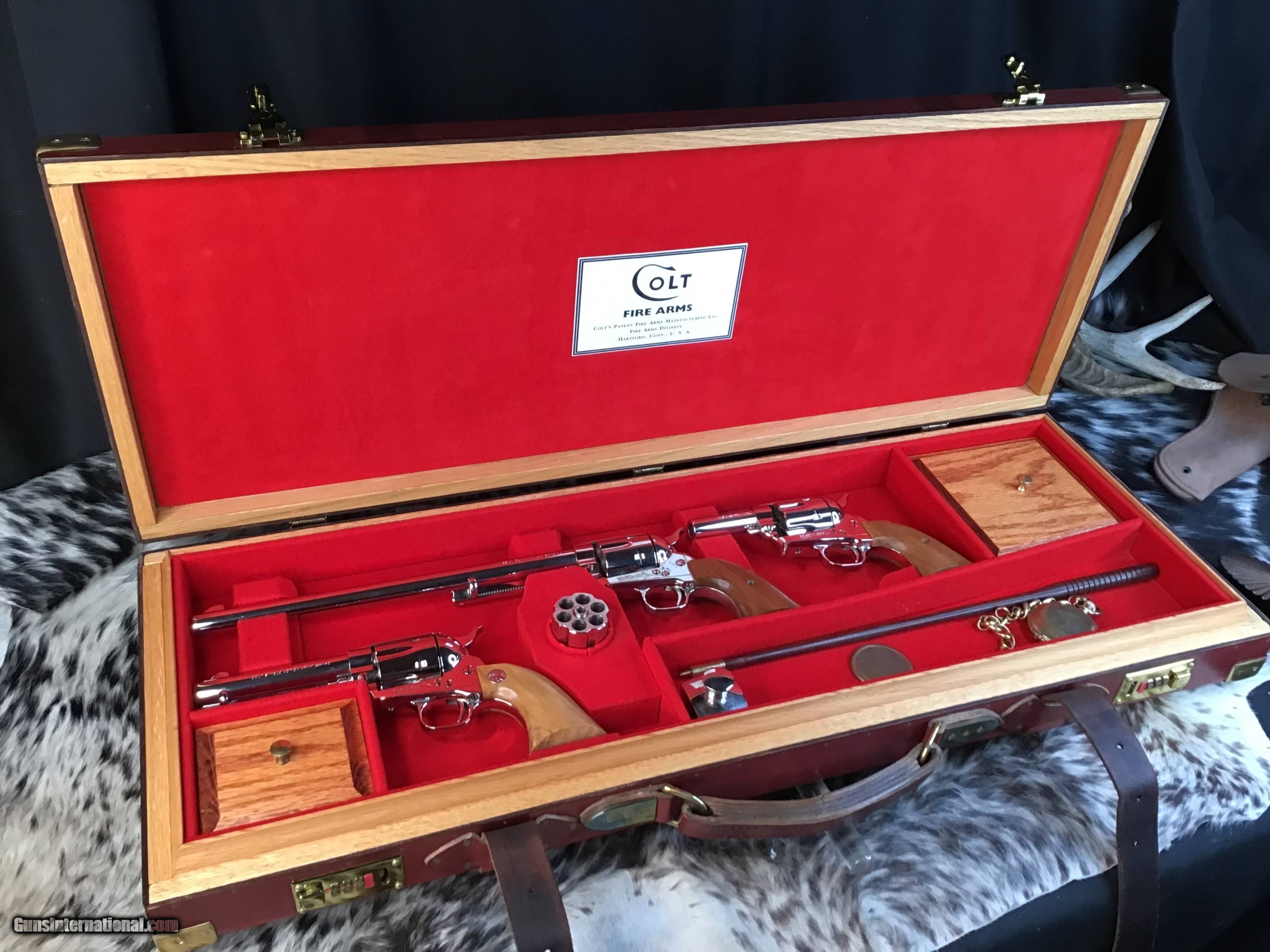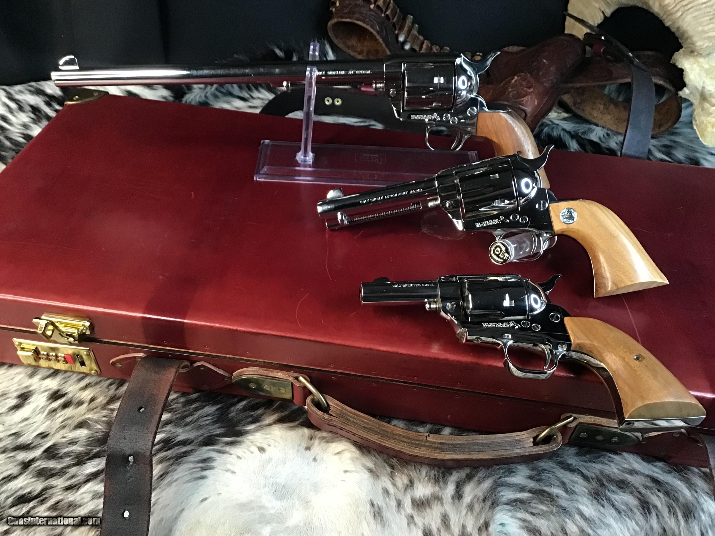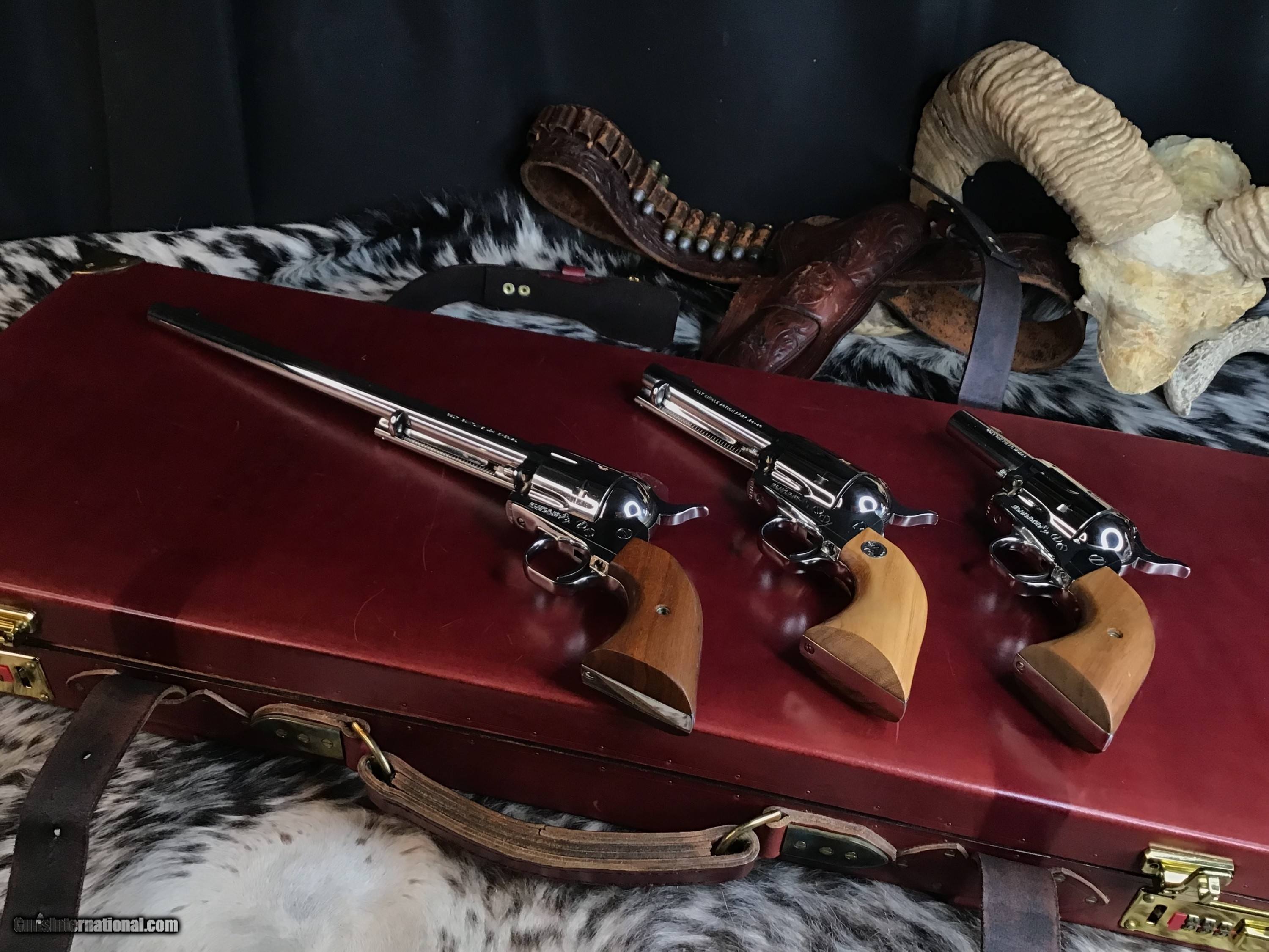 Custom Shop Three Leather Cased Nickel Finished Colt Single Action Army Revolvers with Accessories. Trades Welcome