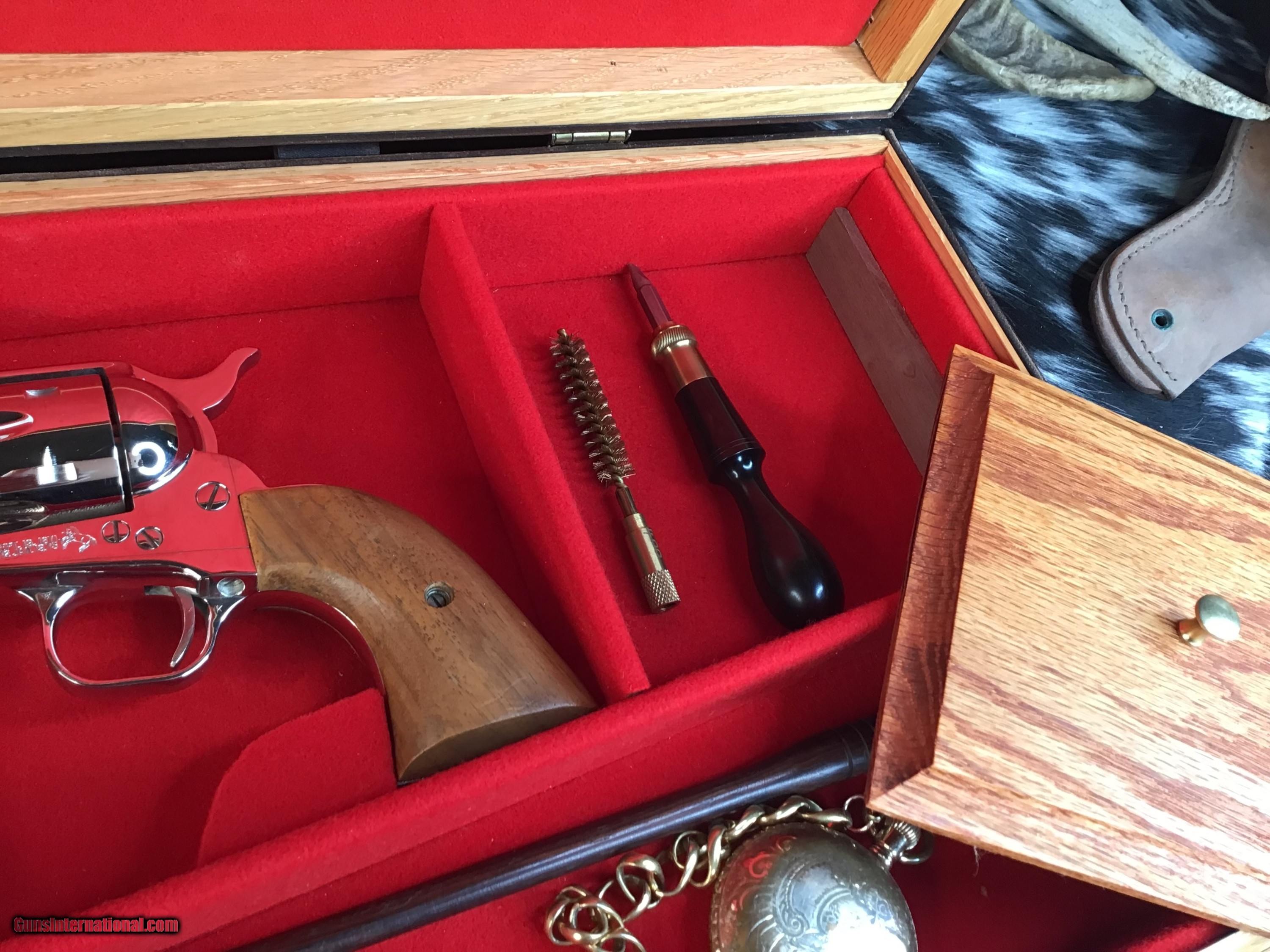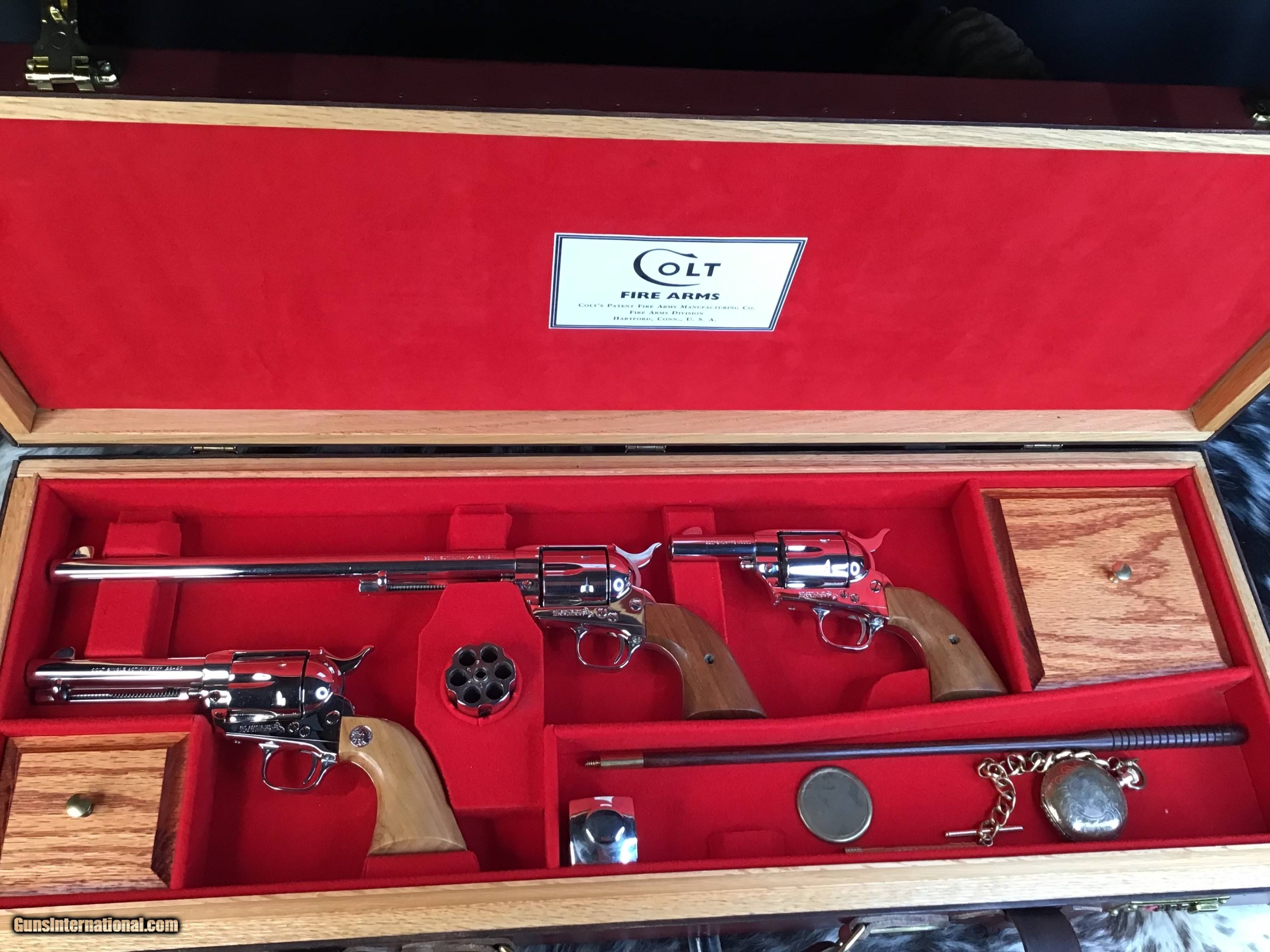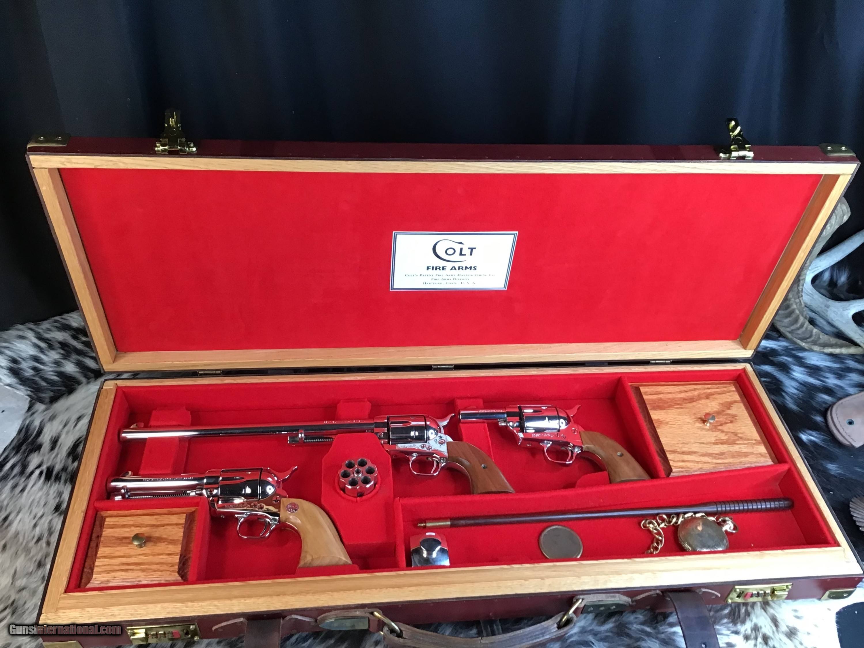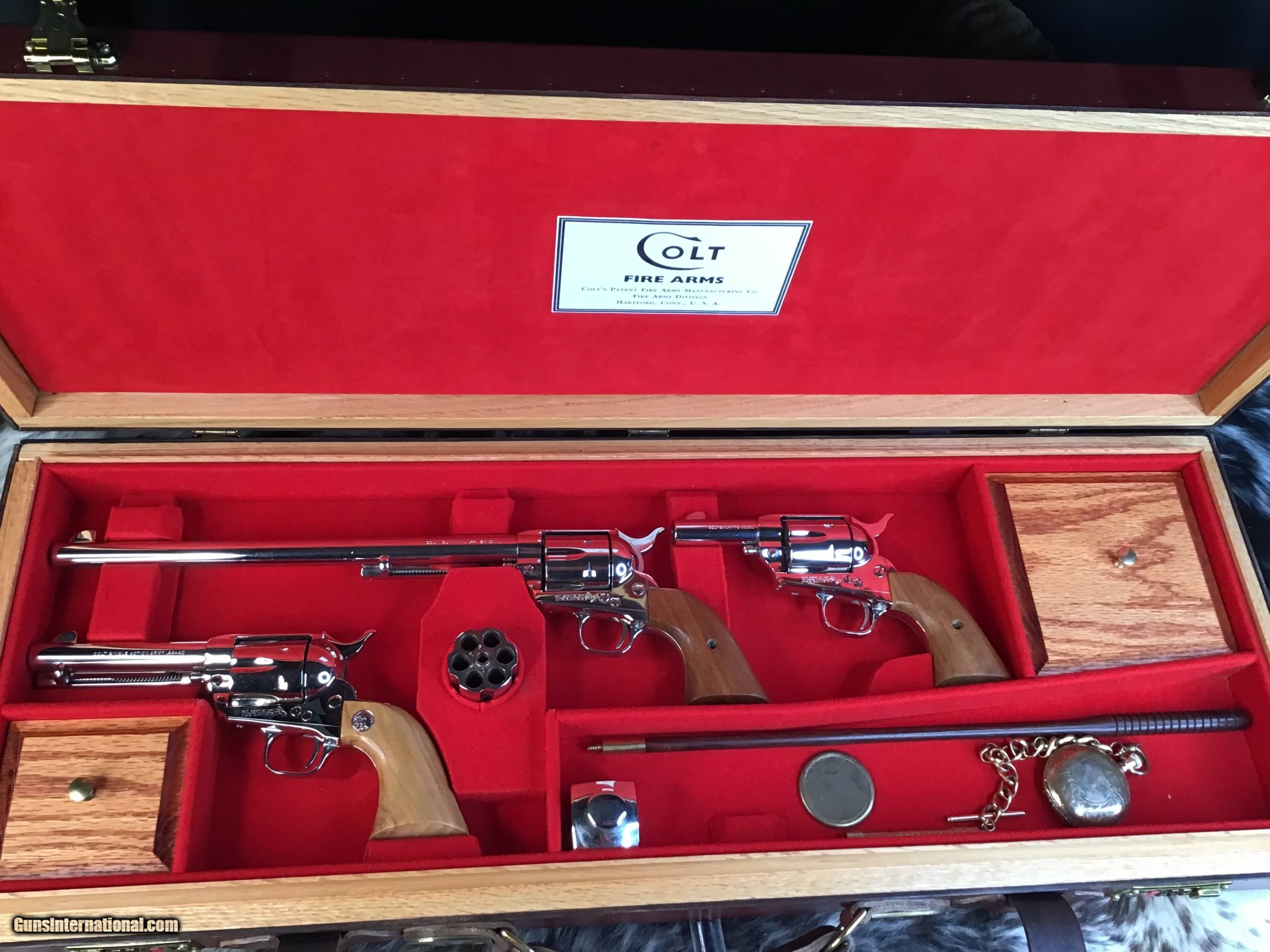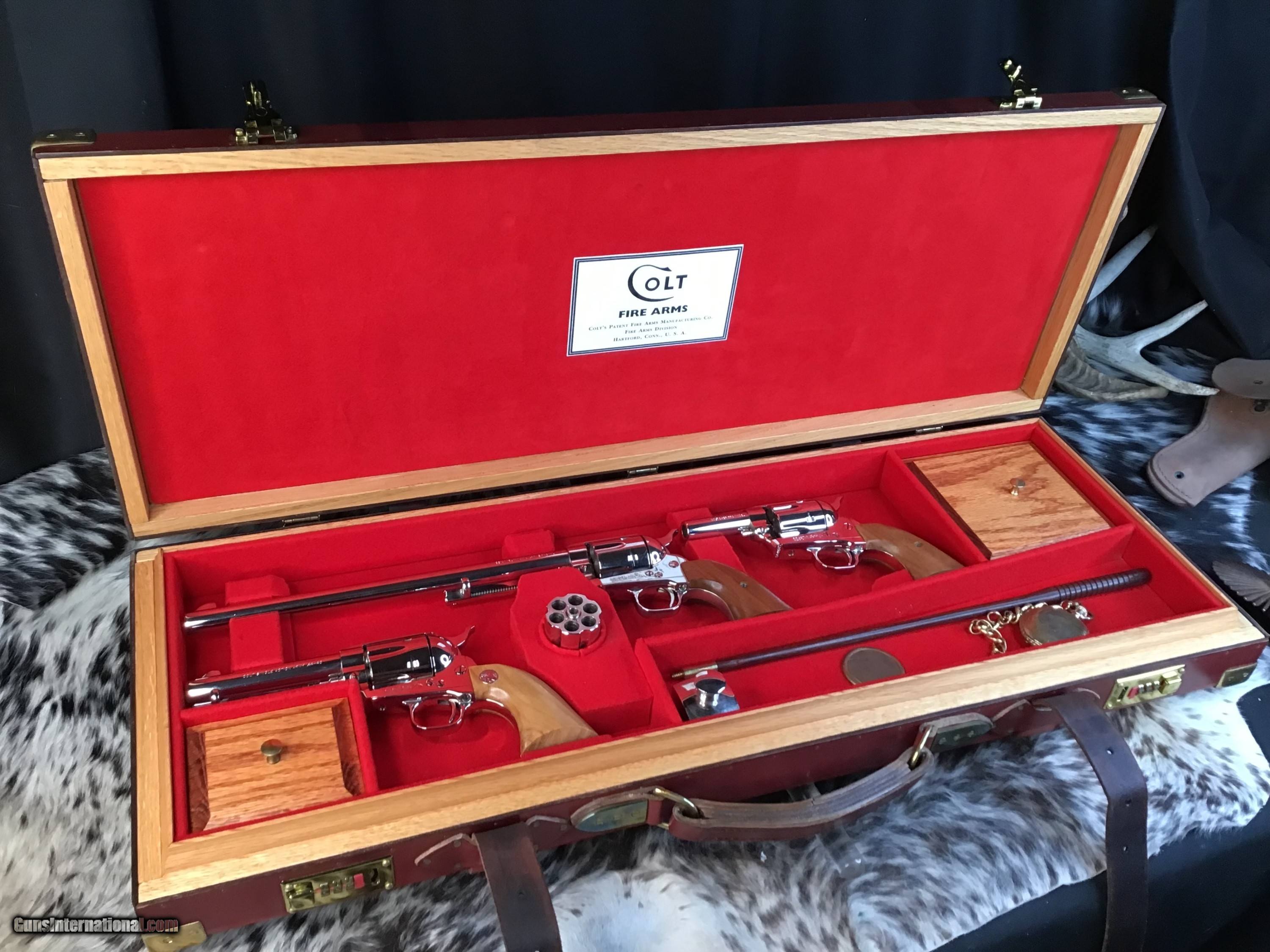 Custom Shop Three Leather Cased Nickel Finished Colt Single Action Army Revolvers with Accessories. Trades Welcome