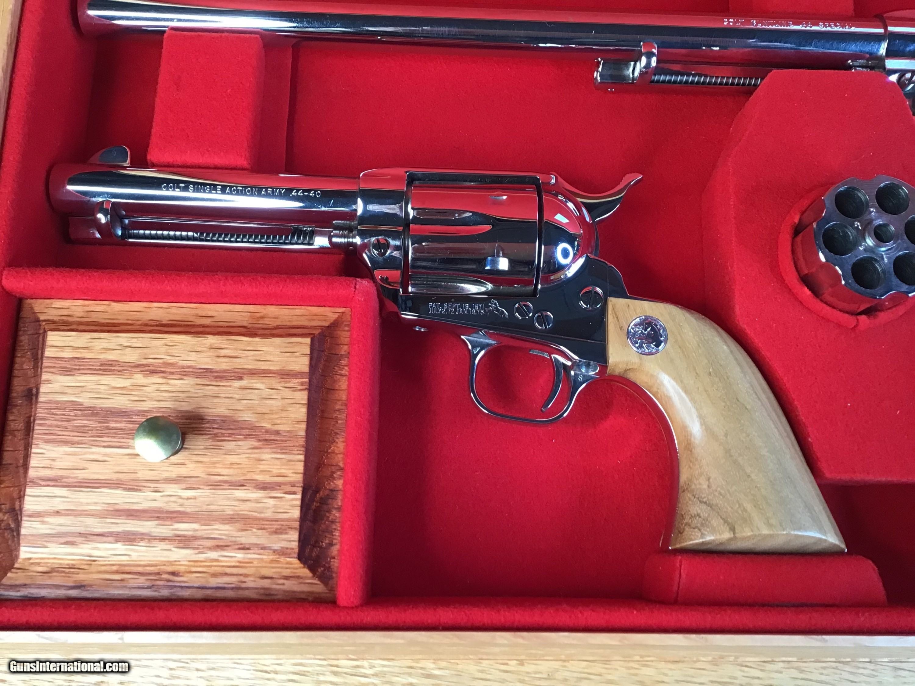 Manufactured in 2007, cased with "B" and "C". All three revolvers feature a nickel plated finish, fixed blade front and top strap rear sights, the Colt address roll-marked on top of the barrel with the model designation roll-marked on the left side of the barrel, the two-line Colt patent dates roll-marked on the left of the frame with Rampant Colt, Colt "triangle/VP" proofs marked on the left of the trigger guards, and fitted with a pair of smooth walnut grips. Includes a red leather carry case fitted for all three revolvers, a cleaning rod, cleaning tools, a nickel oiler, and an extra nickeled cylinder marked "44-40" and matching numbered to "C".