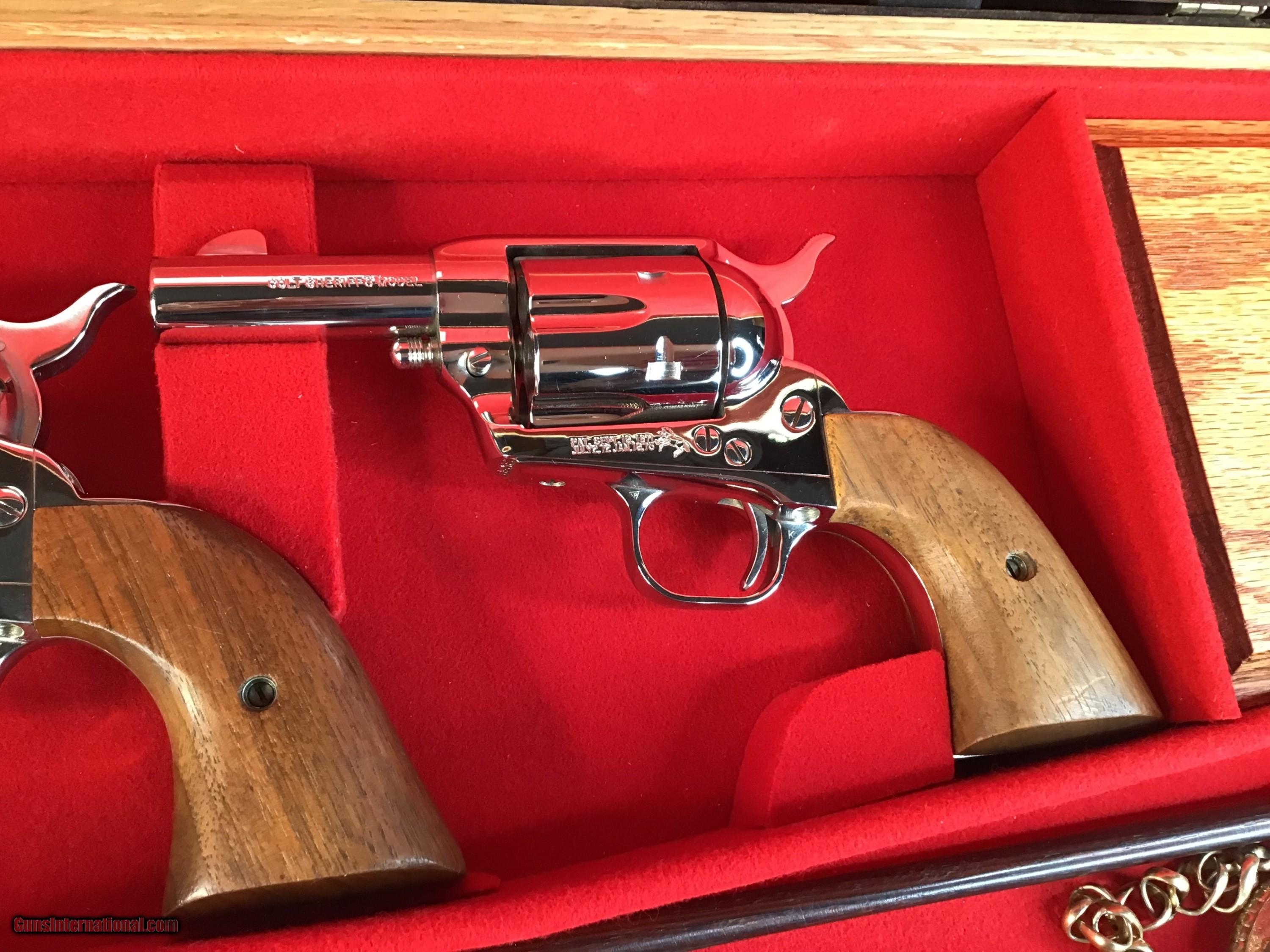 ConditionExcellent overall, retaining 99% original nickel plating with a minor cylinder drag line, some limited minor handling evidence, and clear roll-marks. Mechanically excellent. The case and accessories are very fine to excellent with guns appearing to remain unfired.