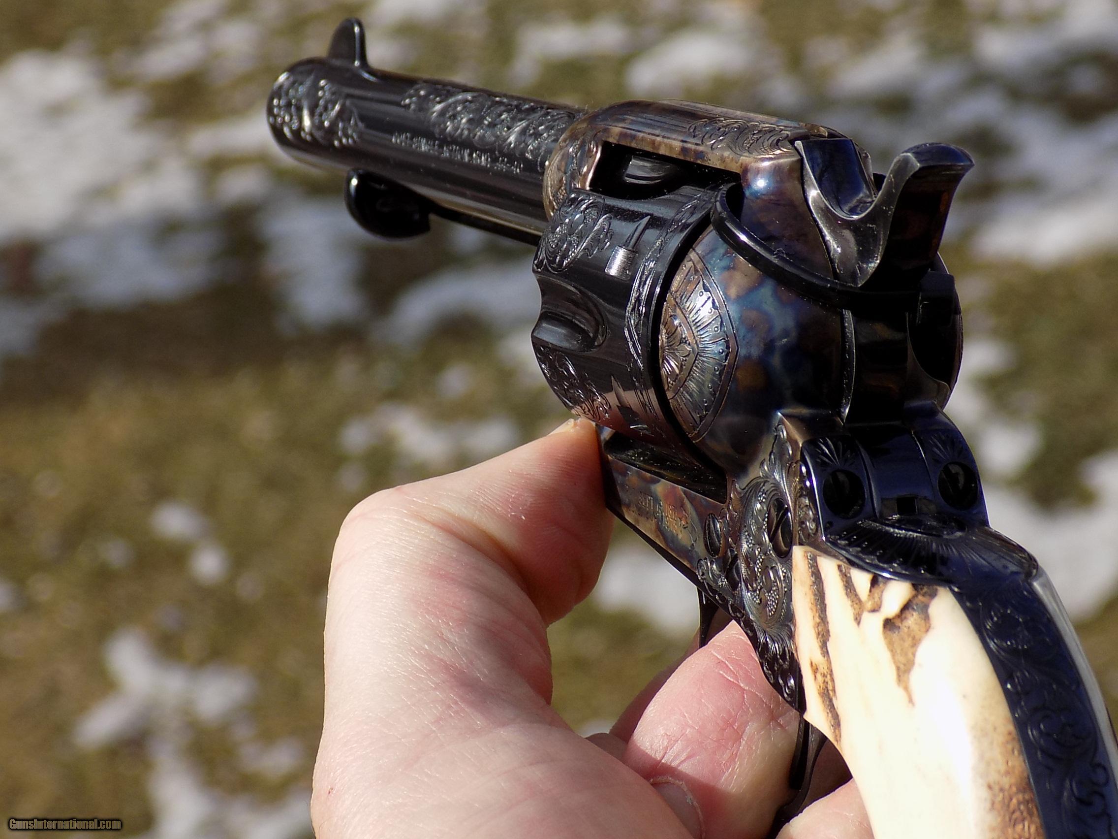 Description: 'WE NEED INVENTORY' WE BUY TRADE AND CONSIGN QUALITY FIREARMS. Sold pending payment.. Colt 3rd Gen SAA 44-40 with 5 1/2 inch barrel. B/CH. This Colt SAA truly is a piece of art. Factory, "Master" Type "B" scroll engraving completed by Dennis Hies. This gun shows the amazing talent of one of the finest engravers in the country. Vivid case colored frame, charcoal blue finish and completed with Sambar Stag stocks custom fitted by one of the most respected grip makers in the country, Dan Chesiak. If you are looking for a quality Colt investment I think this piece of art is worth considering. We have had this beauty for a couple weeks now and I have spent hours looking at it and have enjoyed every minute. There are many engraved 3rd Gen SAA's on the market, however, very few have been Master Engraved. This Colt comes in its original box with Custom Shop label. Label confirms the configuration. The name Kies, "Dennis Kies, is engraved on the frame and DC, "Dan Chesiak" is stamped on the inside of the grips. A Perfect and RARE example of a Colt Factory, "Master" Engraved, 3rd Generation Single Action Army. Buyer pays $60 insured shipping. 6,995.00 or best offer. SOLD |