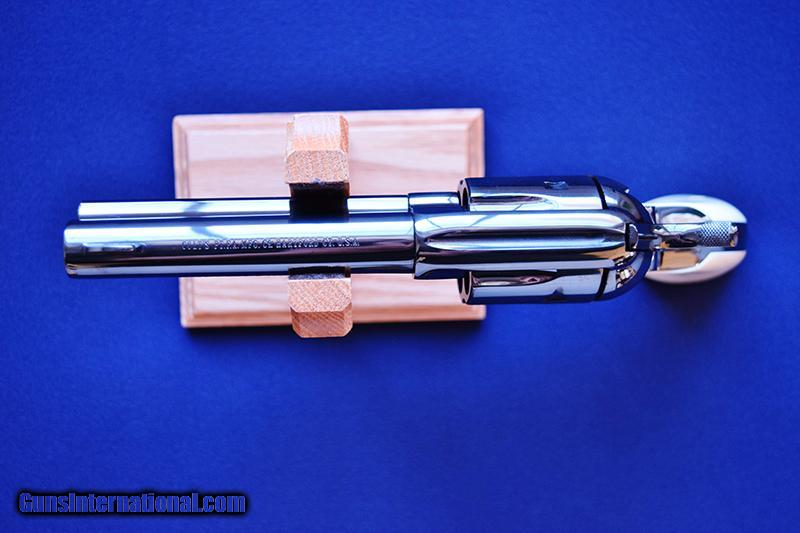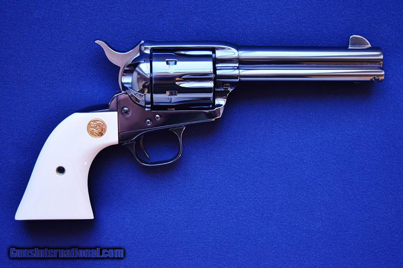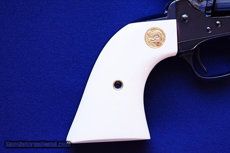 Description: Rare & Desirable Colt Single Action Army 3rd Generation Model P-1940Z in 44-40, SA91XXX manufactured 1988. Features rare full blue finish with 4 ¾” barrel, fitted with authentic presentation ivory grips with gold Colt medallions. Condition is NIB, unfired other than at the factory. Complete with Colt Factory maroon box with matching label numbered to the revolver & all paperwork. SOLD |