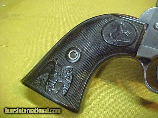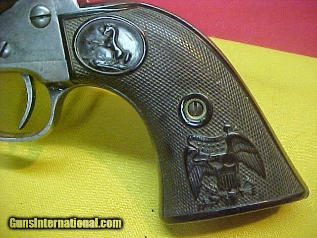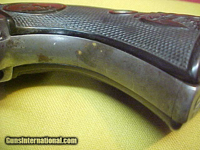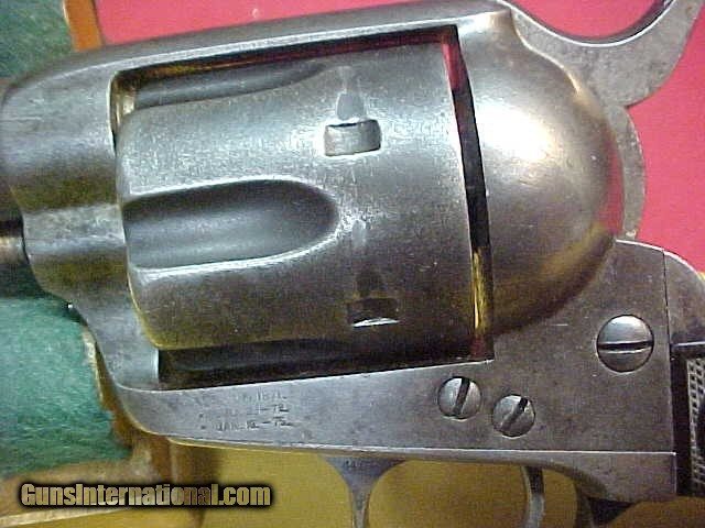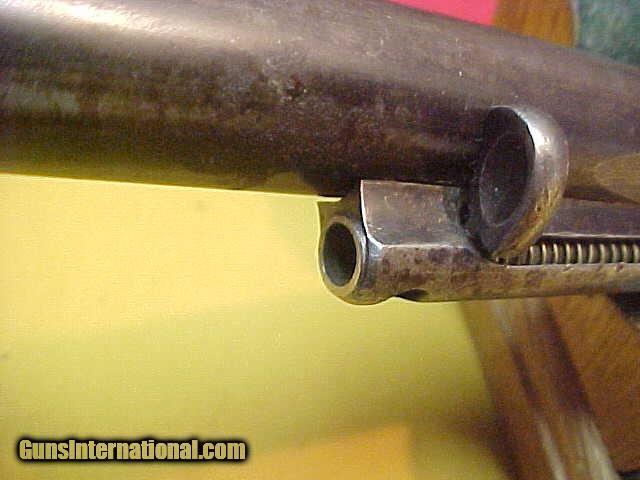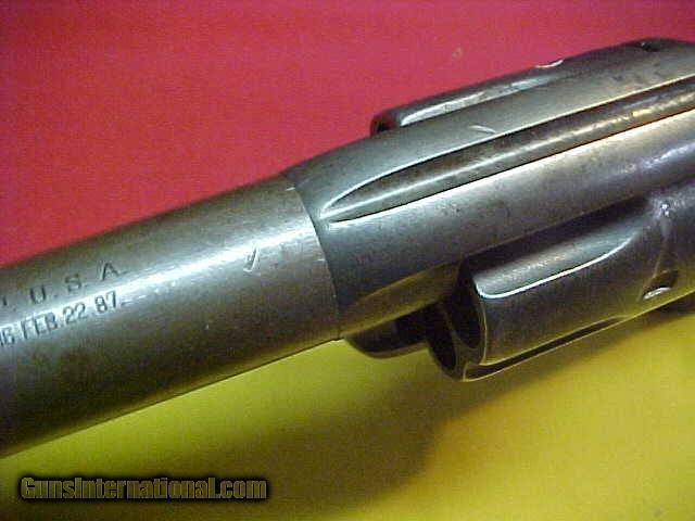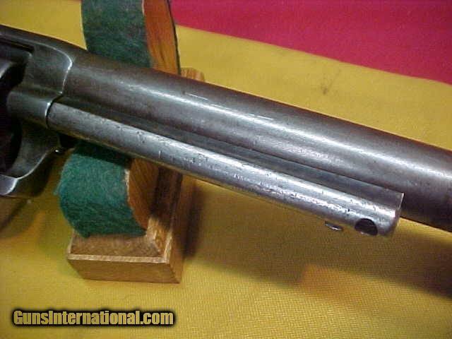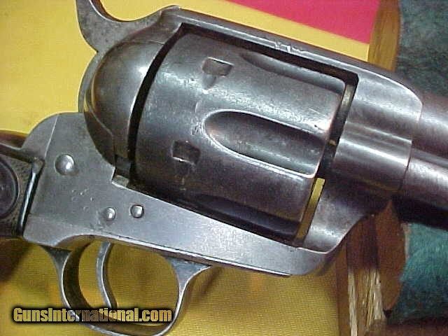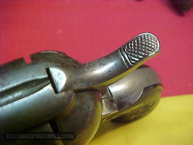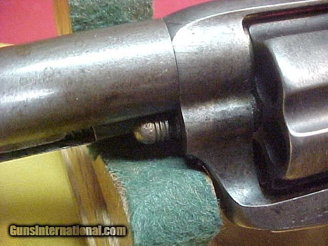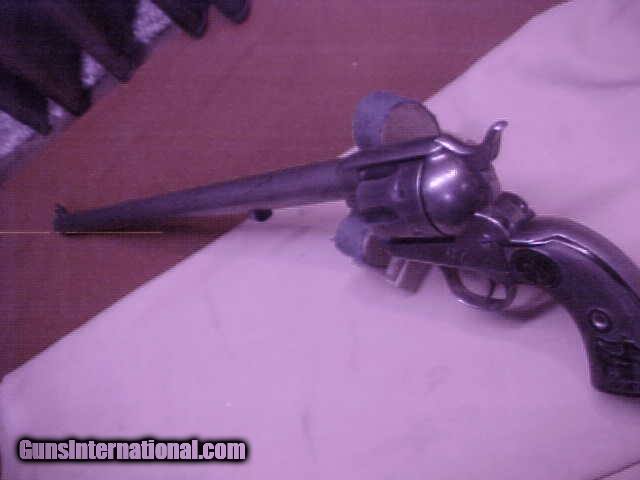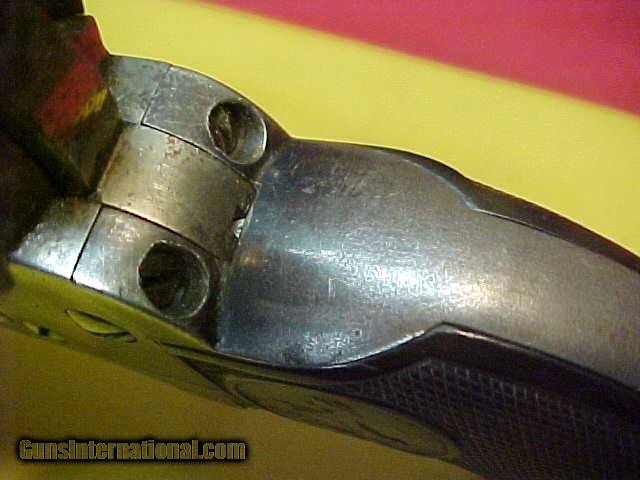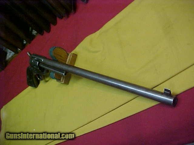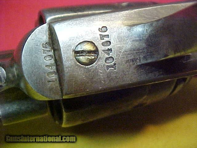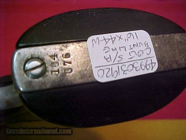 Description: #4993 Colt S/A 16”x44WCF, with a G-VG bore, being about a 6 on a scale of 10; not having heavy scale or pitted, but showing some significant wear to the rifling. Mechanically, it does not have all the “clicks” on the hammer; only the safety and the full cock positions, so if shooting is a priority, then to be fully safe, it should at least have a hammer job and blessing by a competent gunsmith who knows antique guns. It has matching numbers in the 104XXX serial range, which makes it manufactured in 1884 which is about the time that the so-called Buntline Colts entered the market. Now, suffice to say that if this gun was a certainty of being an ORIGINAL 16” Buntline, it would be at least six to eight times the price that I have it listed. I have not tried lettering it, but I am pretty sure that it will NOT letter from Colt with this 16” barrel. More likely it has been re-barrelled using what I think is a Colt Lightning Carbine barrel, thus having the Colt address. The desireable Eagle grips fit very well, so are probably the original grips to this gun and they show just some light wear and have no mentionable damage. The metal is smooth with good traces of original blue in the protected areas, such as the cylinder flutes and top of the backstrap, etc and markings are very good, as well, including the 44CF stamp on the trigger guard leg. Overall, it is a very, VERY impressive handgun, and obviously was built by a very clever and experienced gunsmith and will most likely be picked up and examined by danged near everybody who sees it. It’s a GREAT conversation piece, a great gun show table attraction piece, and after a good hammer notch repair job and gunsmith blessing, it should make someone a great shooter. VG-VG+ as described. $3750 SOLD Antique: Yes |