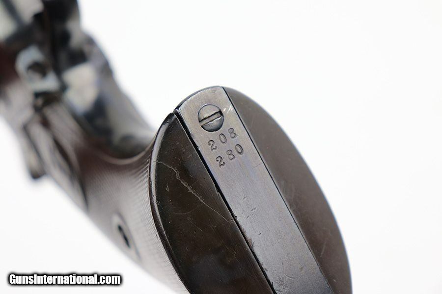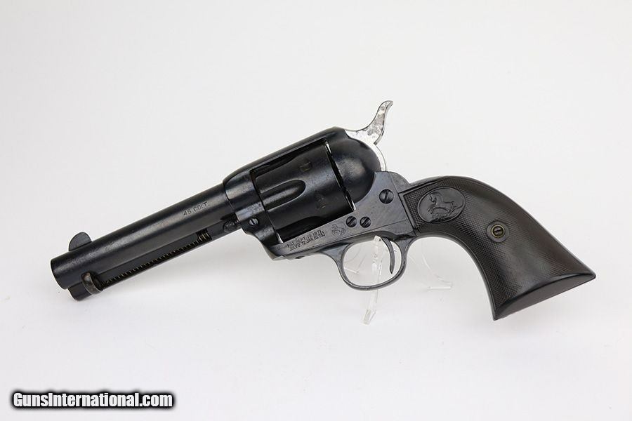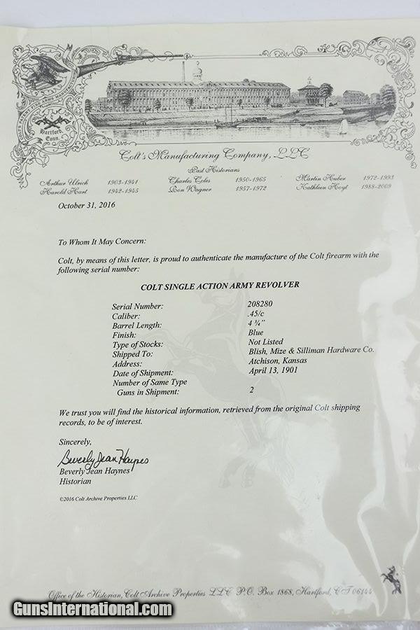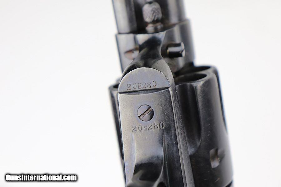 Description: This is a Colt Single Action Army Revolver that was manufactured in 1901. It comes with a certified Colt Factory Letter. The gun is all matching, but the gun has been refinished and restored. It has retained virtually all of its new finish, but there are areas of minor pitting throughout that have been blued-over. Comes with nice period-correct grips that are slightly worn. The cylinder is tight. The rifling in the bore is a bit worn, and there is minor pitting throughout. SOLD Curio/Relic: Yes Handgun Caliber: .45 Colt Manufacturer: Colt Model: Single Action Army Serial Number: 208280 Condition: Restored Bore Condition: 5.5/10 Manufacture Date: 1901 |
