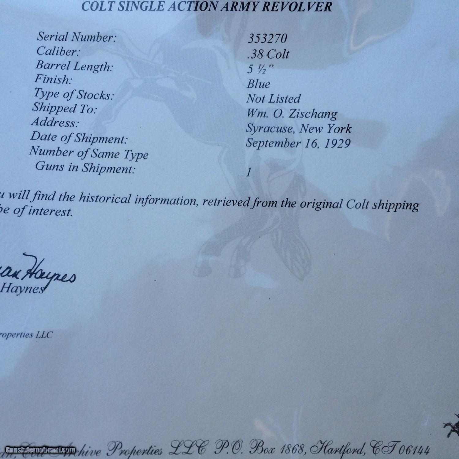 Description: SOLD!!!!!!! Rare caliber 38 Colt Exceptional near new Colt 1st gen SAA. special order 1 gun shipment to Syracuse New York. William Zischang. Family from Germany. SOLD |