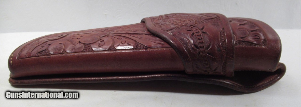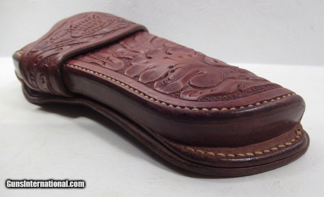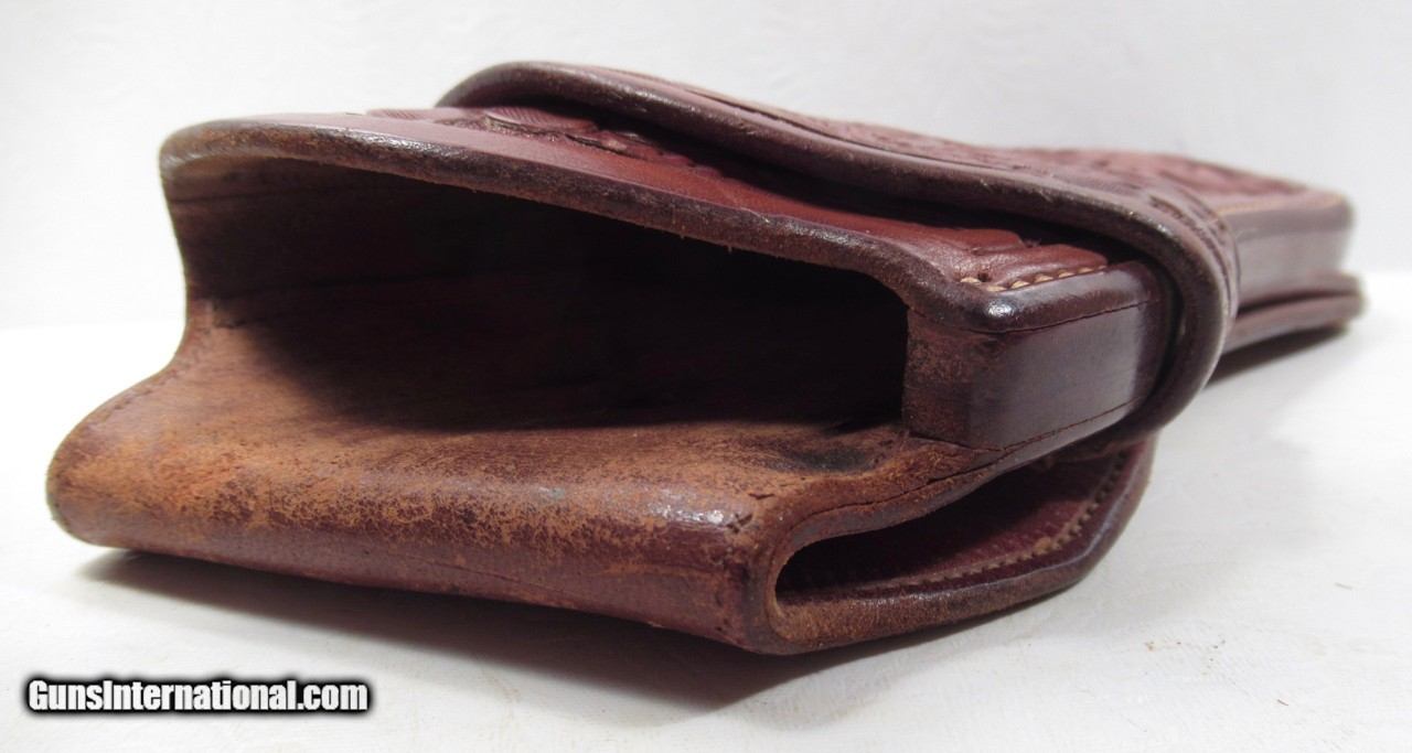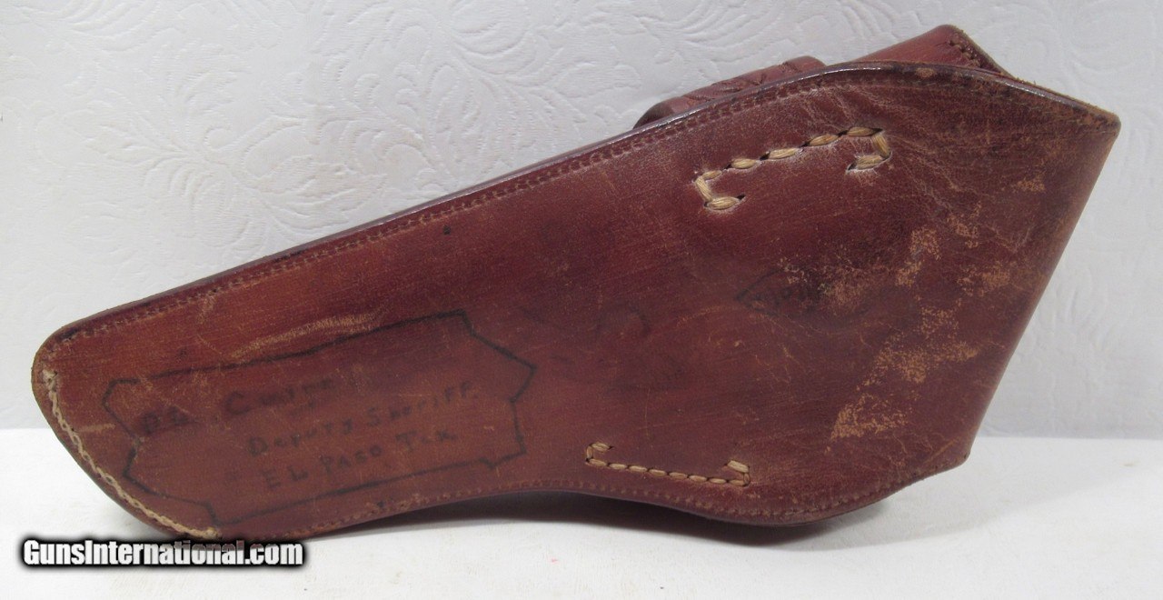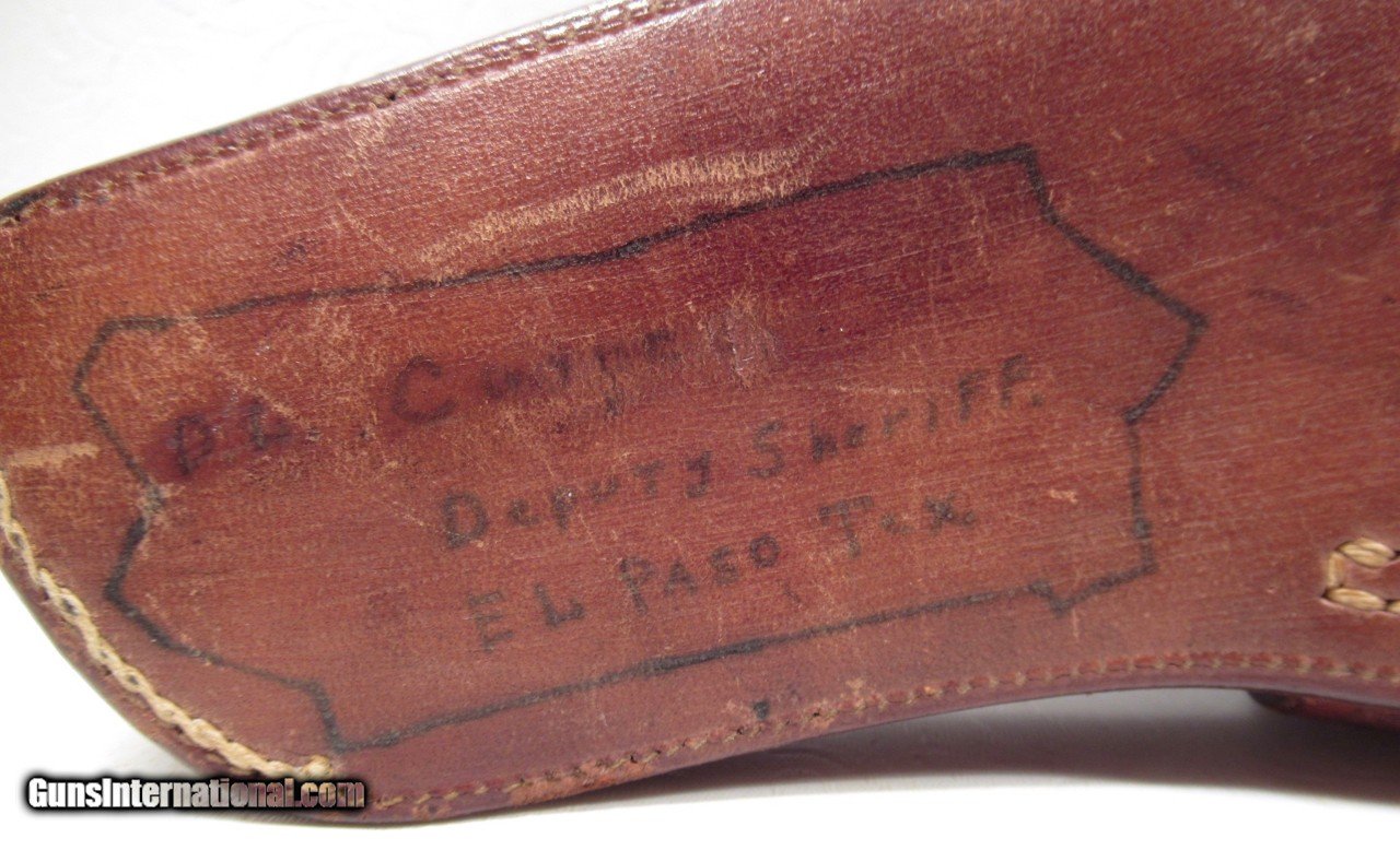 Description: Original High Condition Floral Carved Holster; Made by A.W. Brill of Austin, Texas; Fits a 4” Colt SAA Sheriff’s Model; “Deputy Sheriff – El Paso, Texas” inked on backside; See All Photos for Condition; No Texts. Call or Email Only; PERSONAL PROPERTY of Harold Wieser; Price: $775 + $30 S&H; Price includes insured shipping; return policy: three days inspection from the date the item is received; full refund of shipping both ways ONLY IF THE ITEM IS MISREPRESENTED. SOLD |