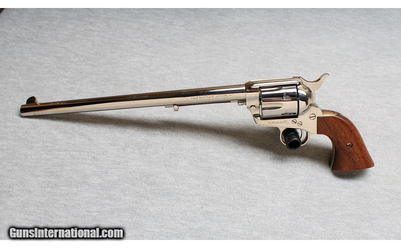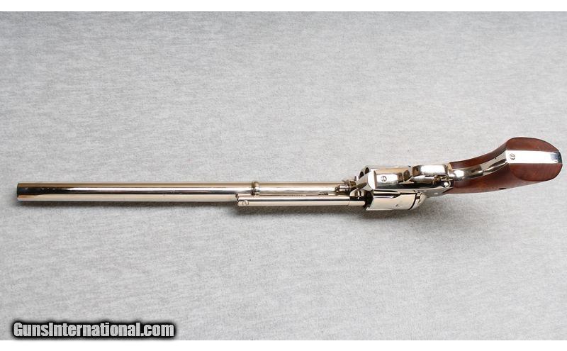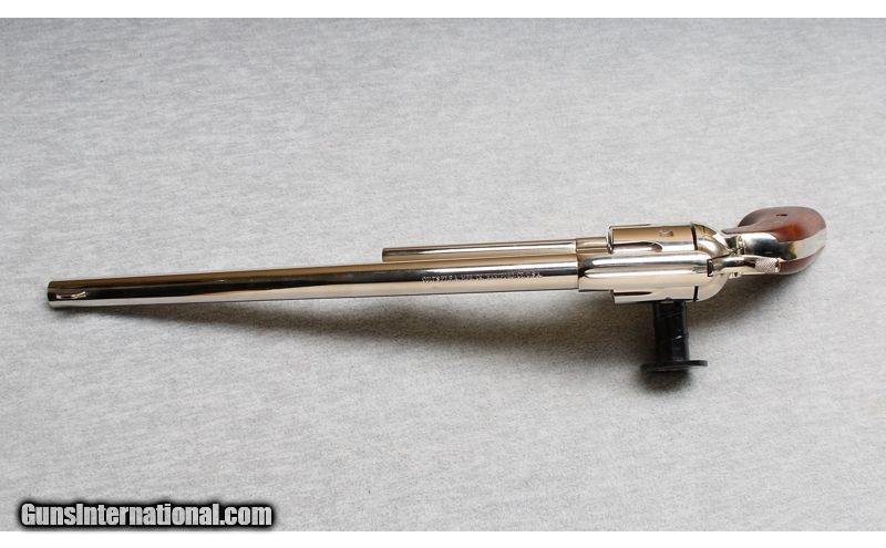 Description: Appears as new, manufactured in 19181 - do note there is no box with this revolver. Classic single action revolver with the more difficult to find 12" barrel version. NIckel finish is virtually marr free, as are the factory wood grips. A great choice for collectors or old west fans. .45 Colt SOLD Chambers: Revolver Metal Condition: As new Wood Condition: As new Bore Condition: Bright Barrels: 12 Triggers: Single action Butt Pad: Wood grips Sights: Fixed sights Item Location: La Vista, NE |