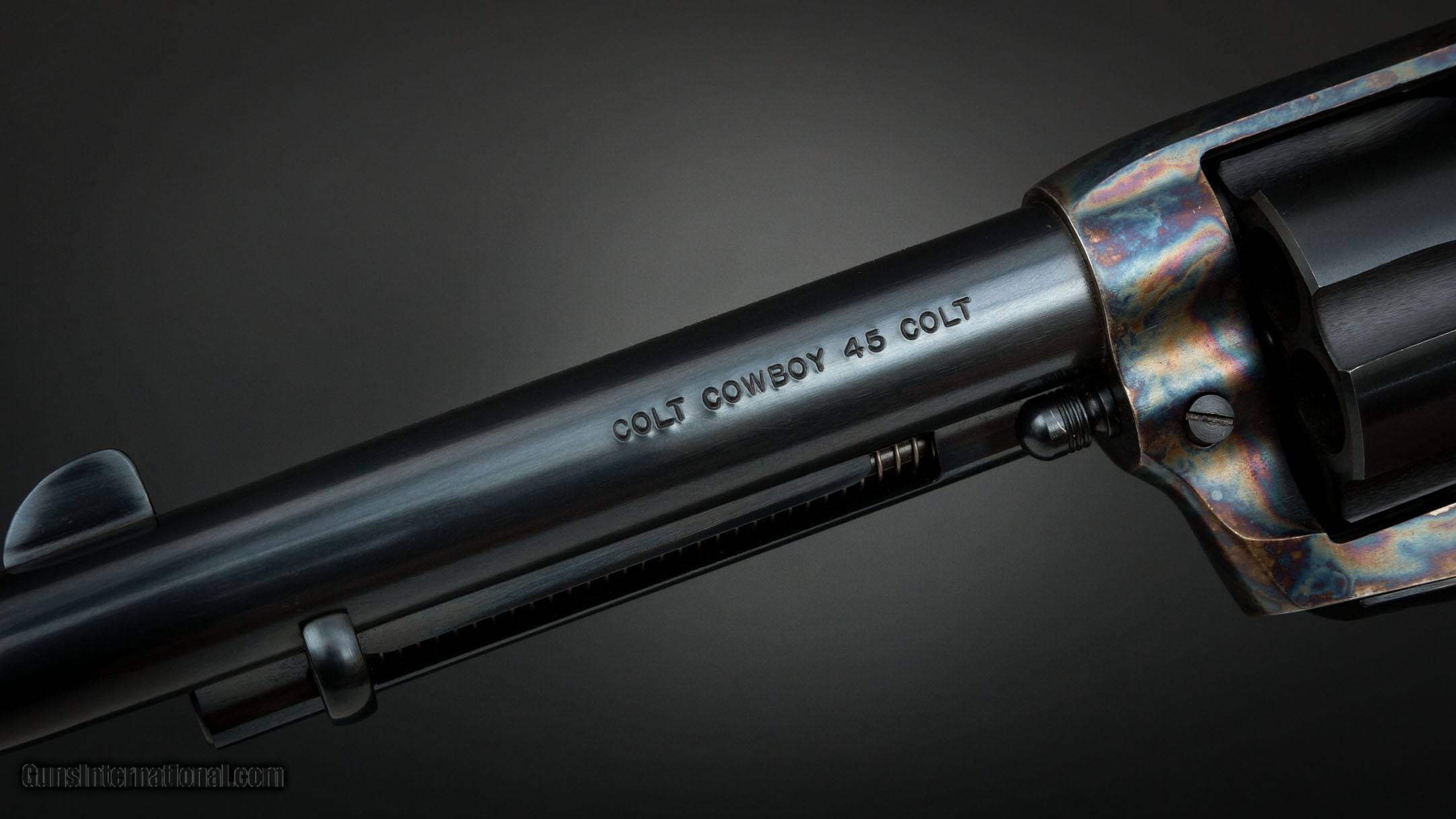 Description: Colt Cowboy single-action revolver, made in 1999. Factory blued, 5 1/2-inch barrel, chambered in .45 Colt. Factory-colored frame and loading gate (NOT Turnbull finishes). Checkered hard rubber grips. Traditional blade front sight. Transfer bar safety. Contact us for more information and additional photographs. SOLD Handgun Caliber: .45 Colt Manufacturer: Colt Model: Cowboy Serial Number: TF02512 Barrel Length: 5-1/2 Action: Single Action Revolver Manufacture Date: 1999 Item Location: Upstate New York - Finger Lakes Region |