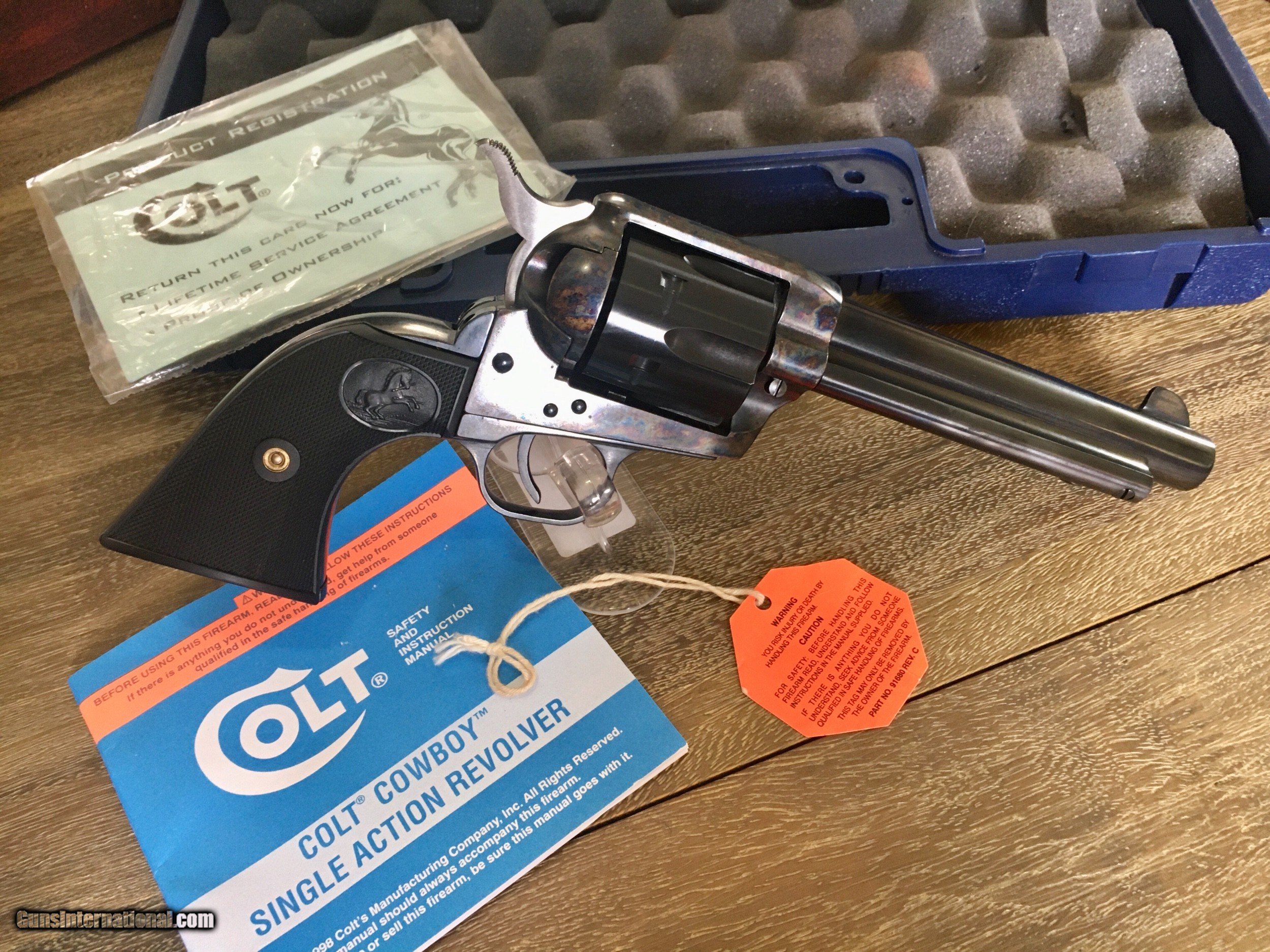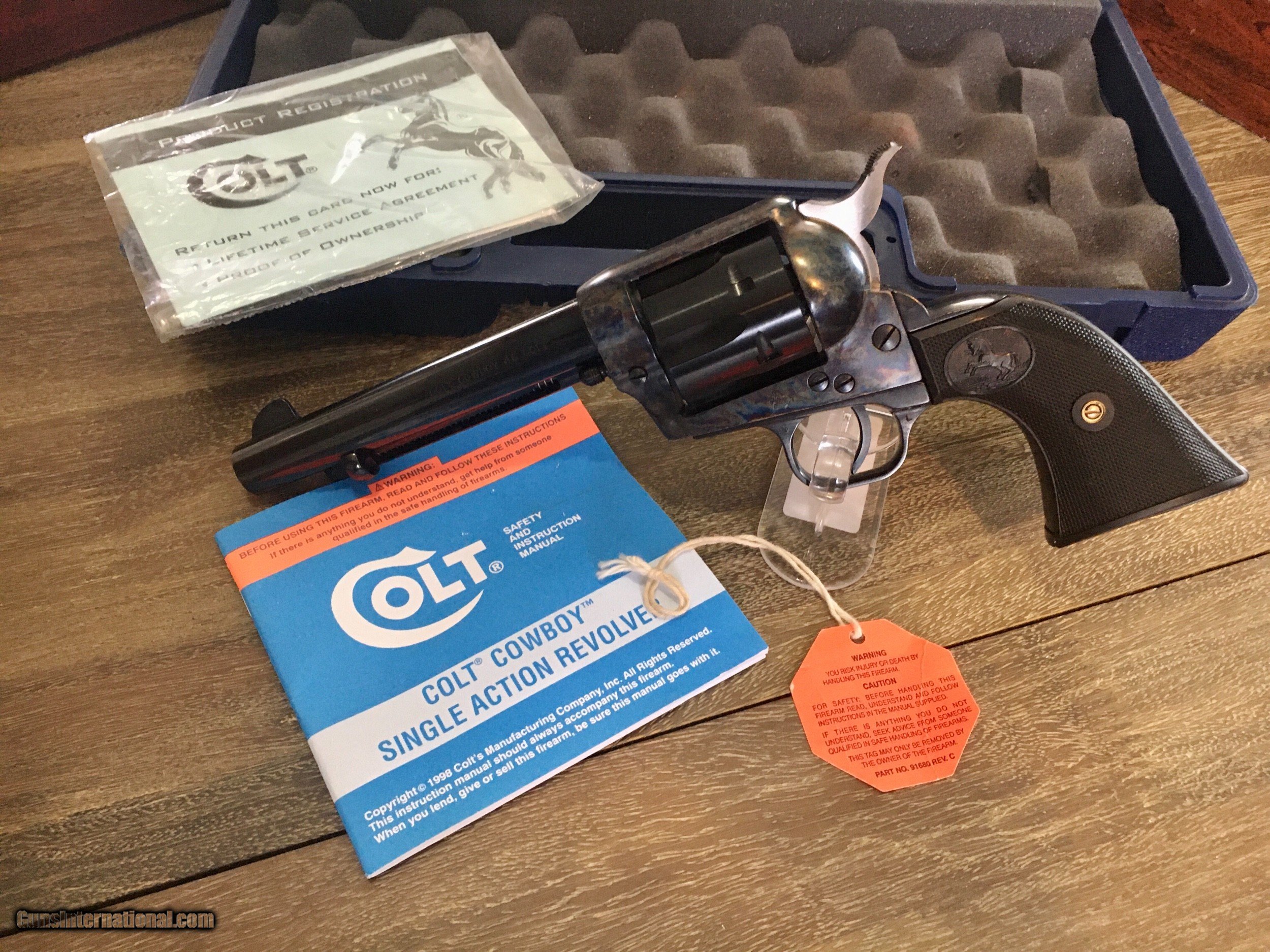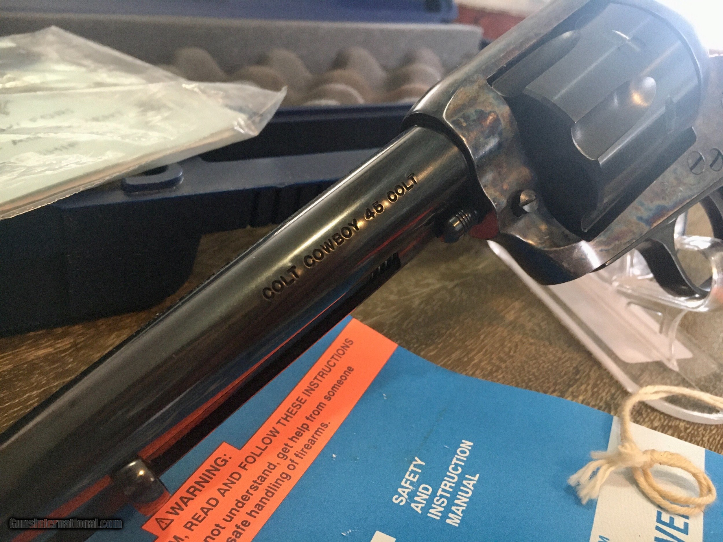 Description: Colt Cowboy model with the transfer bar hammer. Blue and color case hardened with a 5 1/2 barrel in .45LC. Includes factory box and papers. SOLD Handgun Caliber: .45 Colt Manufacturer: Colt |