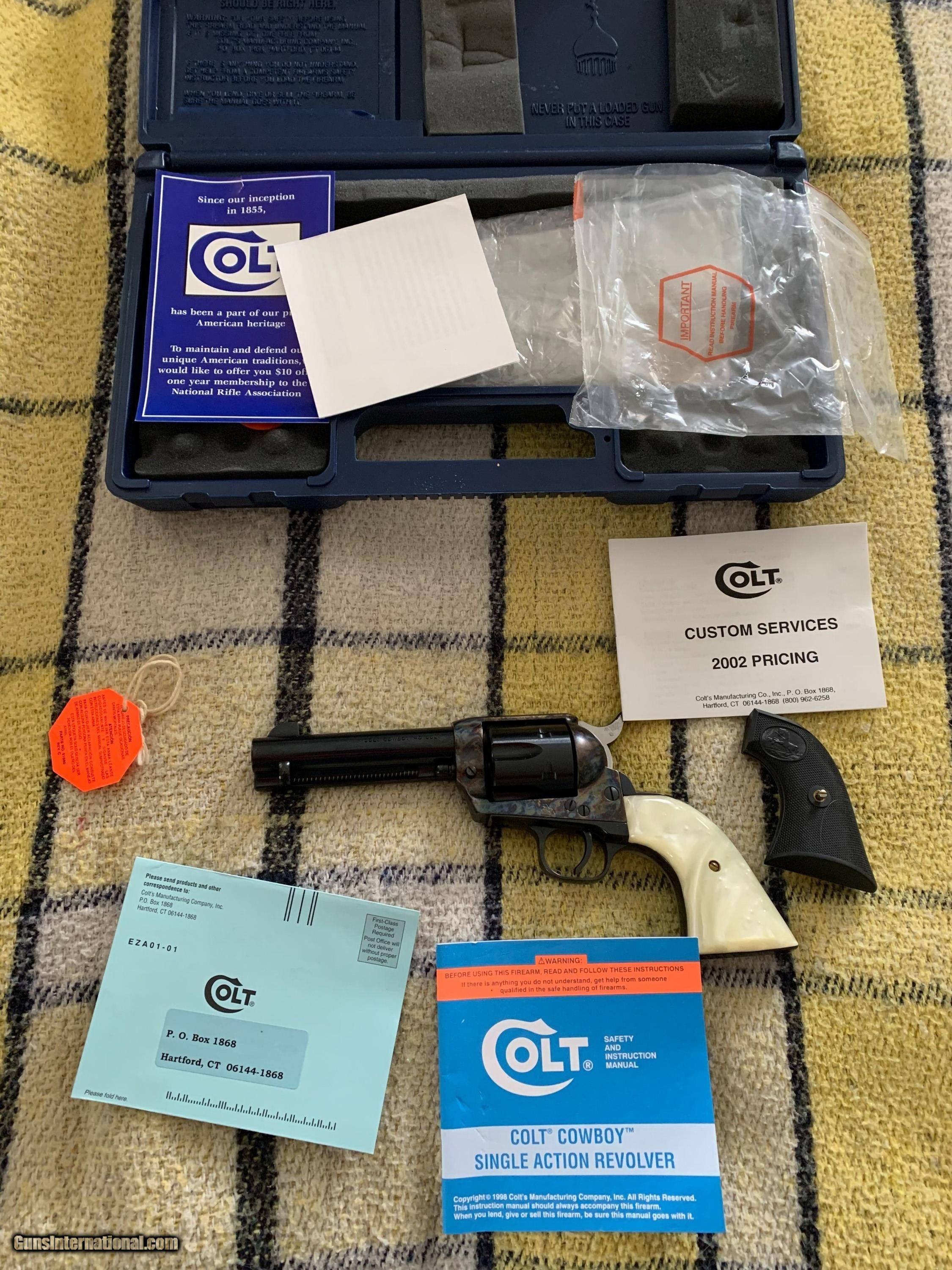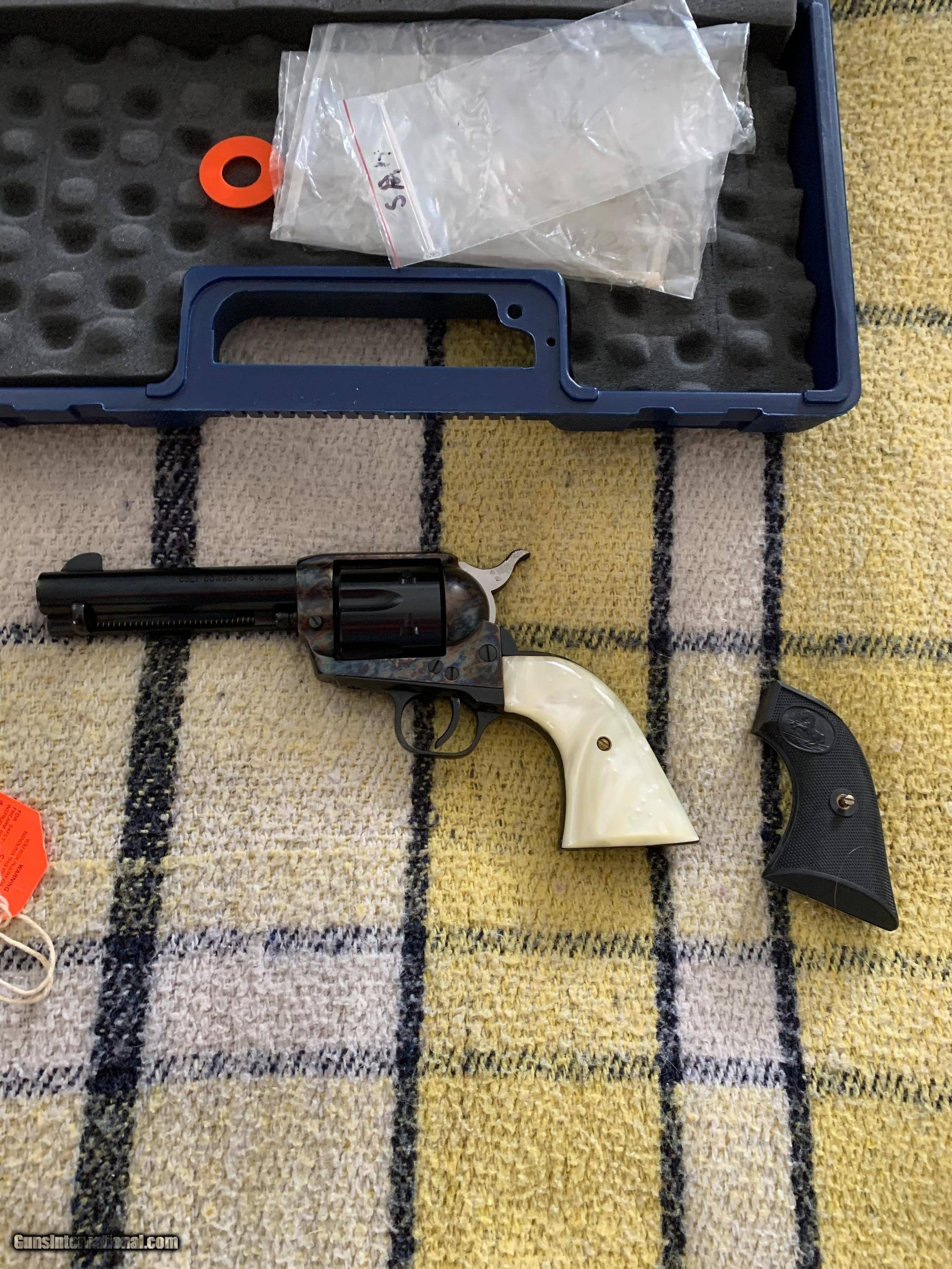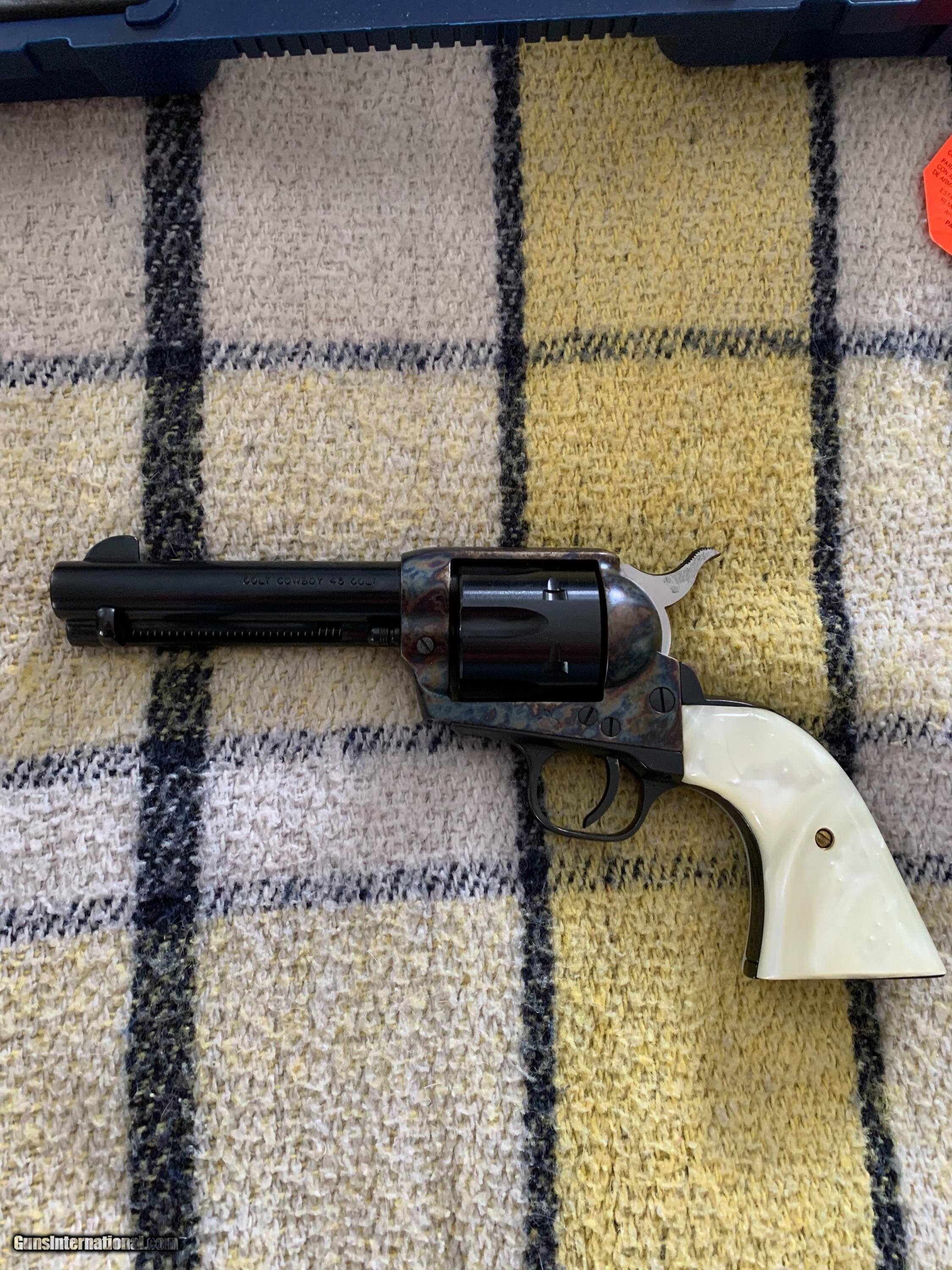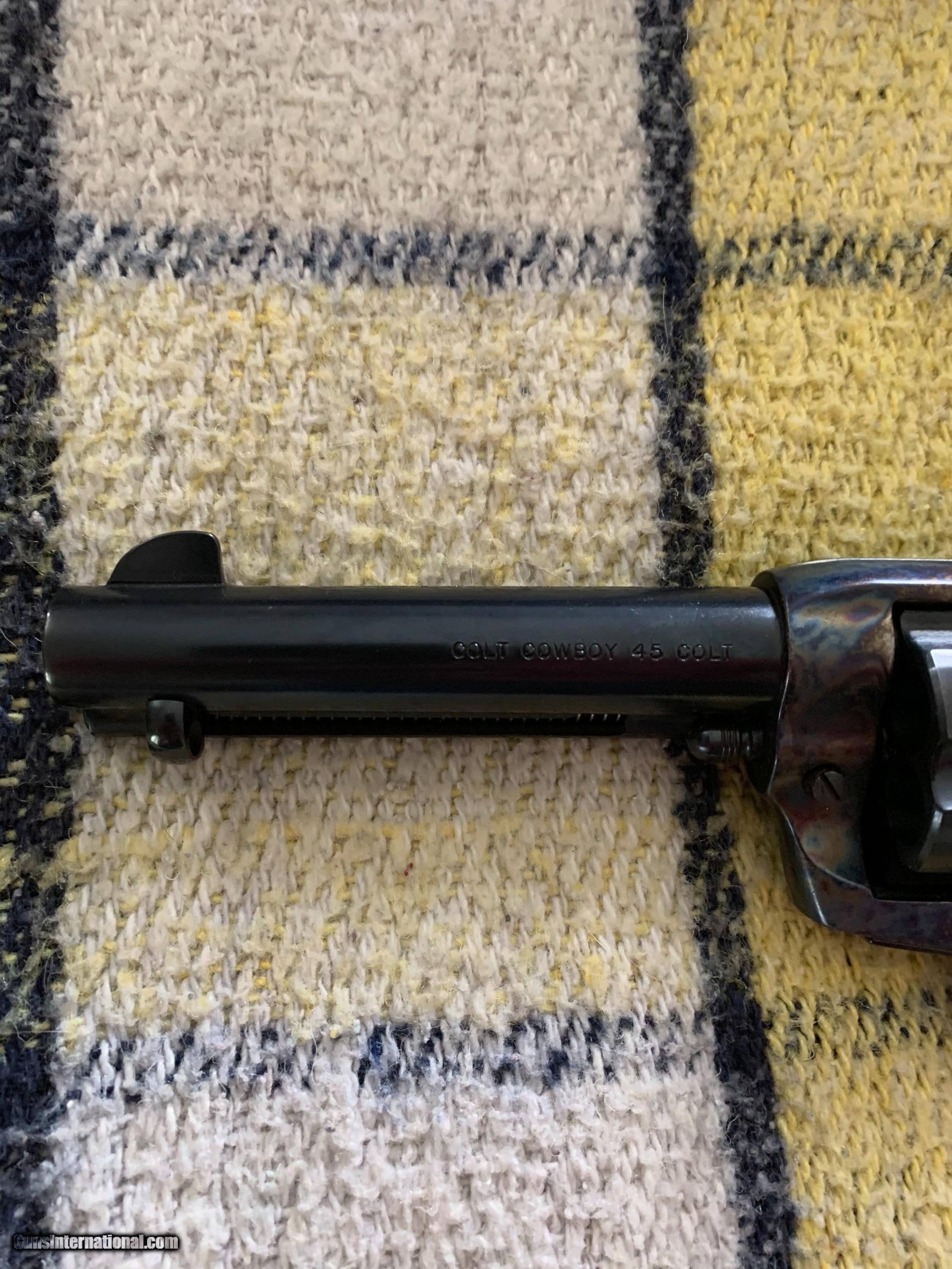 Description: Up for grabs today is the historic COLT COWBOY!! The Colt Cowboy is Colt's latest line of single action revolvers. This beauty comes in the extremely sought after 45 Colt caliber in the highly desirable 4 3/4" barrel! She also comes with an extra set of very fancy faux ivory grips that match the gun perfectly. This offering is 100% complete with original box numbered to the gun, all paperwork, and hangtag. The condition of this beauty is almost mint with only a spot or two of freckling/handling marks. There is no muzzle or holster wear, those are just reflections from the camera. Review the detailed pictures as they are your best description. Don't let this one pass you by! SOLD Handgun Caliber: .357 Magnum Manufacturer: Colt Model: Cowboy Barrel Length: 4 3/4 |
