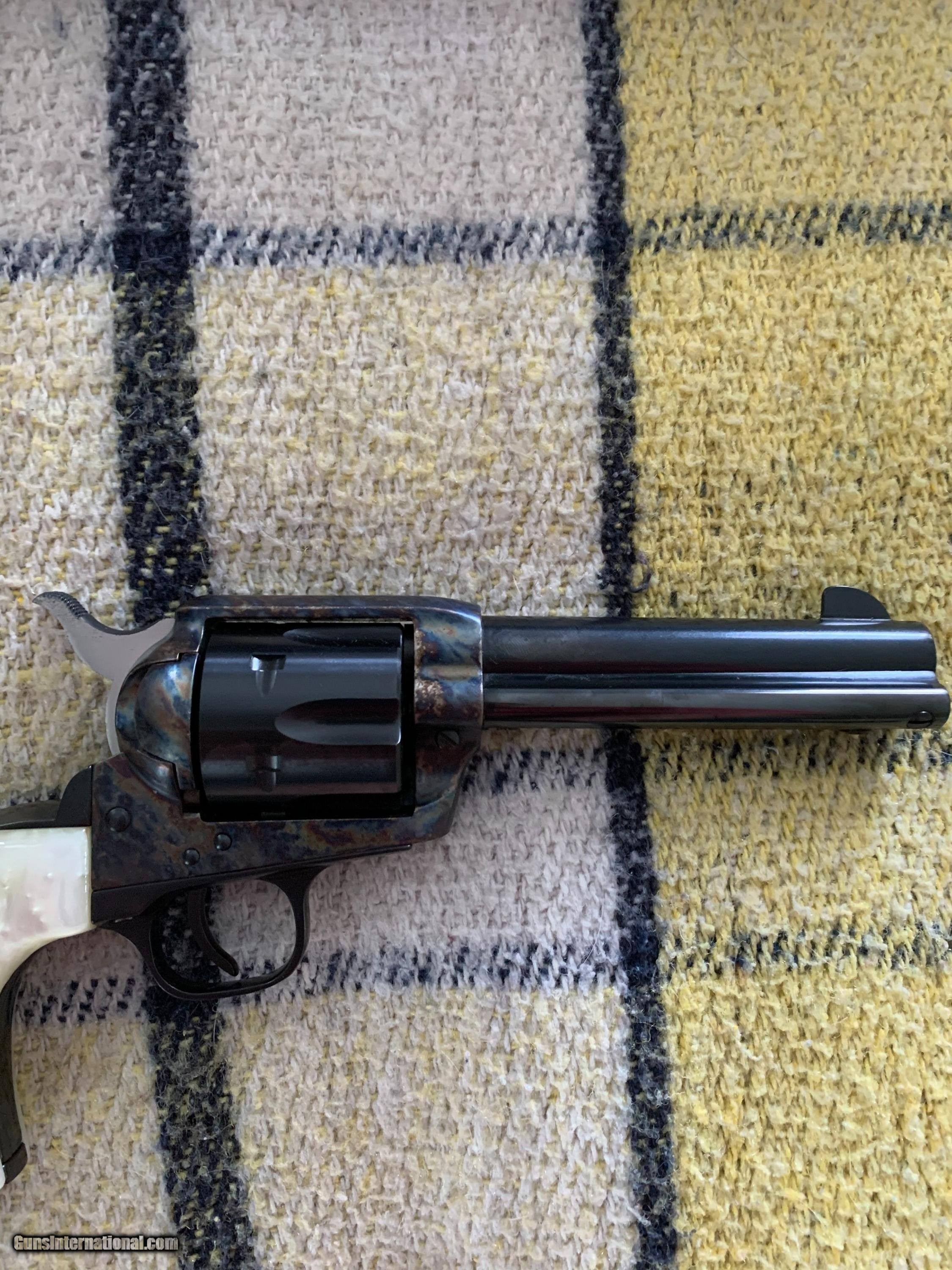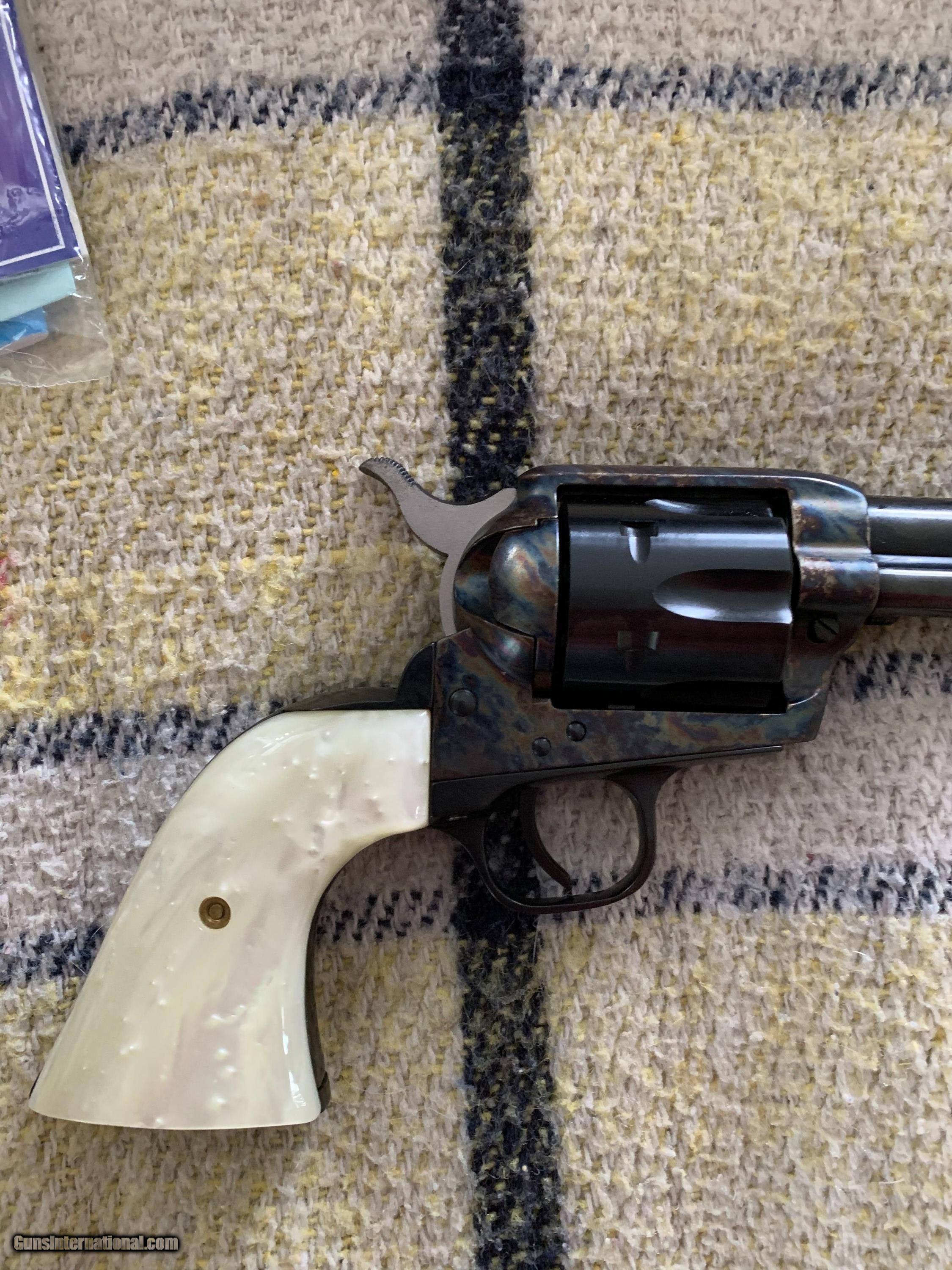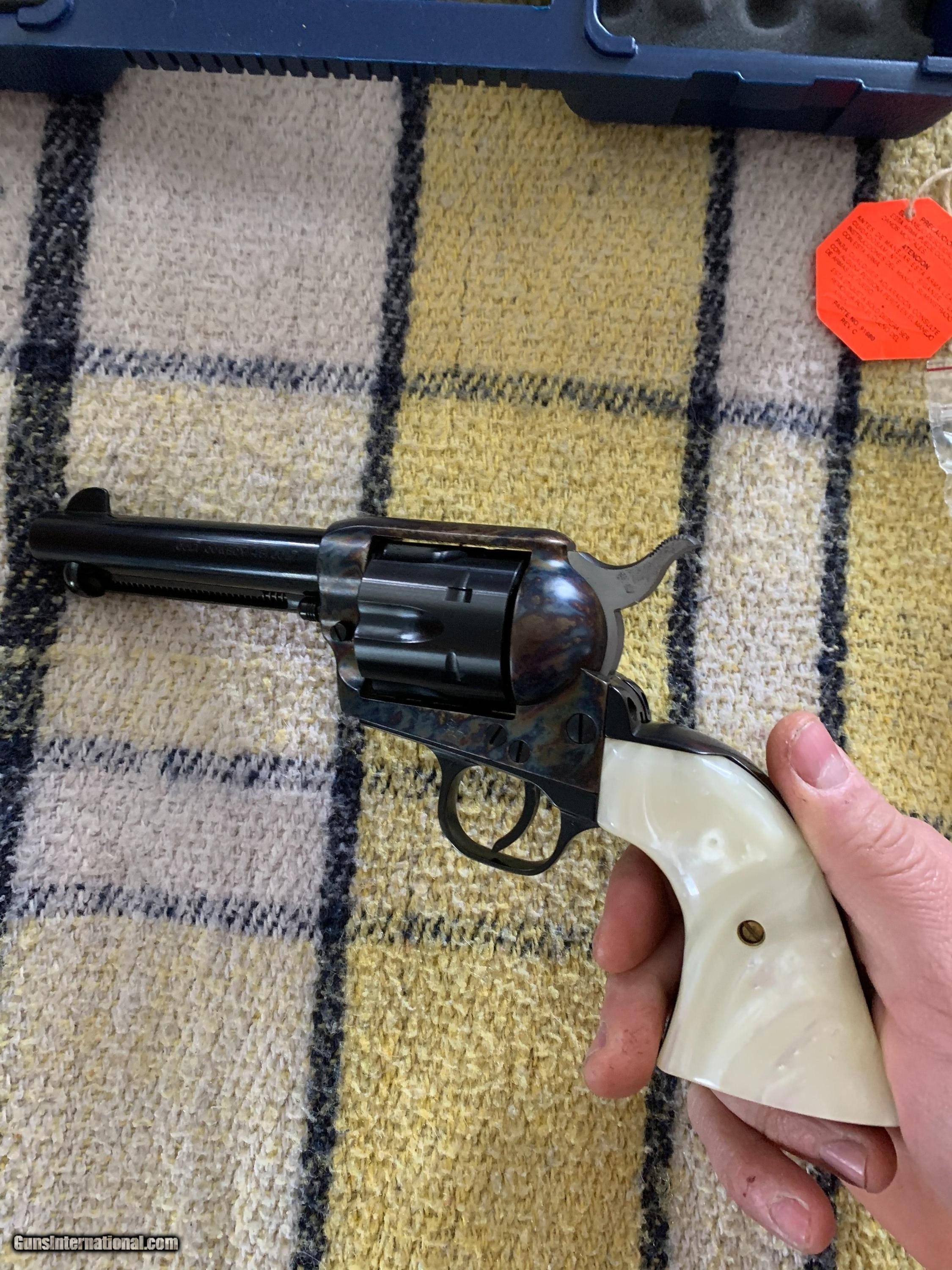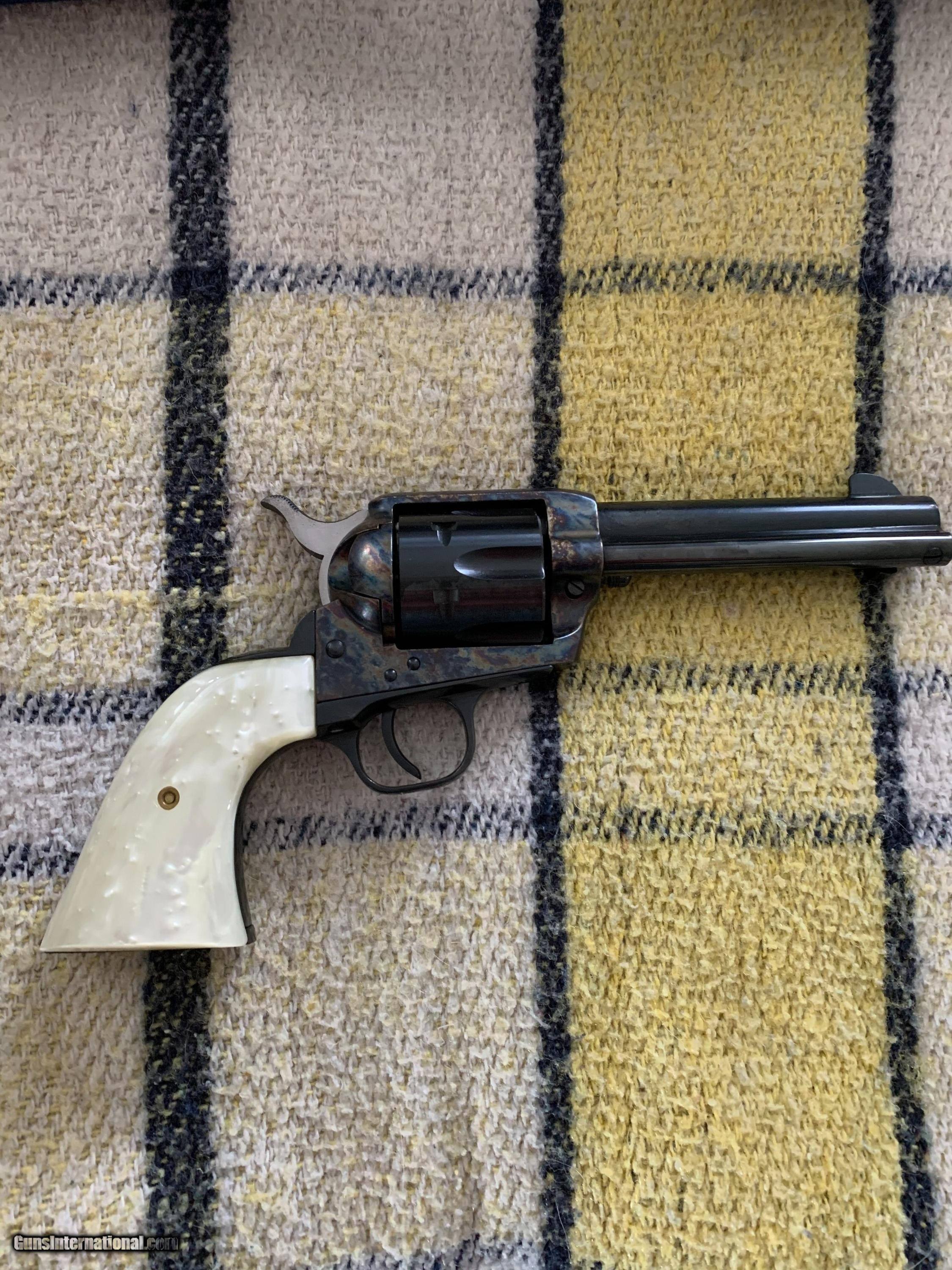 Description: Up for grabs today is the historic COLT COWBOY!! The Colt Cowboy is Colt's latest line of single action revolvers. This beauty comes in the extremely sought after 45 Colt caliber in the highly desirable 4 3/4" barrel! She also comes with an extra set of very fancy faux ivory grips that match the gun perfectly. This offering is 100% complete with original box numbered to the gun, all paperwork, and hangtag. The condition of this beauty is almost mint with only a spot or two of freckling/handling marks. There is no muzzle or holster wear, those are just reflections from the camera. Review the detailed pictures as they are your best description. Don't let this one pass you by! SOLD Handgun Caliber: .357 Magnum Manufacturer: Colt Model: Cowboy Barrel Length: 4 3/4 |
