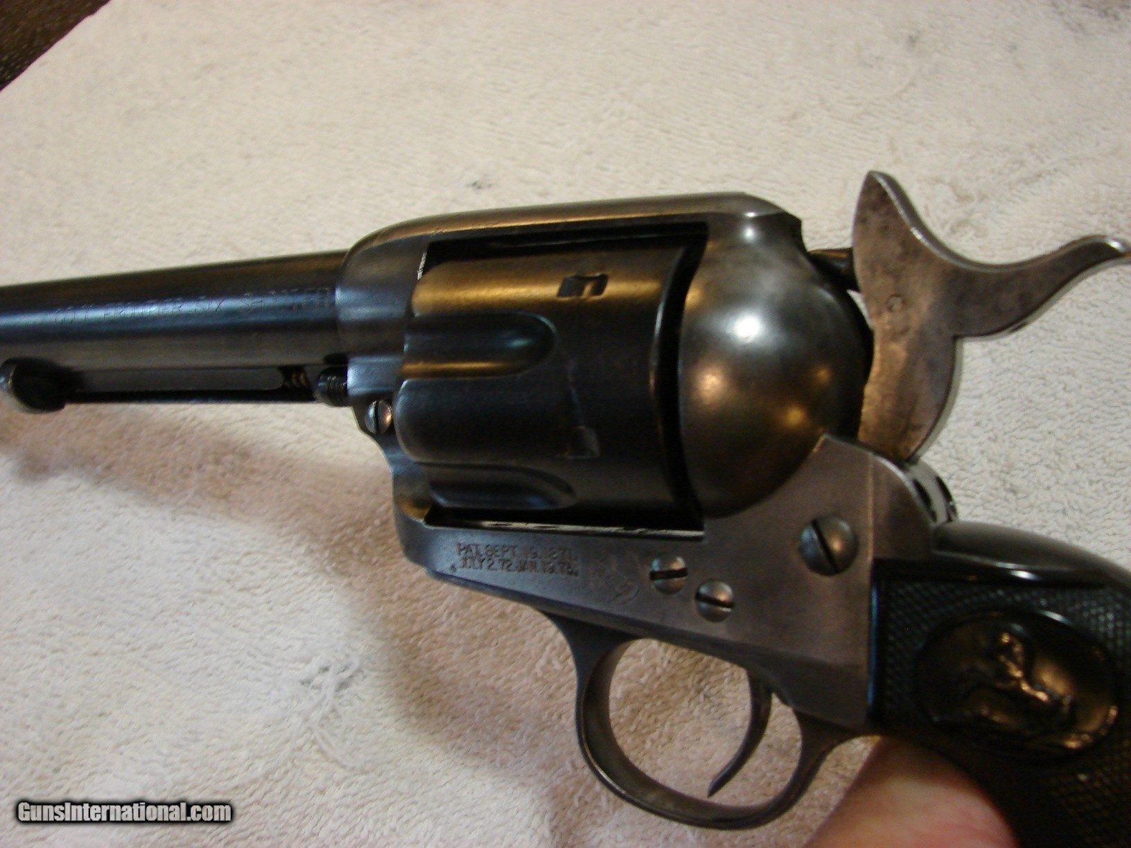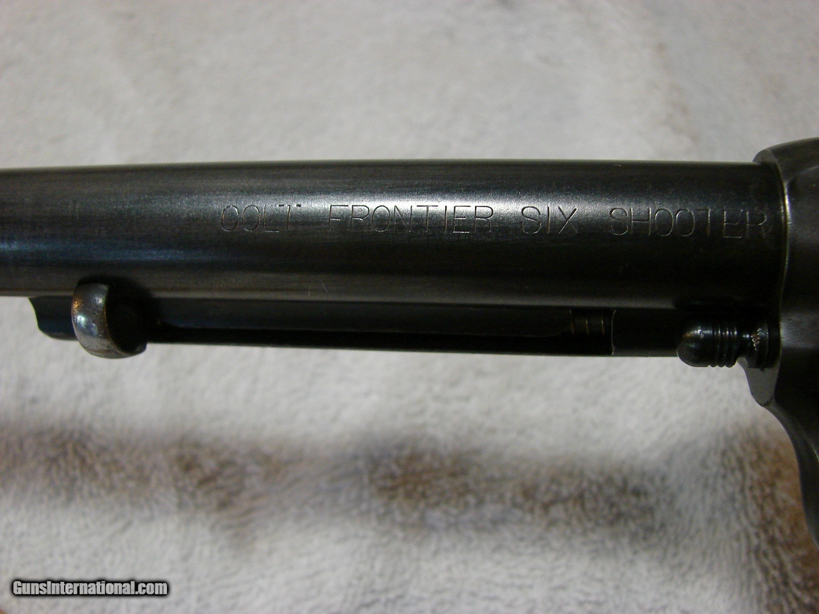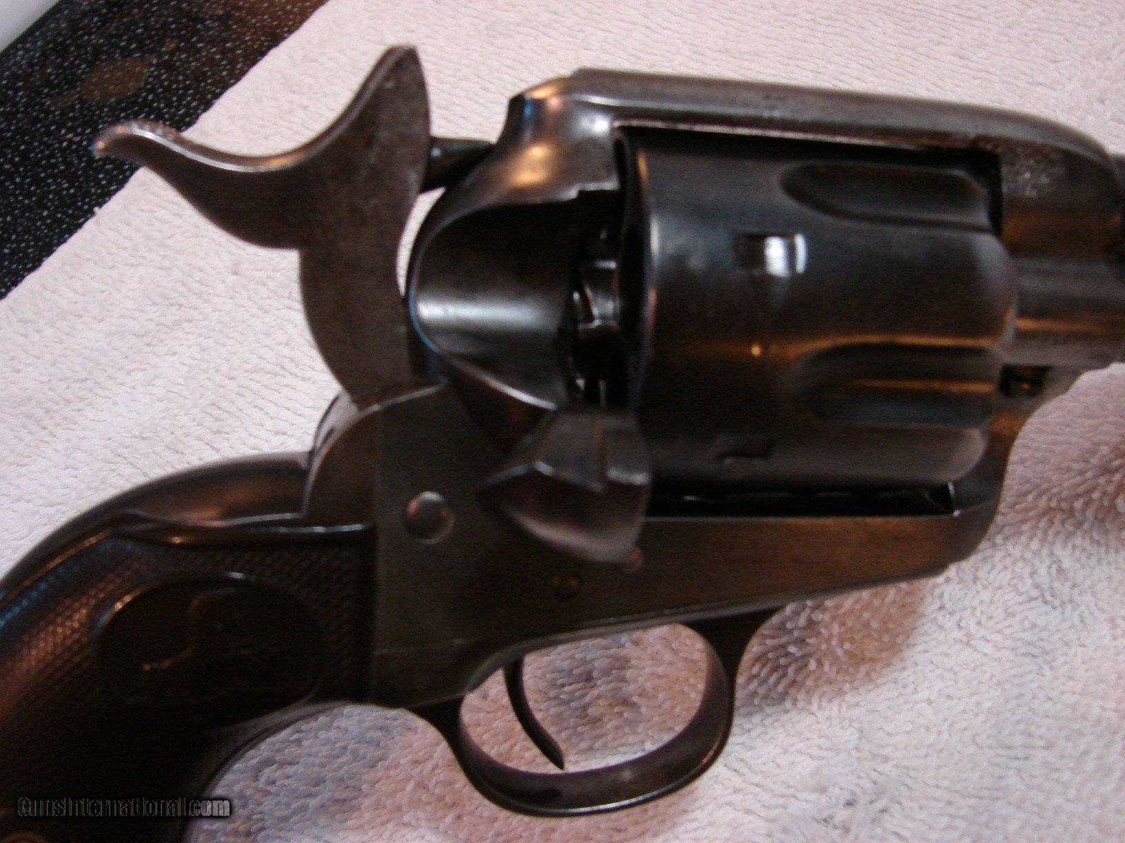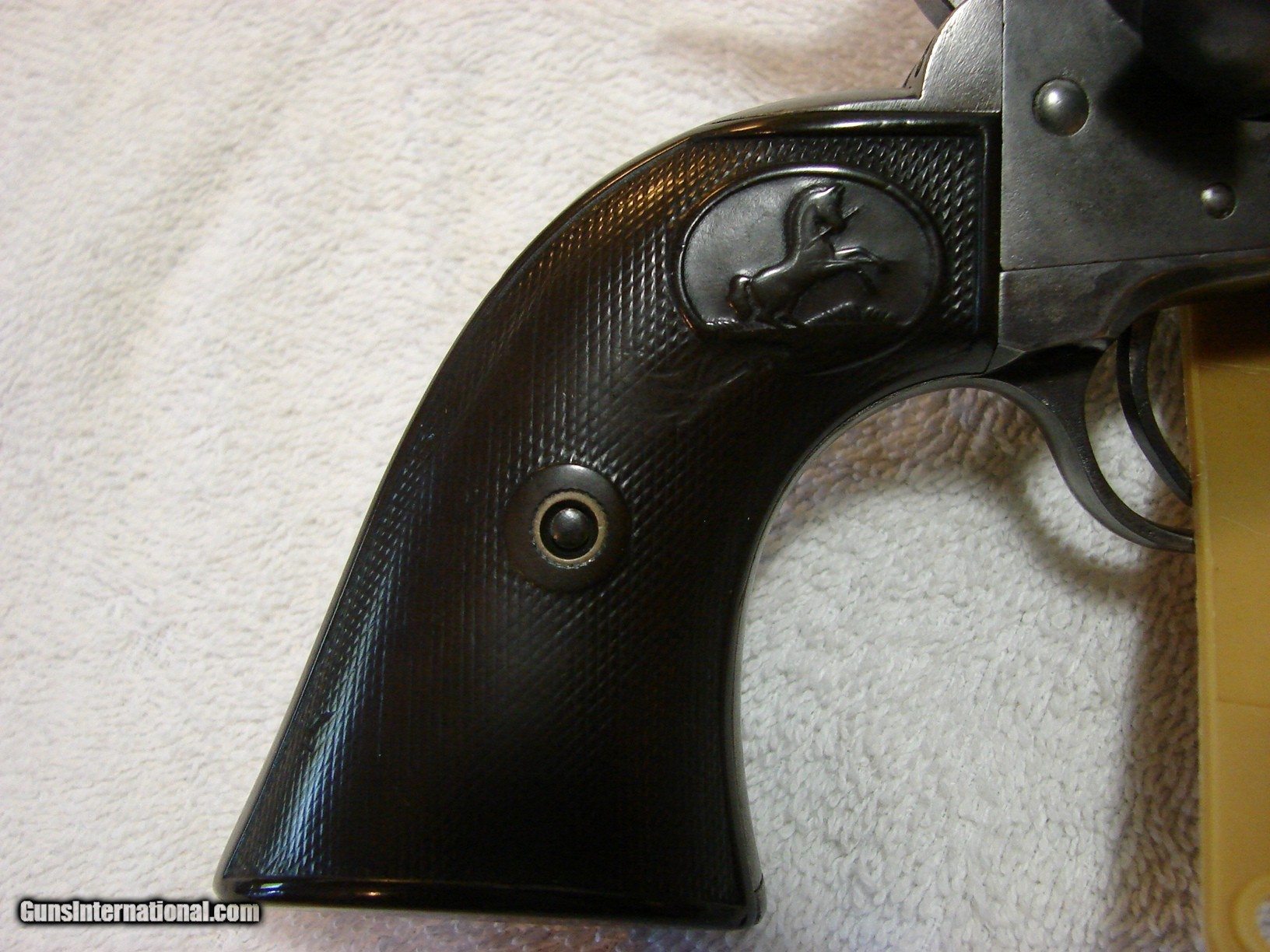 Description: 7-1/2 inch barrel chambered in 44-40 caliber with a good bore showing just some light pitting. Overall metal is mostly a grey color. Left side of barrel is marked "Colt Frontier Six Shooter" and the top has the Hartford CT address. The Rampant Colt emblem is strong on left side of the frame. Hard rubber grips also have the Rampant Colt emblem on each side. Grips show some wear but in good condition. This 1st Gen is in good mechanical condition. All four clicks present when cocking. Approximate Manufacture Date 1907. SOLD Handgun Caliber: .44-40 Winchester (.44 WCF) |