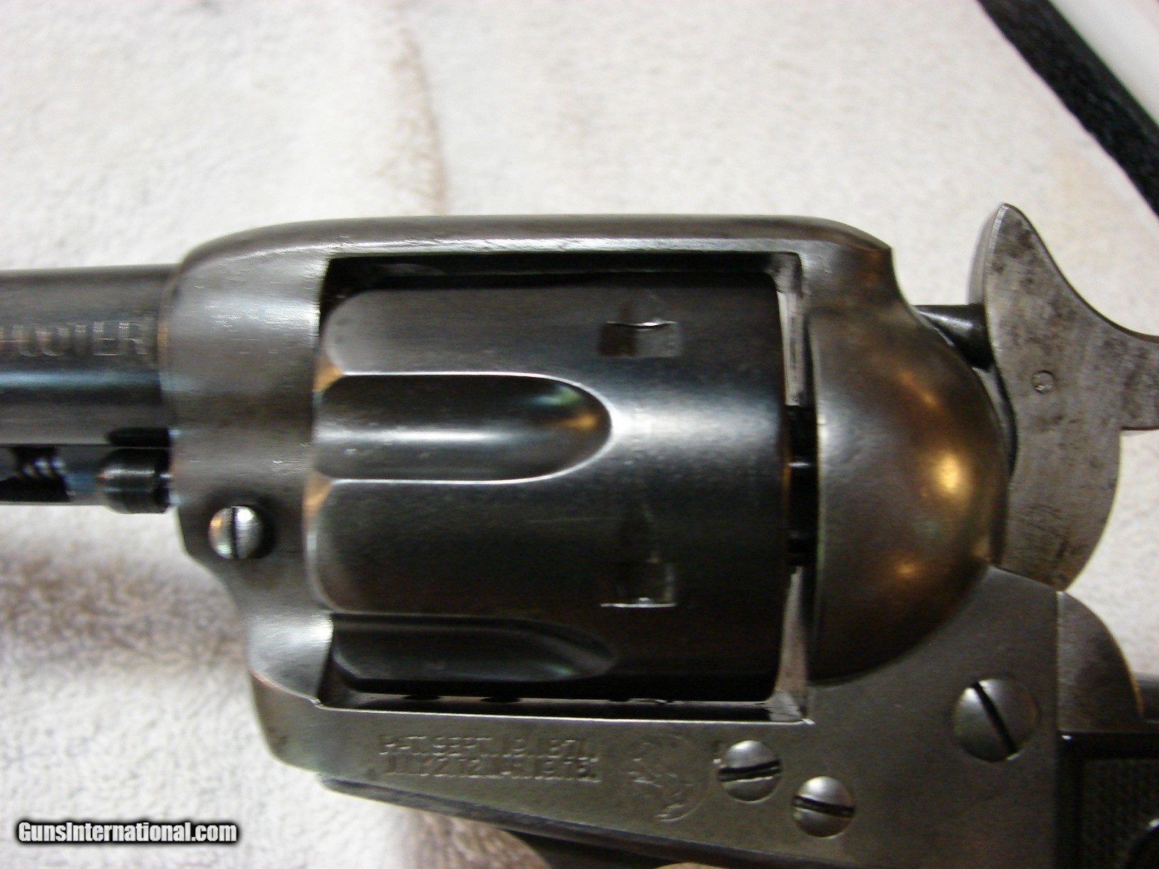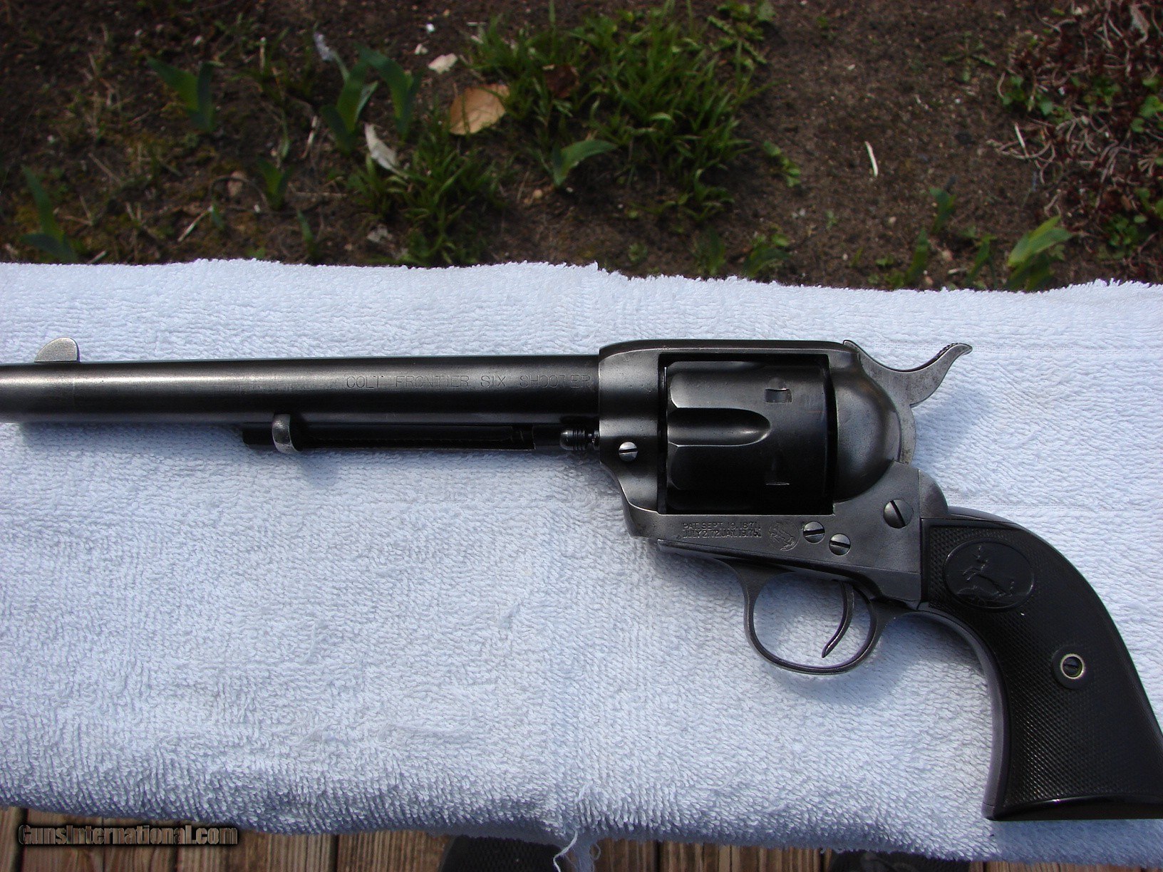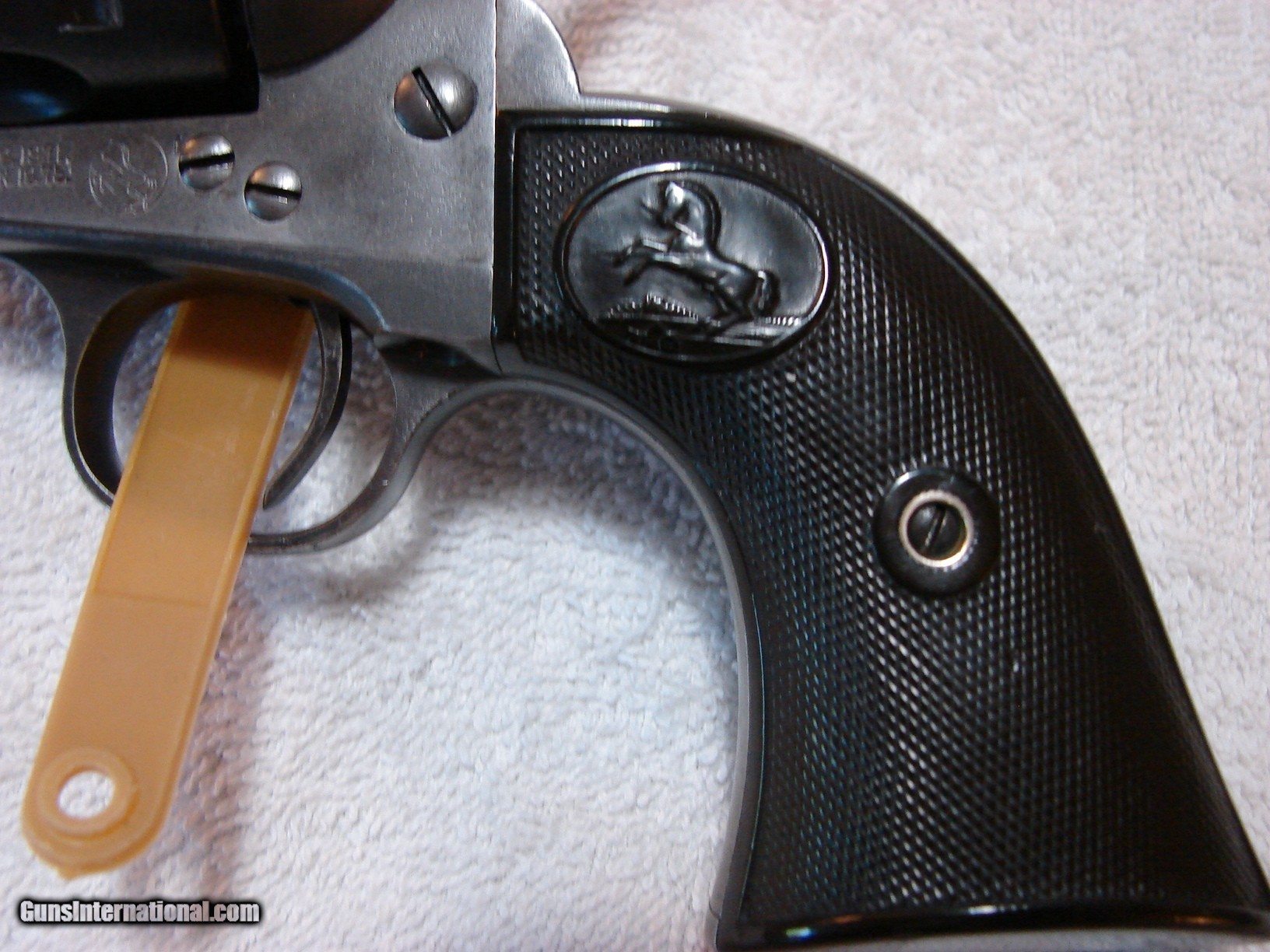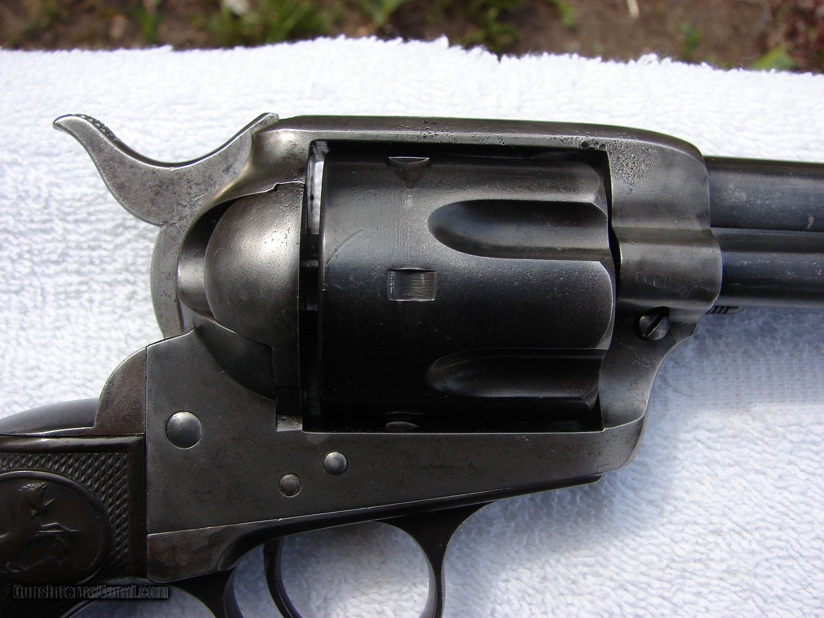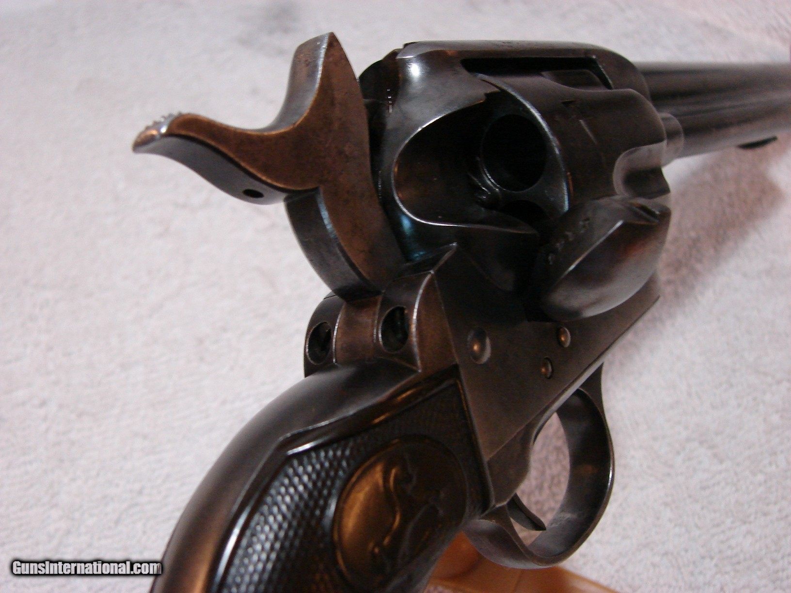 Description: 7-1/2 inch barrel chambered in 44-40 caliber with a good bore showing just some light pitting. Overall metal is mostly a grey color. Left side of barrel is marked "Colt Frontier Six Shooter" and the top has the Hartford CT address. The Rampant Colt emblem is strong on left side of the frame. Hard rubber grips also have the Rampant Colt emblem on each side. Grips show some wear but in good condition. This 1st Gen is in good mechanical condition. All four clicks present when cocking. Approximate Manufacture Date 1907. SOLD Handgun Caliber: .44-40 Winchester (.44 WCF) |