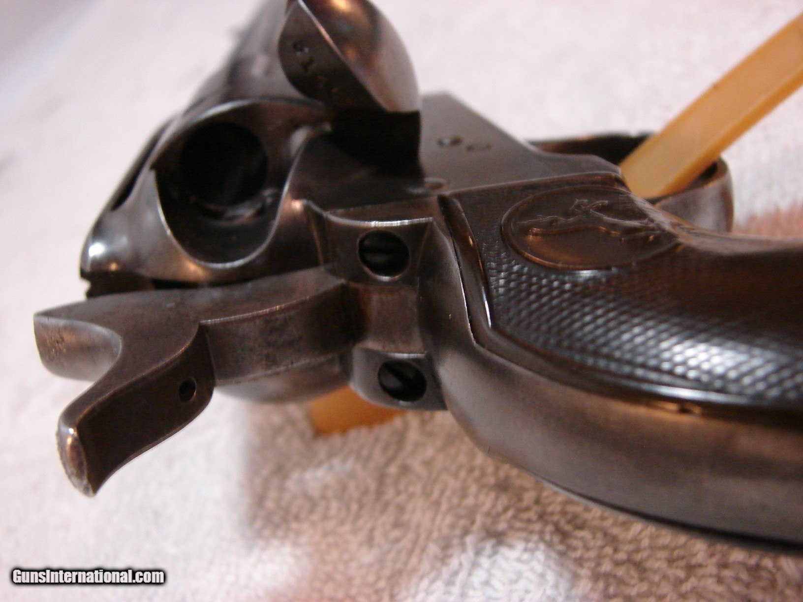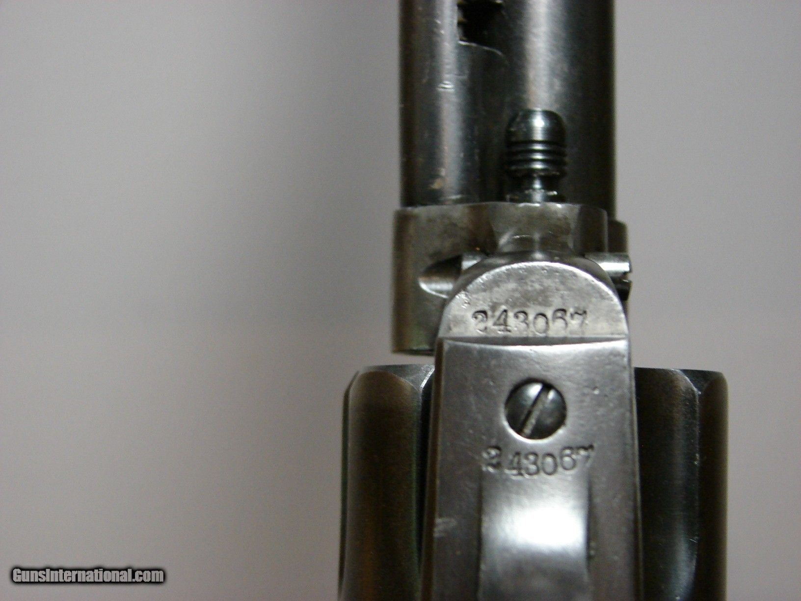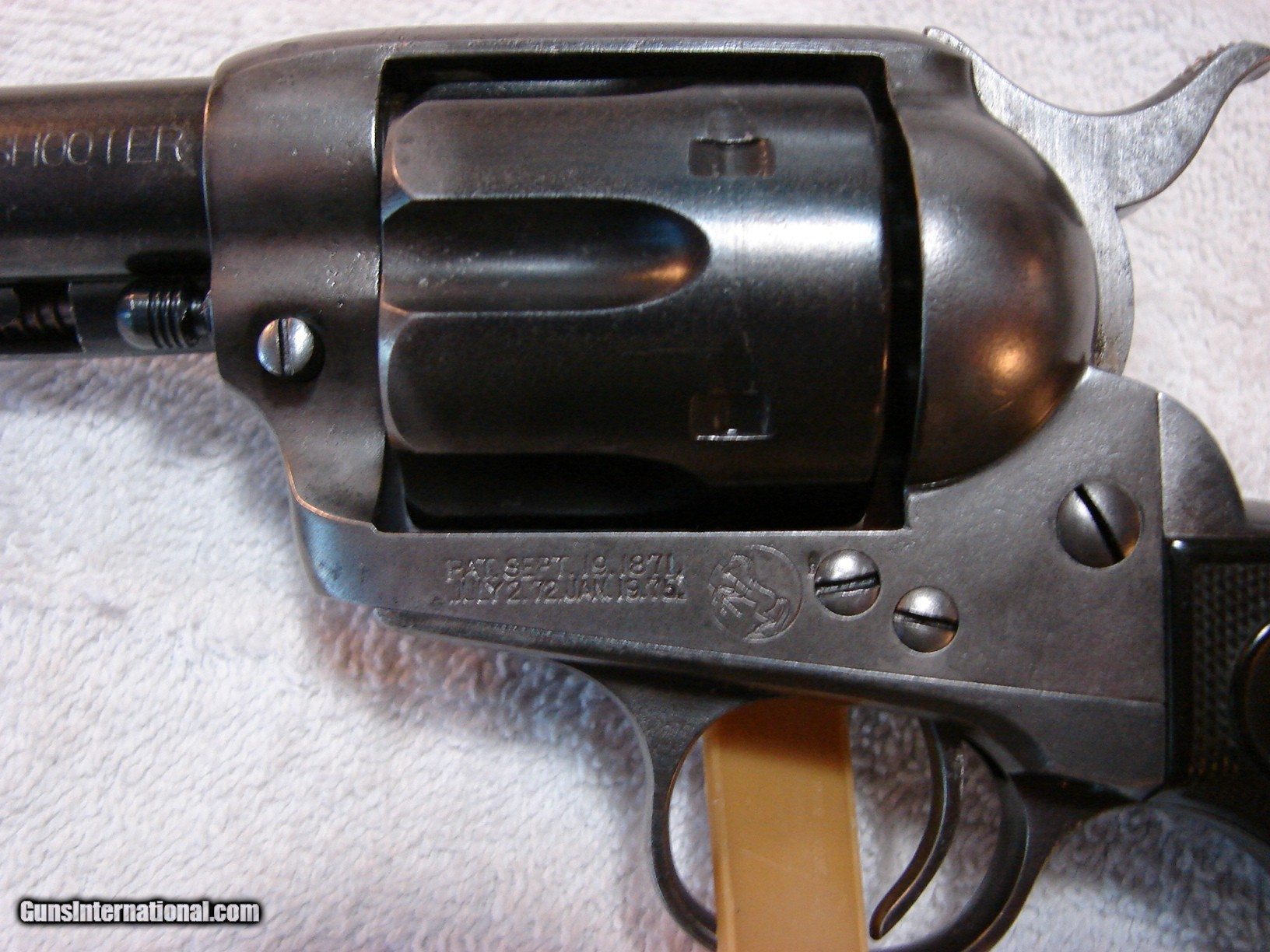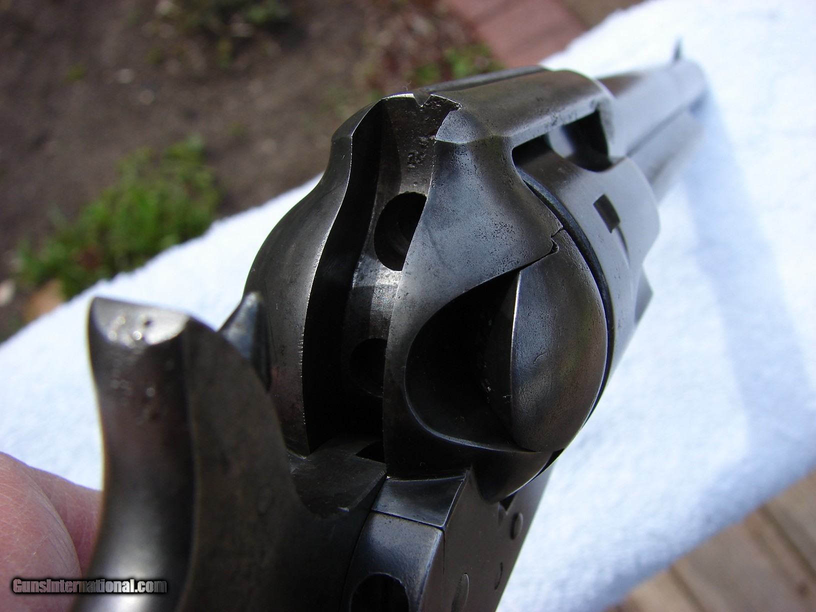 Description: 7-1/2 inch barrel chambered in 44-40 caliber with a good bore showing just some light pitting. Overall metal is mostly a grey color. Left side of barrel is marked "Colt Frontier Six Shooter" and the top has the Hartford CT address. The Rampant Colt emblem is strong on left side of the frame. Hard rubber grips also have the Rampant Colt emblem on each side. Grips show some wear but in good condition. This 1st Gen is in good mechanical condition. All four clicks present when cocking. Approximate Manufacture Date 1907. SOLD Handgun Caliber: .44-40 Winchester (.44 WCF) |