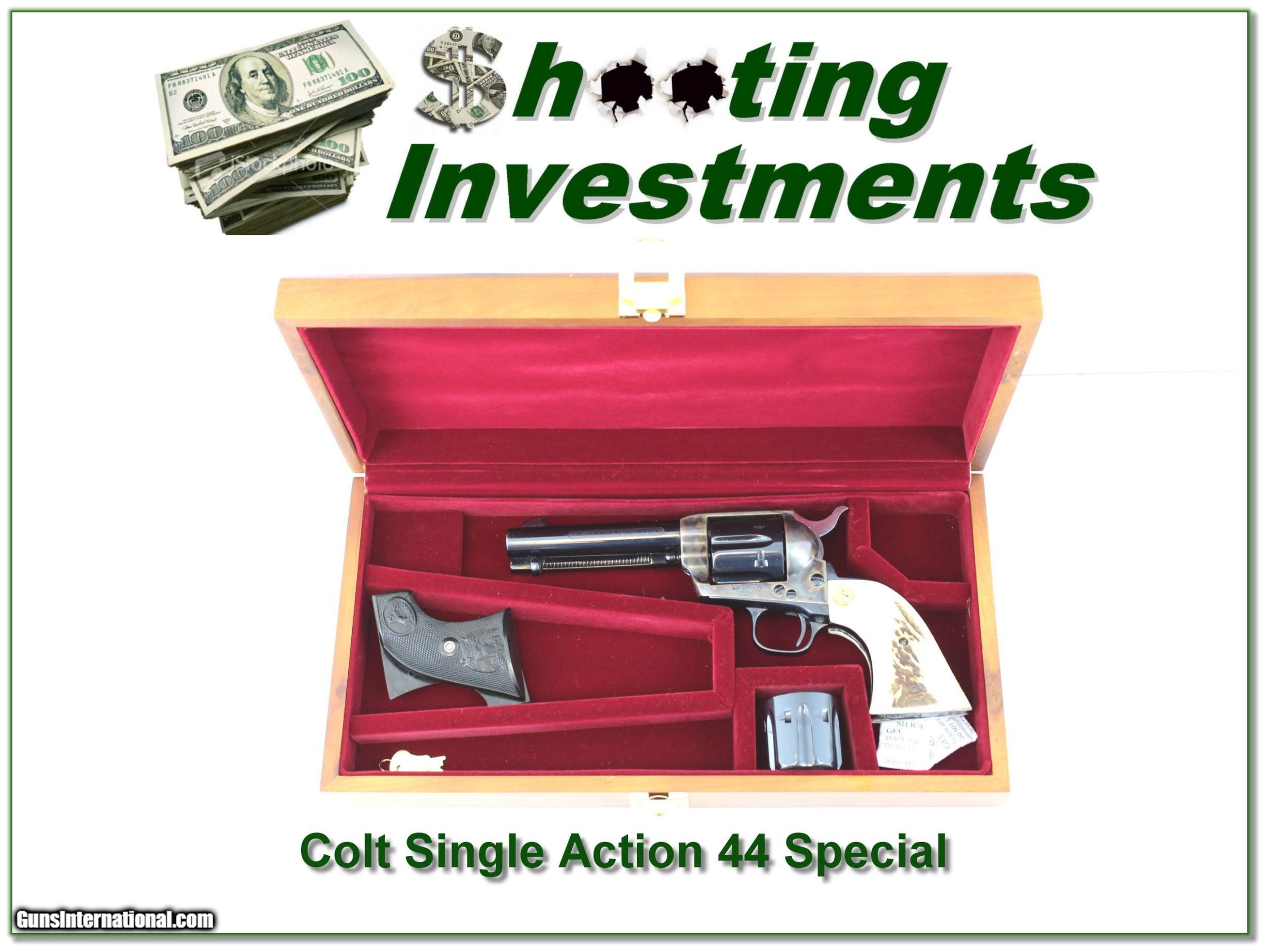 Description: This is a Single Action Colt “Frontier Six Shooter”. It has both 44-40 and 44 Special cylinder and comes unfired in display case as seen. It has both Horn and original black Colt grips. The barrel is 4.74in and the case colors are beautiful. They just don’t make them like they used too! I am selling this one on consignment and as such lay-a-way can’t be used. It does of course have the standard 3-day inspection. Shipping and insurance is $59. Please email me with any questions or larger pictures. (Consign your quality firearms with Shooting Investments for only 12%! Let me know if you have any you would like to sell!) 20-0156 Payment: Payment is by Money Order, Cashiers Check or Personal Check. I can now also accept MasterCard and Visa with a 3% convenience fee. PayPal can be used for some items but never firearms. Please let us know if you would like to pay via PayPal. Shipping: The shipping charge will be listed in each description. It is $39 for most long guns and $29 for most handguns. Some heavy guns or those insured for over $2000 will be higher. Shipments to Alaska and Hawaii are higher because air shipment is required. Most firearms are shipped on Tuesday and Thursday and usually in 5 days of receipt of payment. We package all shipments carefully and insure them. For long guns you can purchase a new Plano case for $19. They now cost us $22 when buying 100 at a time. Optics are shipped Priority Mail and most other non-firearm shipments are shipped First Class. Returns: Our return policy is simple. If for any reason you are not pleased with your purchase, you may return your item for a full refund of purchase price. Ammunition cannot be returned. It is important to us that you are happy. Guns cannot be fired or dissembled before returning them and they must be returned in the same condition as received. Notification of a return must occur with-in 3 days of receipt at your dealer. Shipping, convenience and dealer fees are not refundable and are the responsibility of the buyer. Lay-a-way: If needed, we offer a 60 day lay-a-way option on most firearms. It is 1/3 now, 1/3 in 30 days and 1/3 in 60 days. Lay-a-way firearm sales are final and if not completed the first payment cannot be returned. Consigning your firearms with Shooting Investments: We will help you get top dollar for your firearms. While most local guns shops charge 20% or more, our fee is only 12% with a minimum of $75. At your local gun shop it might take months to sell. Selling on-line provides instant access to thousands of interested buyers. You won’t find any other on-line dealer willing to sell your firearms for only 12% or listing every gun on 3 separate s. Selling through an House typically costs the seller 15% and the buyer an addition 15% (so 30%) and you have to wait several months to sell and longer to receive funds. If properly priced, we will sell your firearms in a few weeks. Send us an email or give us a call and we’ll explain how easy it is for you to get top dollar. Trading: Trading for use is really just buying your gun to re-sell. If you have a gun you want to trade, please email a picture and we will let you know what we can give or it. You will always get more if we sell it for you on consignment. Help for California Buyers: We are happy to ship to California. It is the buyer’s responsibility to make sure any item you buy is legal in your state. We are also happy to help with your purchase of a firearm from someone other than us. If you see a gun you would like to buy but the seller can’t or won’t ship to California they can ship to use and we’ll then ship it to your California dealer. The cost for this service is only $30 + shipping. Let us know if we can help! SOLD |