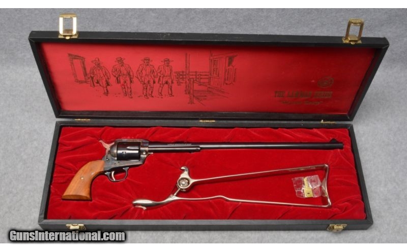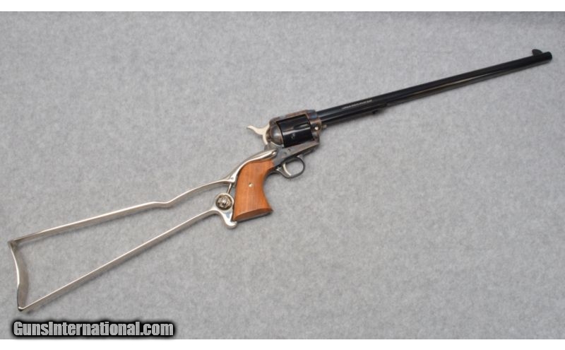 Description: 1970 Production, #409 of 500 With factory case and shoulder stock. SOLD Manufacturer: S/N - 409WYE Caliber Info: .45 LC Metal Condition: Like New Wood Condition: Like New Bore Condition: Like New Barrels: 16 Triggers: Factory Stock: Walnut Grips Weight: 50 oz Sights: Fixed Blade Front, Elevation Adjustable Rear Extras: With Factory Case. Item Location: Hazelwood, MO |