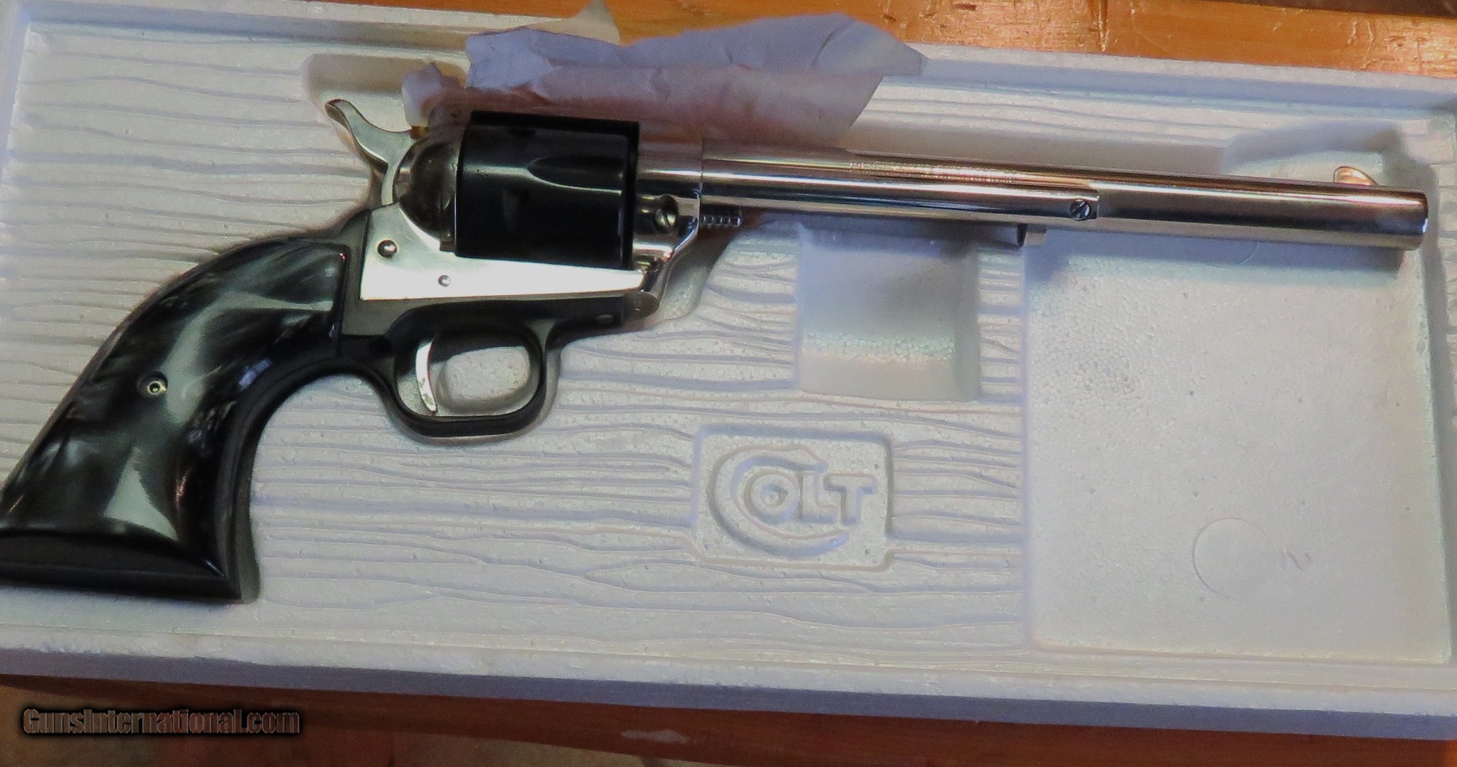 Description: Guns Listing ID: 466037 This listing is a Colt single action .22 RIGHT TO BEAR ARMS commemorative catalog # 8270. These revolvers are marked COLT PEACEMAKER .22 BUNTLINE on the right side of the 7 ½” barrel and THE RIGHT TO BEAR ARMS on the left side. This one is # 1317 of about 3000 made. It remains new UNFIRED AND UNTURNED in the original Colt stryofoam box with a walnut display case. The nickel plating is in factory new condition as is the display case. One end flap on the box has a small tear but still firmly attached. You have to see this gun to believe it!!! SOLD Manufacturer: COLT Model: PEACEMAKER Condition: Used - Non-Certified Barrels: 7.500 Gauge Info: .22 LR Finish: BLACK AND NICKEL |