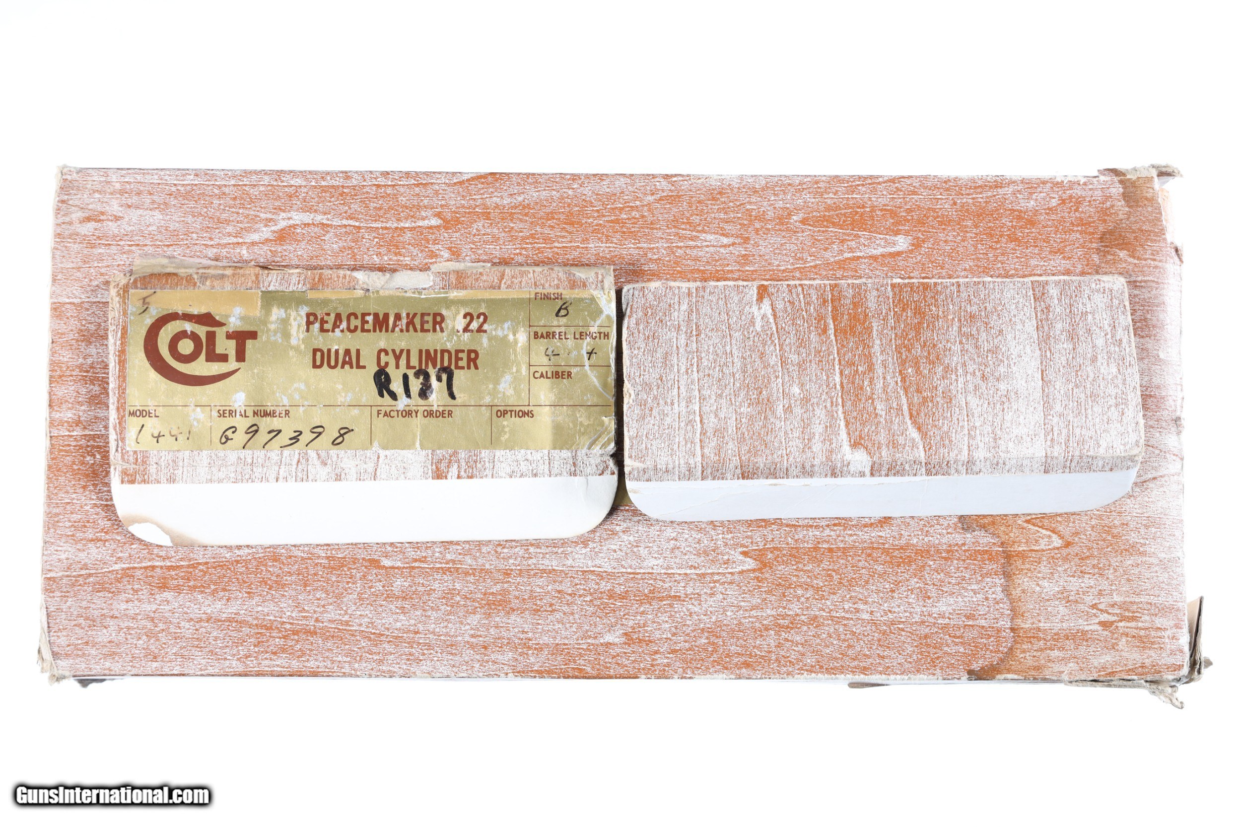 Description: Excellent plus overall condition, dual cylinder. Includes factory box (poor) numbered to gun. • Free Shipping, No Credit Card Fees. • Lay-a-way available for this firearm. • 1/3 Down, a 1/3 in 30 Days 1/3 in 60 Days. SOLD Manufacturer: Colt Model: Peacemaker Serial Number: G97398 Barrel Length: 4 3/8 |