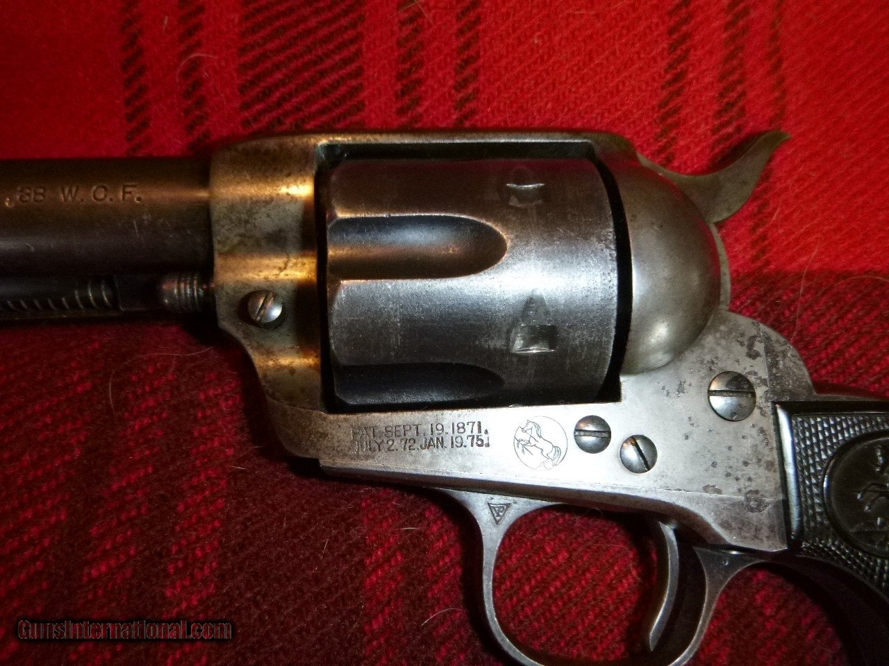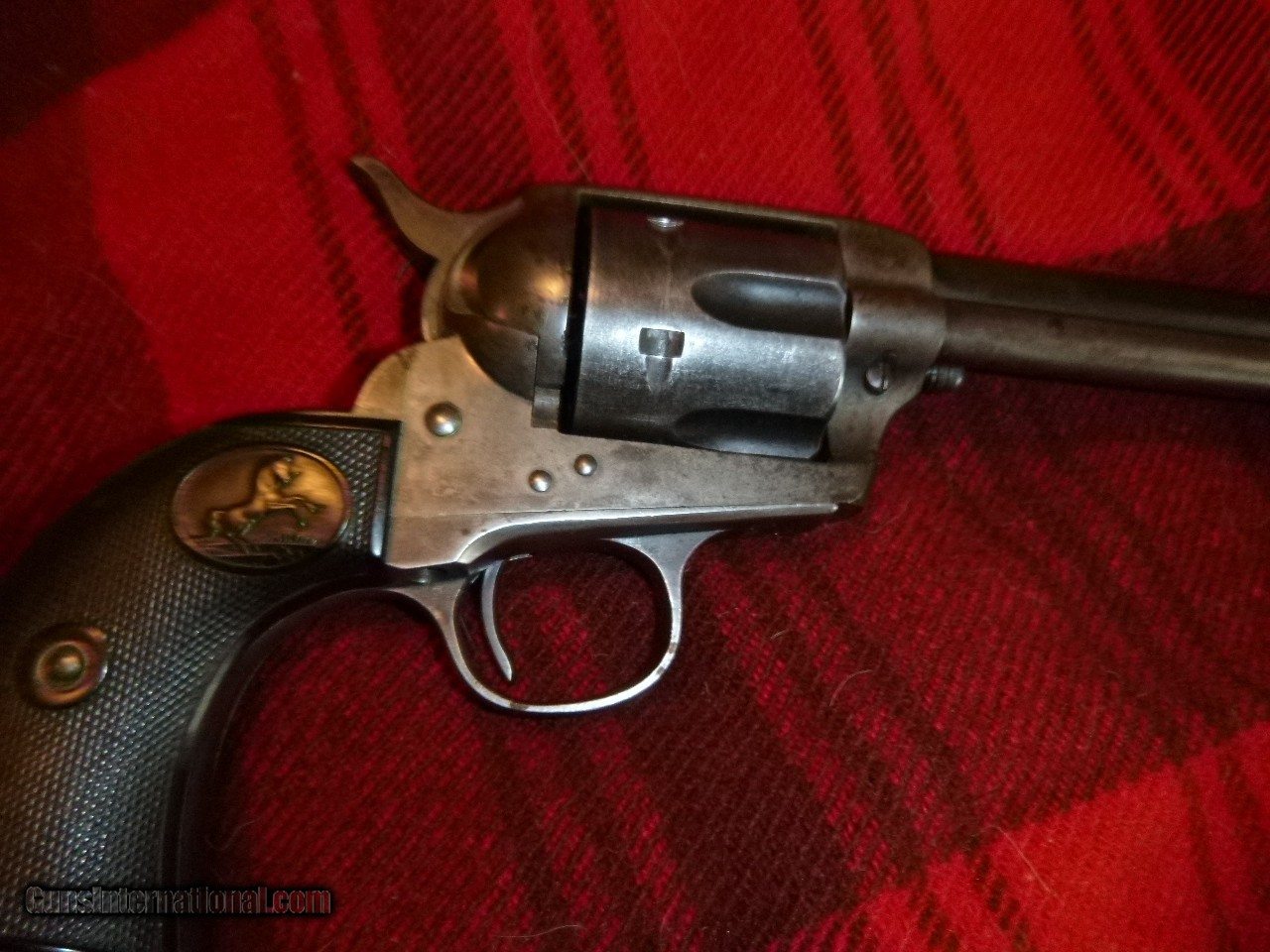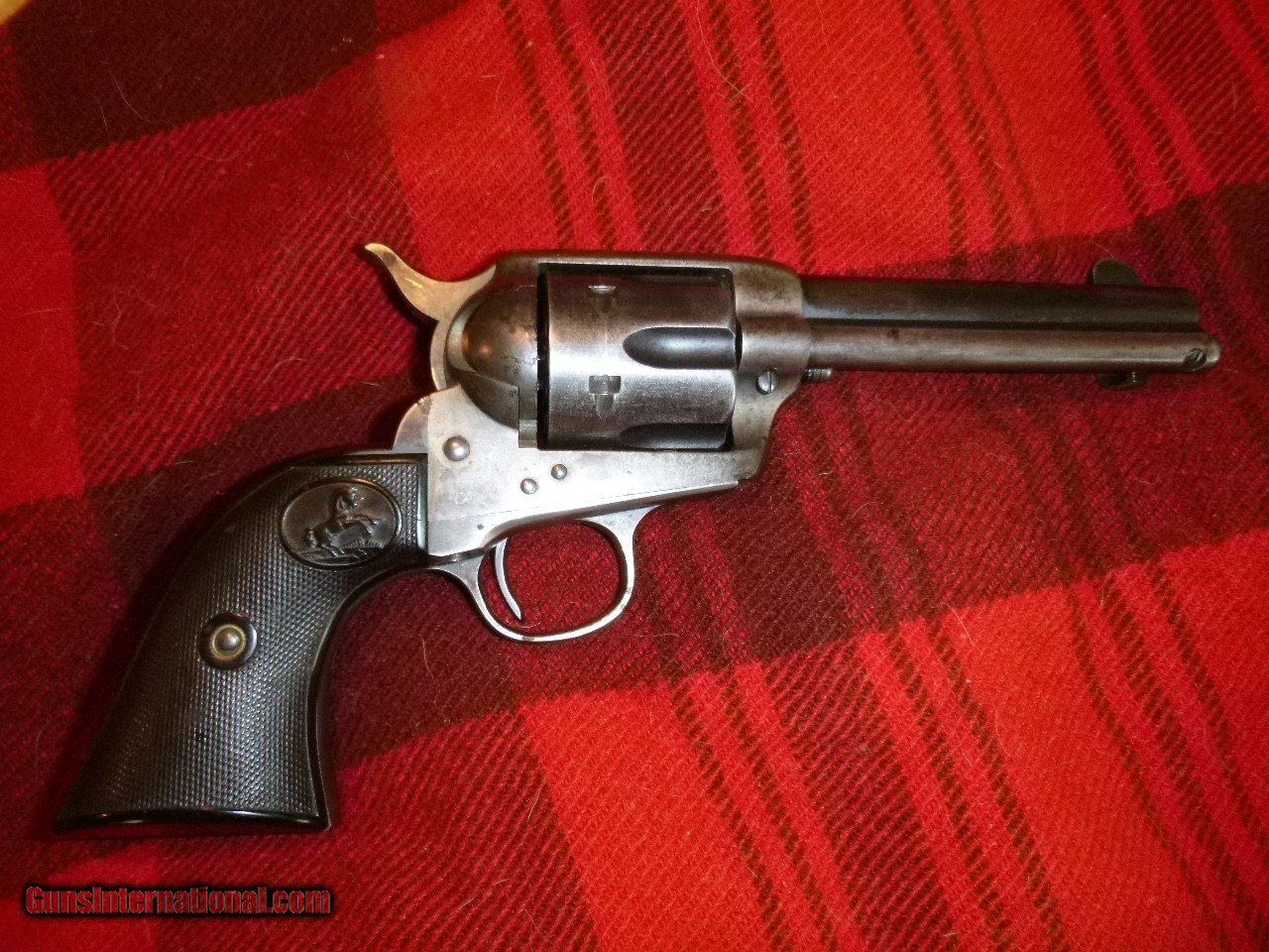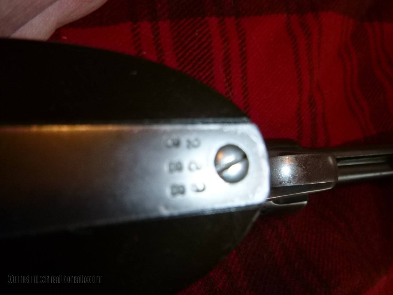 Description: Here is a nice 1905 single action. Gun has some blue in protected spots such as the barrel top of the backstrap but is basically a lowfinish gun that has been pretty well cared for. There is a little minor roughness on the left upper side of the grip (pictured). Action works well with tight lock up. Basepin bushing turns like it's supposed to. Good bore and rifling. Screwheads and lettering are excellent. Grips are in great shape and do include 3 tastefully done notches on the rear of the right grip that I"m sure represent the end of 3 very bad men. :) Or maybe just rattleesnakes. Shipping and insurance to your ffl or C&R included in the price. SOLD Curio/Relic: Yes Handgun Caliber: .38-40 Winchester (.38 WCF) Manufacturer: Colt Firearms Model: SAA Serial Number: 289xxx Barrel Length: 4&3/4 Condition: very good Metal Condition: very good Wood Condition: excellent Bore Condition: very good |