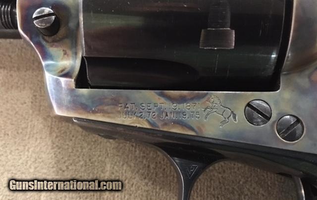 Description: PRICE REDUCTION SALE - This is a very unusual Colt SAA. It originally left the factory in 1917 as a 5.5 inch SAA. At some point in time it went back to Colt where it was updated, fitted with a factory Colt 12 inch Buntline barrel, updated with a 2nd gen hammer and cylinder, and refinished to factory specifications. This service was available from Colt on up through the 1960's. Regretfully, Colt does not maintain records on guns received back for custom work. But, the revolver bears the customary Colt rework markings. The revolver has 99% blue, 100% case colors, and an unusual pair of one piece grips (see photos) that appear to be rosewood, which are also 100%. Not a screw has been turned on this Colt since refinish by Colt. Hammer & cylinder were updated to 2nd Generation at time of Colt rework. Cylinder has only the faintest semblance of a line which does not go through the finish. In addition, this 12 inch Buntline was acquired and is sold with a period Arvo Ojala custom made Buntline holster. For those of you who are not familiar with Arvo Ojala please google him. He taught and furnished most of hollywood with fast draw instruction and supplied their guns and holsters. There was hardly a western that did not feature his holsters or an actor who had received his instruction. In the beginning of "Gunsmoke" it is actually Arvo Ojala (as a double to Matt Dillon) who draws and shoots the bad guy, and not James Arness. This revolver originally acquired with the Ojala custom holster, was probably intended for use by one of Hollywood's Western Actors, or may even have been used in one or more westerns of the time. The custom grip shape is a mystery, appearing to be for a left hand shooter, but may help in further research as to the origin or intended use for this outfit. Period Arvo Ojala holsters are also very much in demand. A wonderful 12 nch buntline Colt for the shooter or collector. SOLD Curio/Relic: Yes |