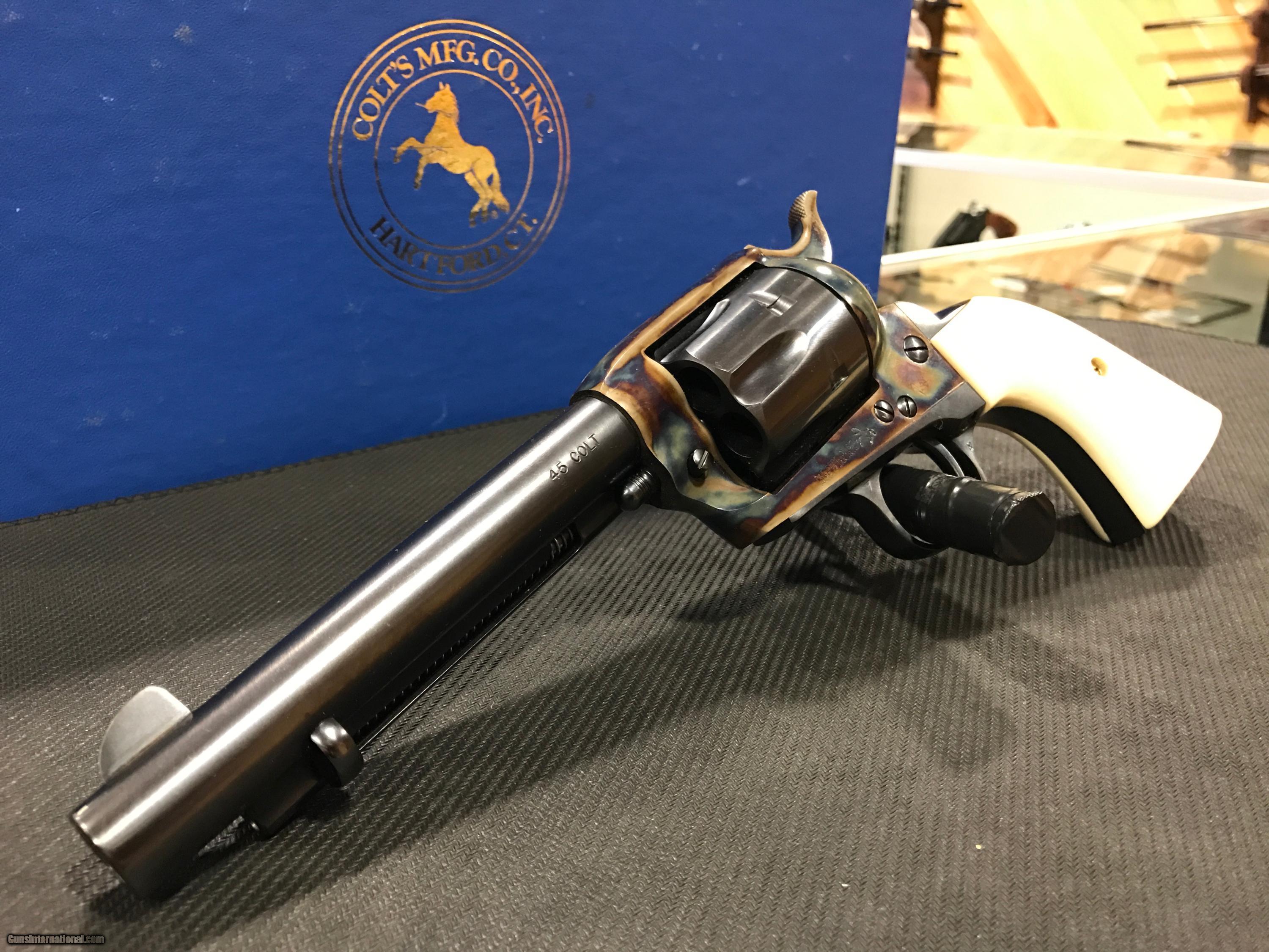 Description: ***UNFIRED COLT*** THIS IS AN ABSOLUTE BEAUTIFUL COLT SINGLE ACTION ARMY, 3RD GENERATION 45. THIS GUN IS IN IMACULATE CONDITION WITH A BEAUTIFUL CASE HARDENING FINISH. THIS GUN IS UNIFRED AND COMES WITH A COLLECTOR BOX WITH ALL PAPERWORK. THIS COLT ALSO COMES WITH AN EXTRA SET OF WOOD GRIPS. + $25.00 SHIPPING CHARGE ***SORRY, NO SALE TO CALIFORNIA*** SOLD |