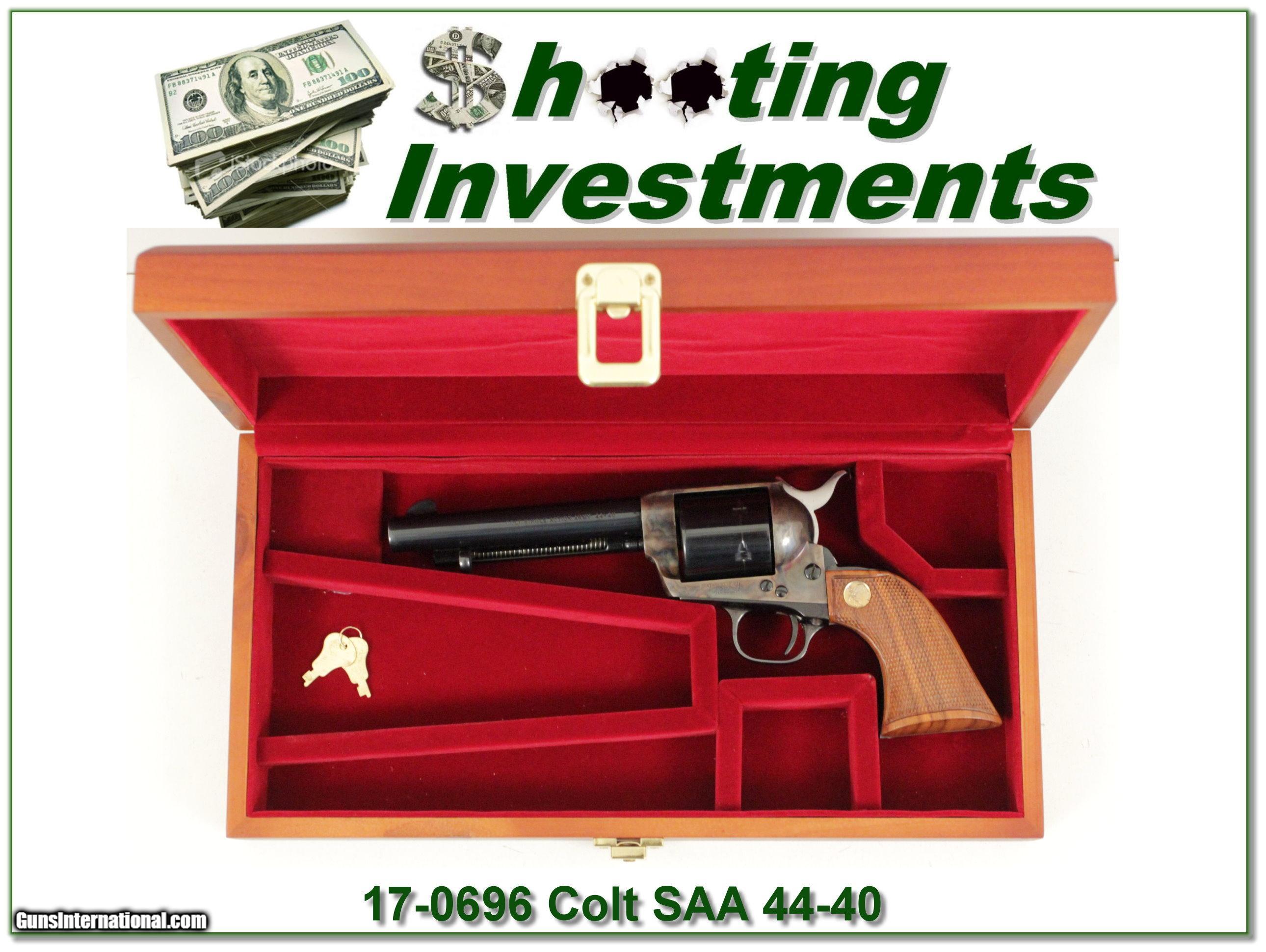 Description: Collectors, this is a beautiful Colt SAA 44-40. I believe it is a 1976 made gun and comes as shown with beautiful case color in display case with keys. I am selling this one on consignment and as such, lay-a-way can’t be used. It does of course have the standard 3-day inspection. Shipping and insurance is $45. Please email me with any questions or larger pictures. (Consign your quality firearms with Shooting Investments for only 10%! Let me know if you have any you would like to sell!) 17-0696 Payment: Payment is by Money Order, Cashiers Check or Personal Check. I can now also accept MasterCard and Visa with a 3% convenience fee. PayPal can be used for some items but never firearms. Please let us know if you would like to pay via PayPal. Shipping: The shipping charge will be listed in each description. It is $35 for most guns. Some heavy guns or those insured for over $2000 will be higher. Shipments to Alaska and Hawaii are higher because air shipment is required. Most firearms are shipped within 5 days of receipt of payment. We prefer shipping at the beginning of the week to avoid firearms in transit over weekends. We package all shipments carefully and insure them for the full purchase price, rounded up to the next $100. In the unlikely event that damage occurs, it is important that you save all packaging material for the claims process. Optics are shipped Priority Mail and most other non-firearm shipments are shipped First Class. Returns: Our return policy is simple. If for any reason you are not pleased with your purchase, you may return your item for a refund. The only exception is ammunition, it cannot be returned. It is important to us that you are happy. Guns cannot be fired or dissembled before returning them and must be returned in the same condition as received. Notification of a return must occur with-in 3 days of receipt at your dealer. Shipping, convenience and dealer fees are not refundable and are the responsibility of the buyer. Lay-a-way: If needed, we offer a 60 day lay-a-way option on most firearms. It is 1/3 now, 1/3 in 30 days and 1/3 in 60 days. Lay-a-way firearm sales are final. Consigning your firearms with Shooting Investments: We will help you get top dollar for your firearms. While most local guns shops charge 20% or more, our fee is only 10% with a minimum of $50. At your local gun shop it might take months to sell. Selling on-line provides instant access to thousands of interested buyers. You won’t find any other on-line dealer willing to sell your firearms for only 10% or listing every gun on 4 separate s. Selling through an House typically costs the seller 15% and the buyer an addition 15% (so 30%) and you have to wait several months to sell and longer to receive funds. If properly priced, we will sell your firearms in a week or two. Send us an email or give us a call and we’ll explain how easy it is for you to get top dollar. Trading: We collect guns and usually just trade for guns we want to add to our collections. We often sell guns for others wanting to purchase one of ours. We find this the most fair to both of us. Our Commission is only 10% and we hold the gun you want until yours sells. Please contact us if you want to sell one of yours to buy one of ours. Help for California Buyers: We are happy to ship to California. It is the buyer’s responsibility to make sure any item you buy is legal in your state. We are also happy to help with your purchase of a firearm from someone other than us. If you see a gun you would like to buy but the seller can’t or won’t ship to California we can help. You buy the gun and have it shipped to us. We’ll then ship it to your California dealer. The cost for this service is only $30 + shipping. Let me know if we can help! SOLD |