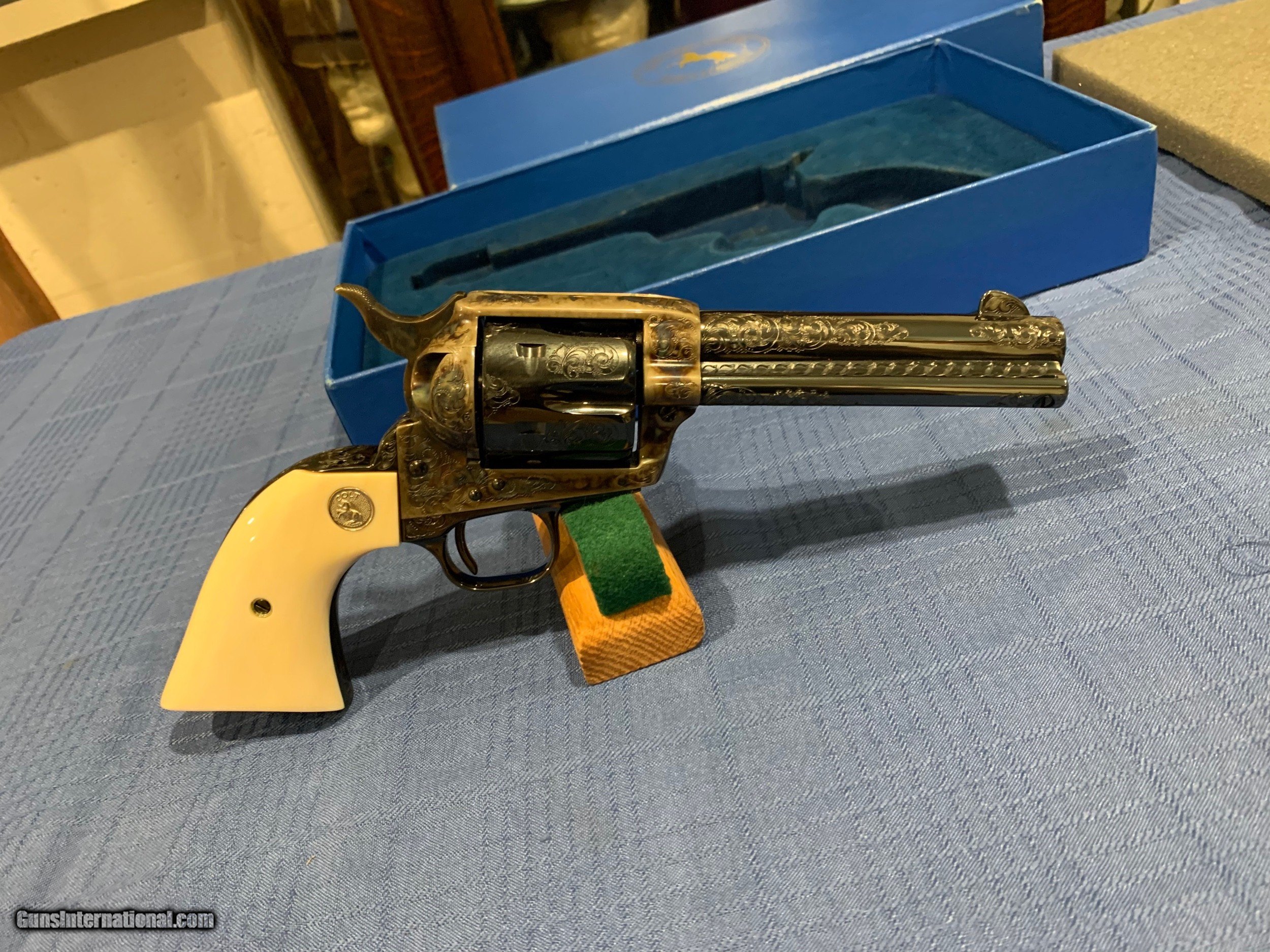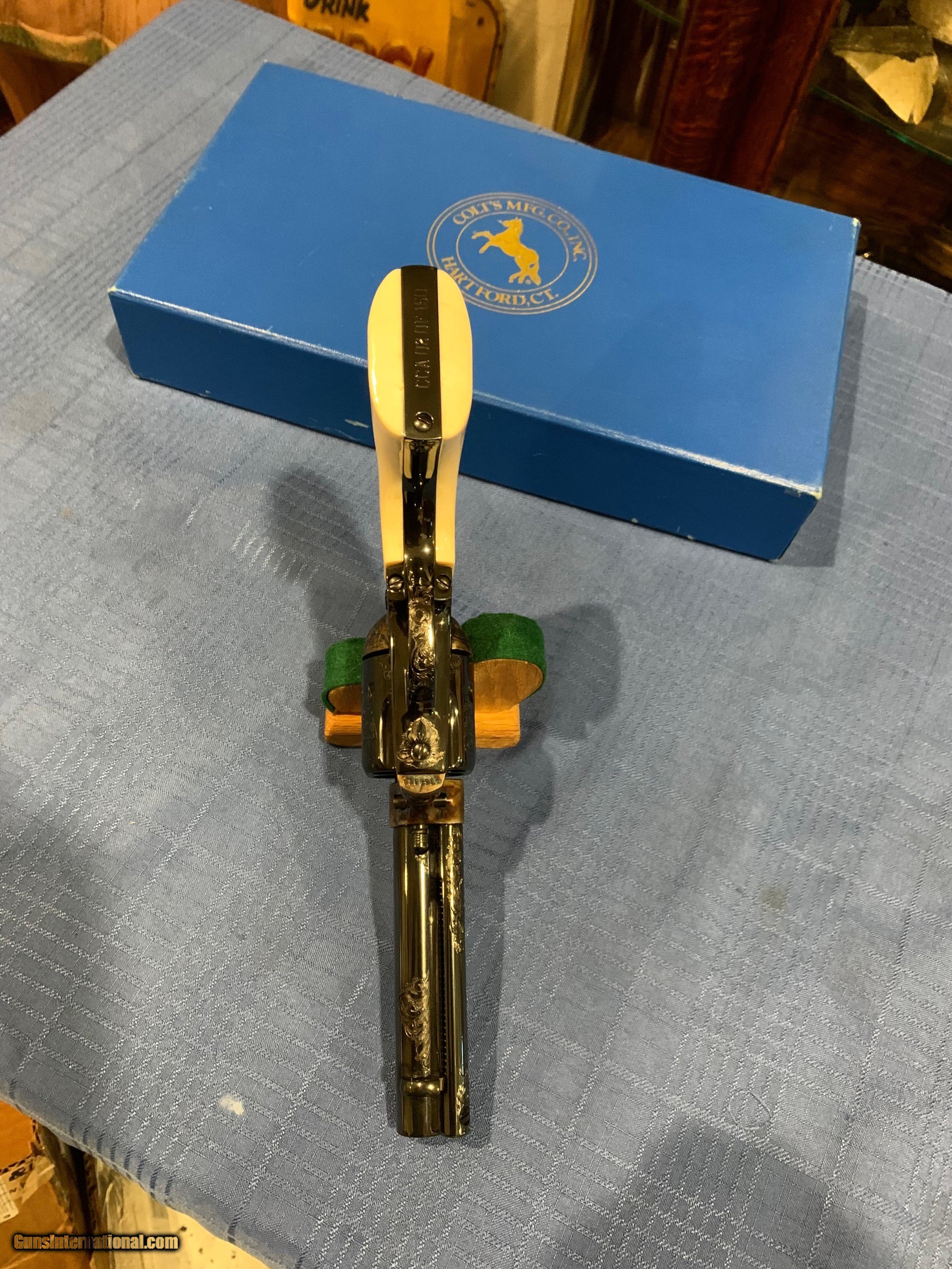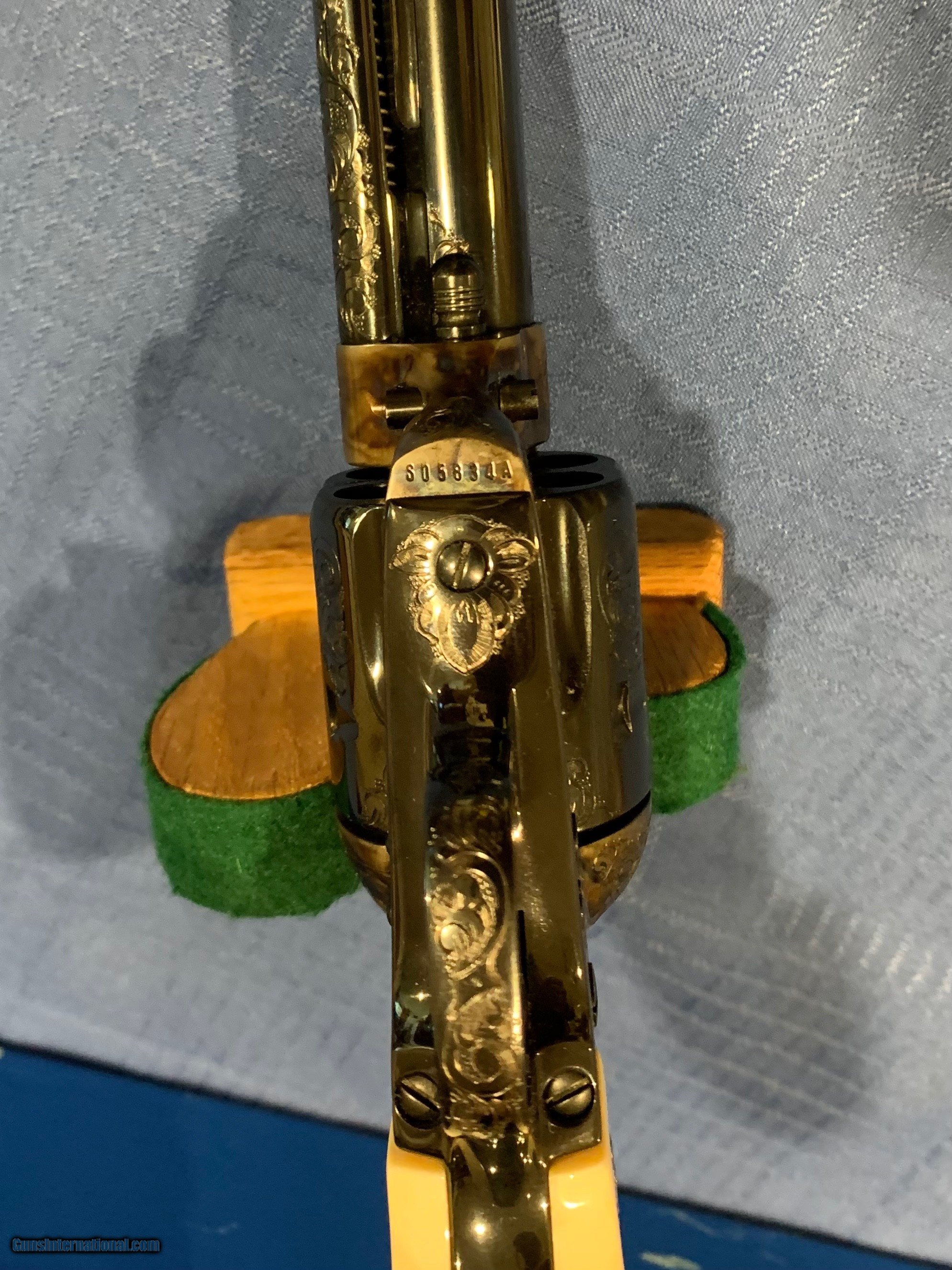 Description: Here's a Stunning Example of Factory Engraved Colt Saa in 38 caliber 4 3/4" barrel with Original Colt Box ! Colt Factory Ivory Grips.Serial number S05834A . This gun is a screamer ! Like new original condition ! Factory Blue and Case Colored finish is Awsome. Gun is unused New Condition. This gun was ordered by the Colt Collectors Association number 2 of 150 . I believe only the first 5 where factory engraved . The Amazing work was done by a Colt Master Engraver. Excellent flow ! Beautifully Done . A Gem for any Collection! Please review my photos and please email me with any questions ? 3 day inspection as allways ! Thank you for looking, Little Jo SOLD Curio/Relic: Yes Handgun Caliber: .45 Colt Manufacturer: Colt Model: SAA Serial Number: S05834A Barrel Length: 4 3/4” Condition: Like new |