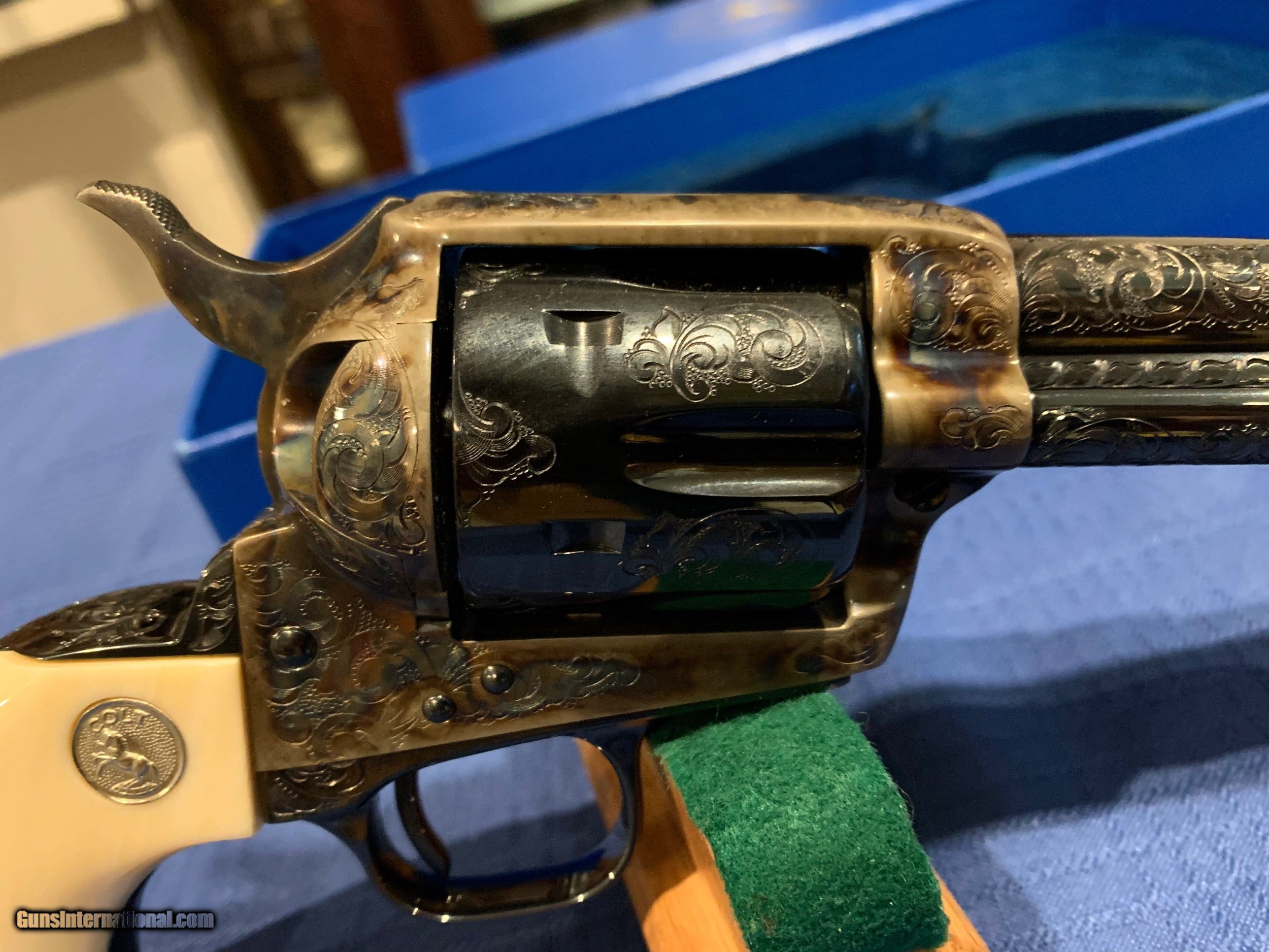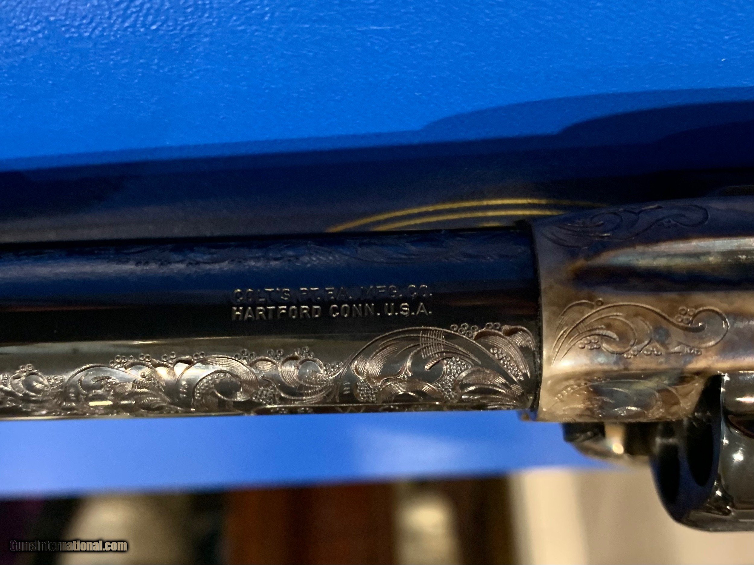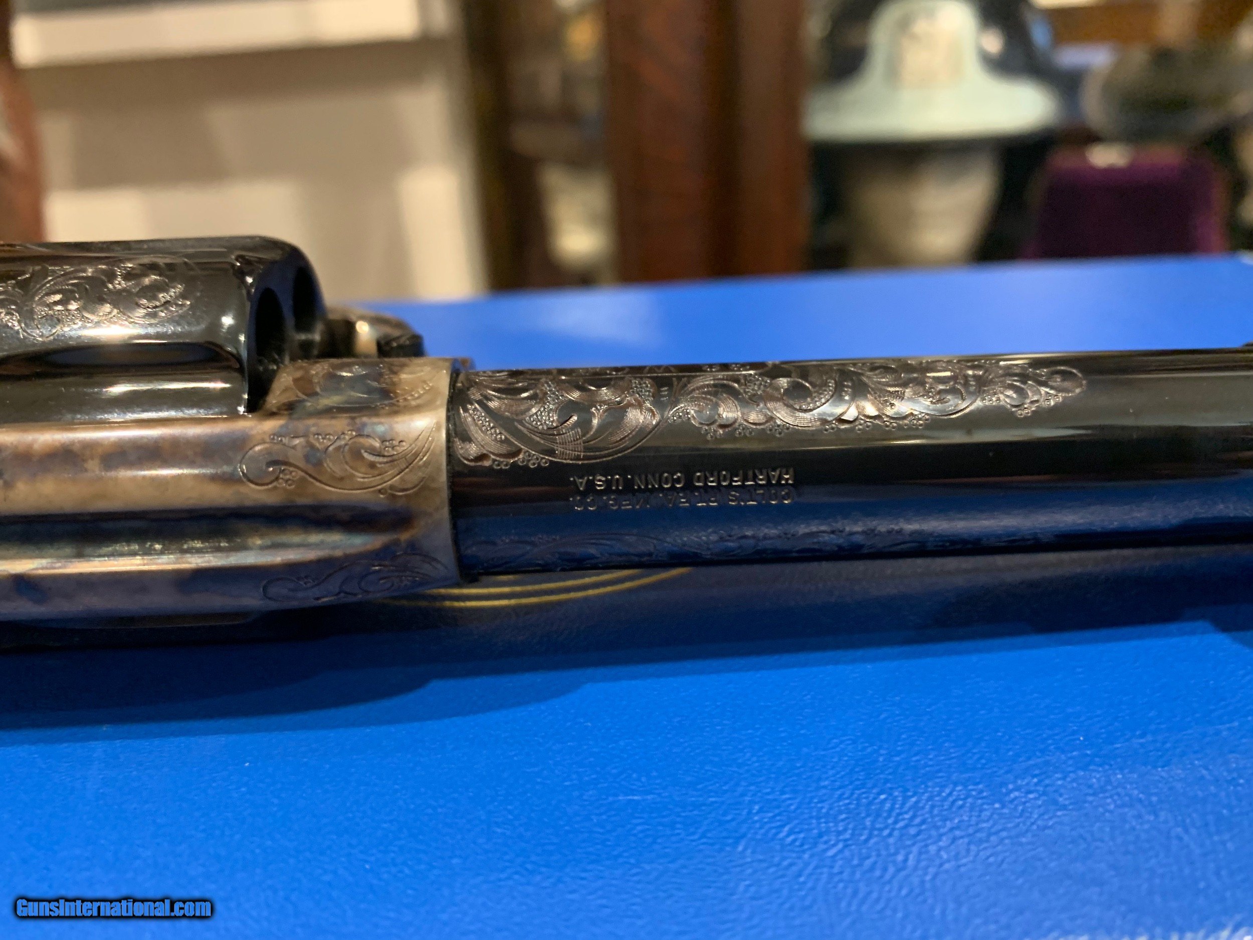 Description: Here's a Stunning Example of Factory Engraved Colt Saa in 38 caliber 4 3/4" barrel with Original Colt Box ! Colt Factory Ivory Grips.Serial number S05834A . This gun is a screamer ! Like new original condition ! Factory Blue and Case Colored finish is Awsome. Gun is unused New Condition. This gun was ordered by the Colt Collectors Association number 2 of 150 . I believe only the first 5 where factory engraved . The Amazing work was done by a Colt Master Engraver. Excellent flow ! Beautifully Done . A Gem for any Collection! Please review my photos and please email me with any questions ? 3 day inspection as allways ! Thank you for looking, Little Jo SOLD Curio/Relic: Yes Handgun Caliber: .45 Colt Manufacturer: Colt Model: SAA Serial Number: S05834A Barrel Length: 4 3/4” Condition: Like new |