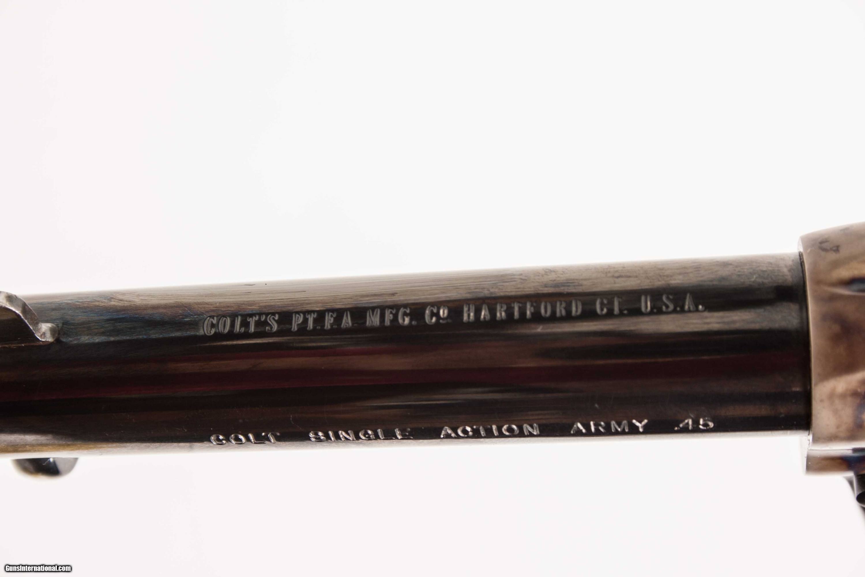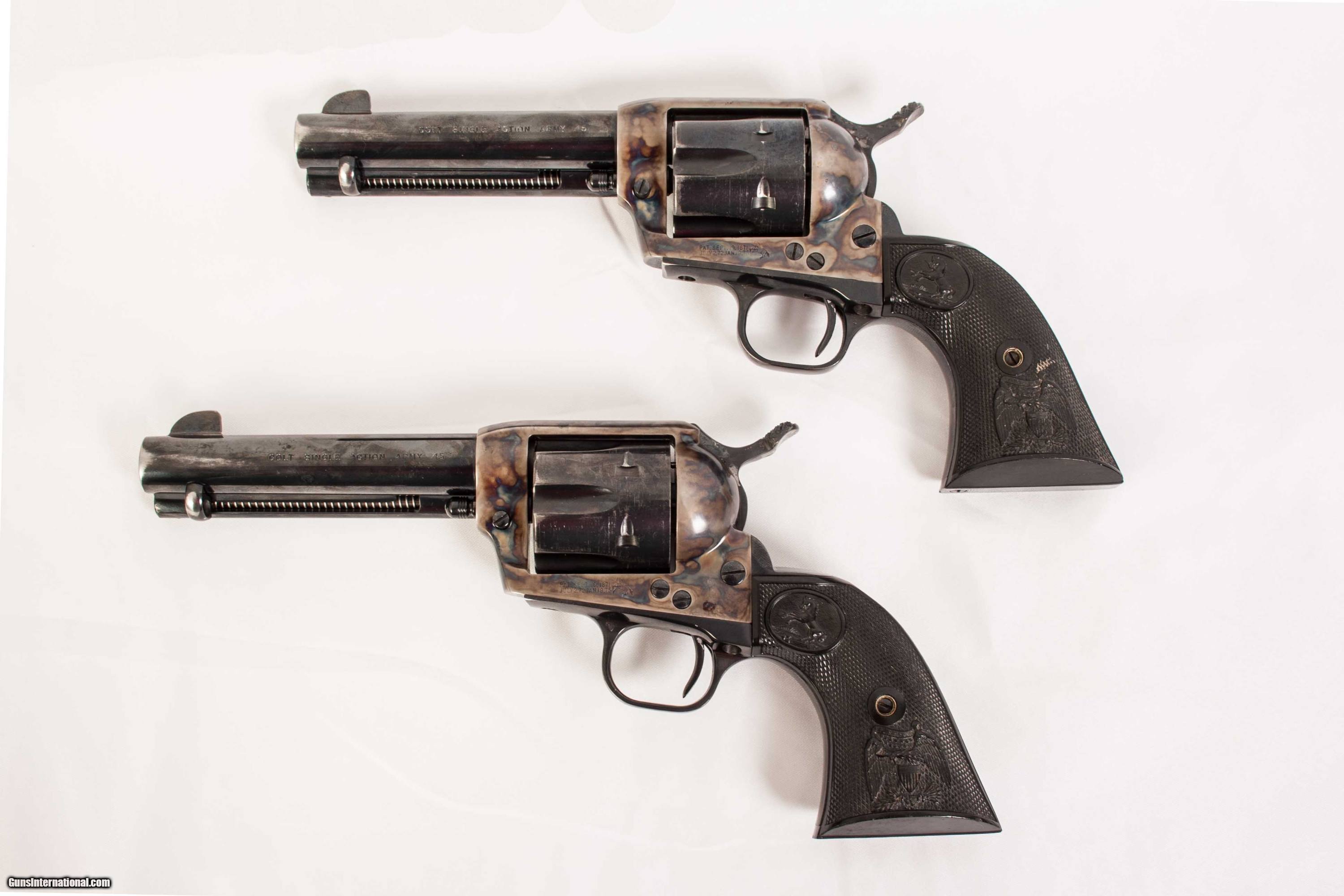 Description: Colt Single Action Army set of 2 revolvers with sequential serial numbers both are chambered in .45 LC with 4 3/4 inch barrels with a bright bores and good grooves and the original box. This gun is in excellent condition and is covered by Dury's Lifetime Warranty.
