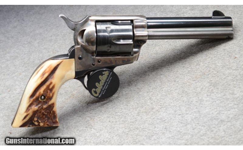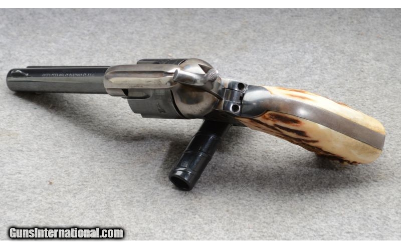 Description: SOLD Caliber Info: .45 Colt Chambers: 6-shot revolver Metal Condition: Good to Very Good. Good blue on barrel, Fine scratches on cylinder. Shallow pits on frame and hammer but good case color. Wood Condition: Very good Bore Condition: Bright and shiny. Barrels: 4-3/4 inch Stock: Stag/bone Weight: 2 lbs -5 oz Sights: Blade and top-strap notch. Item Location: Rogers,, MN |