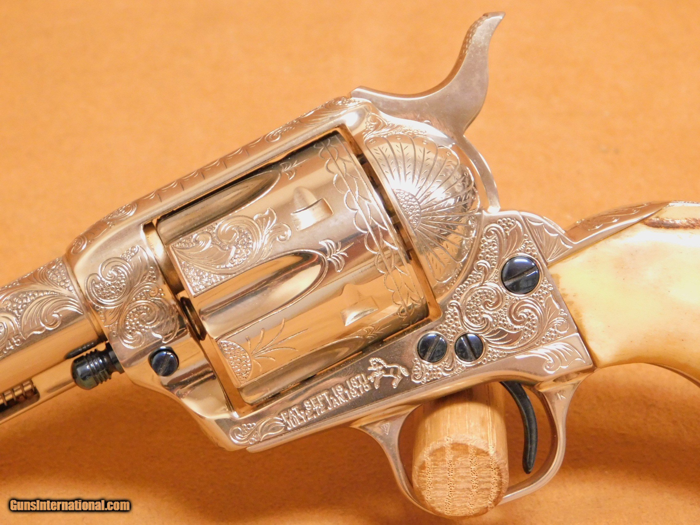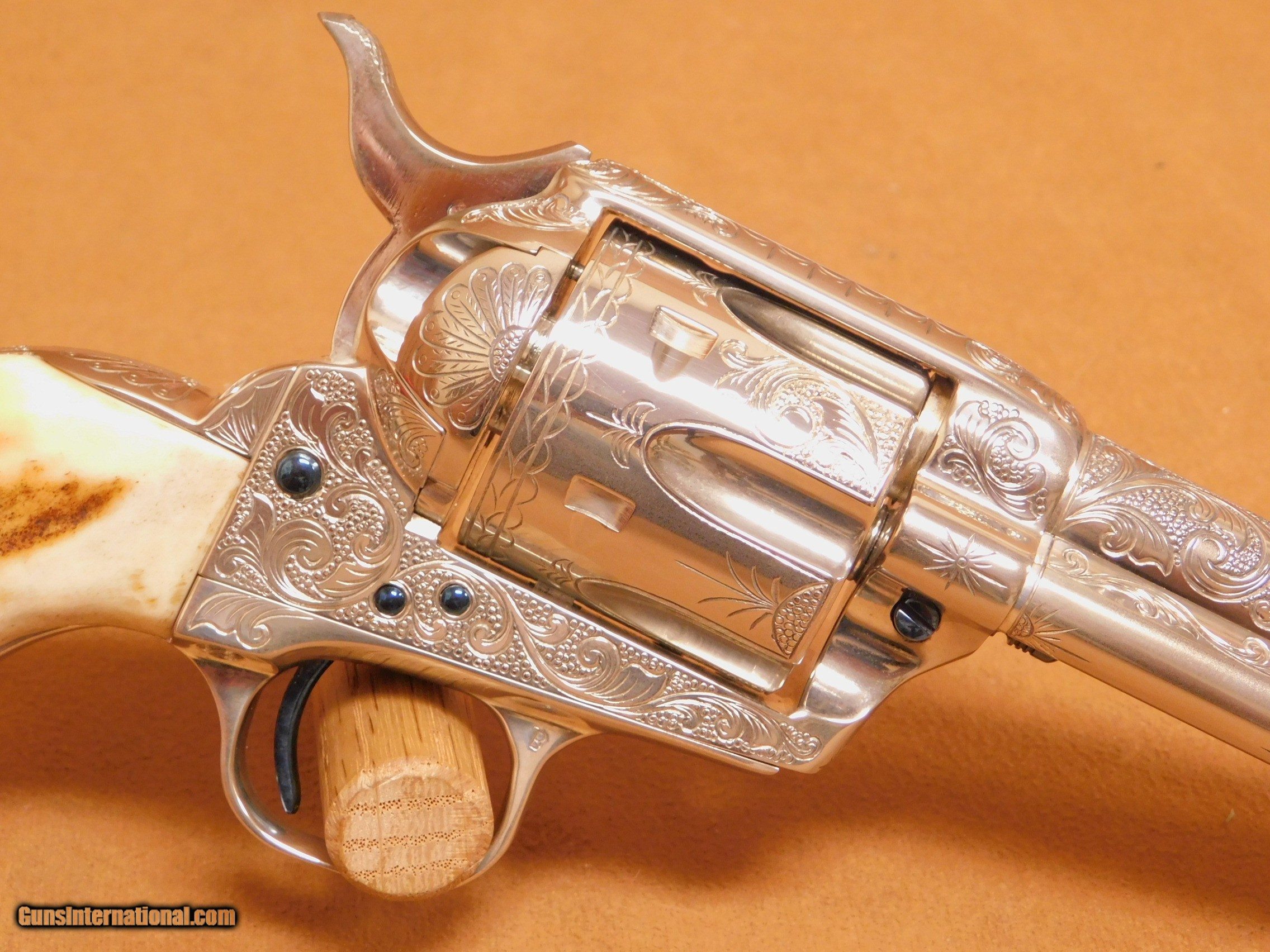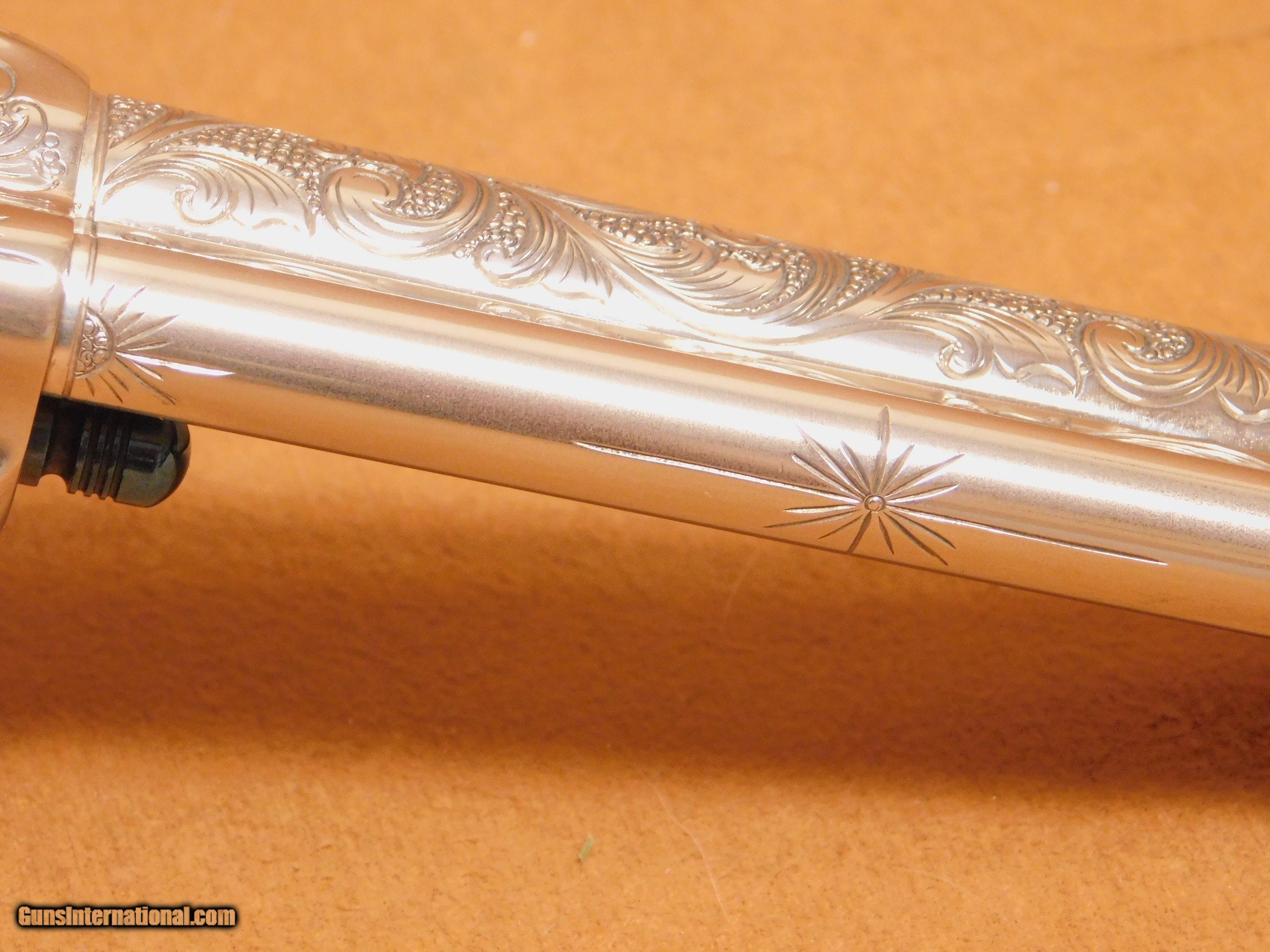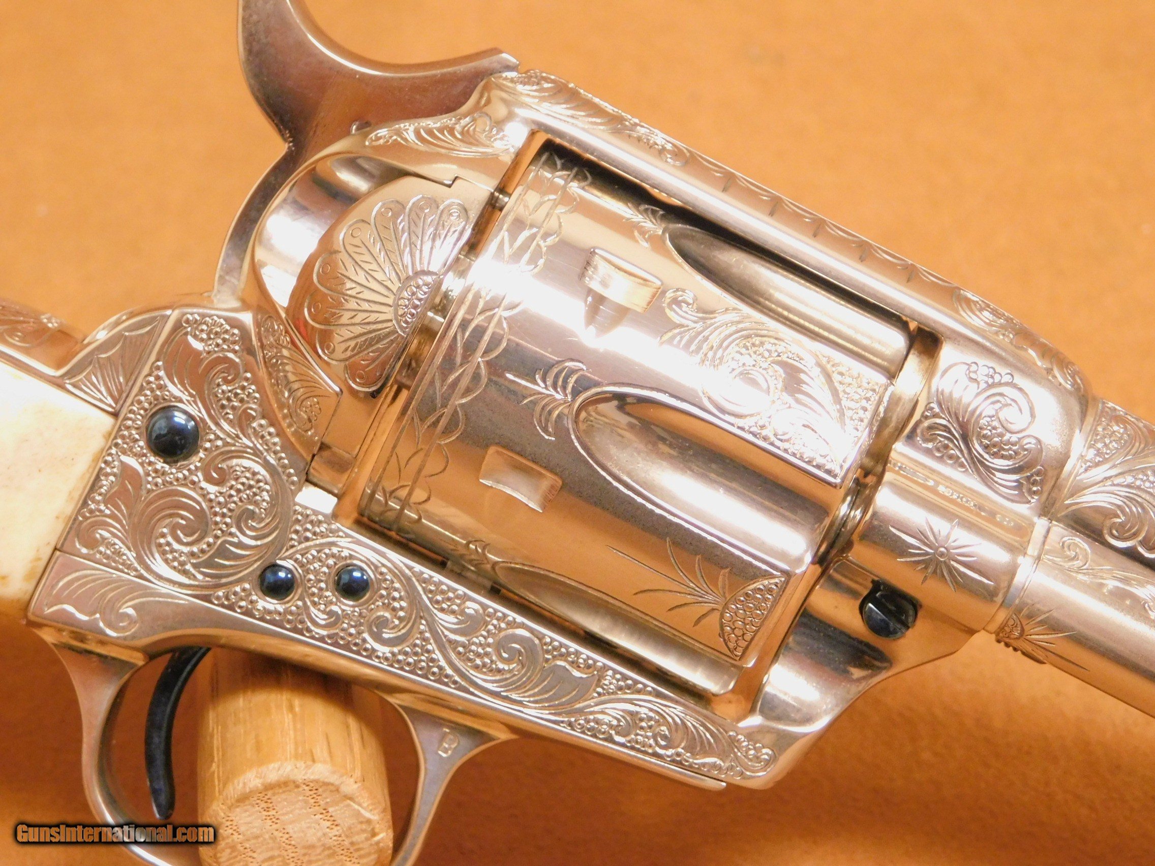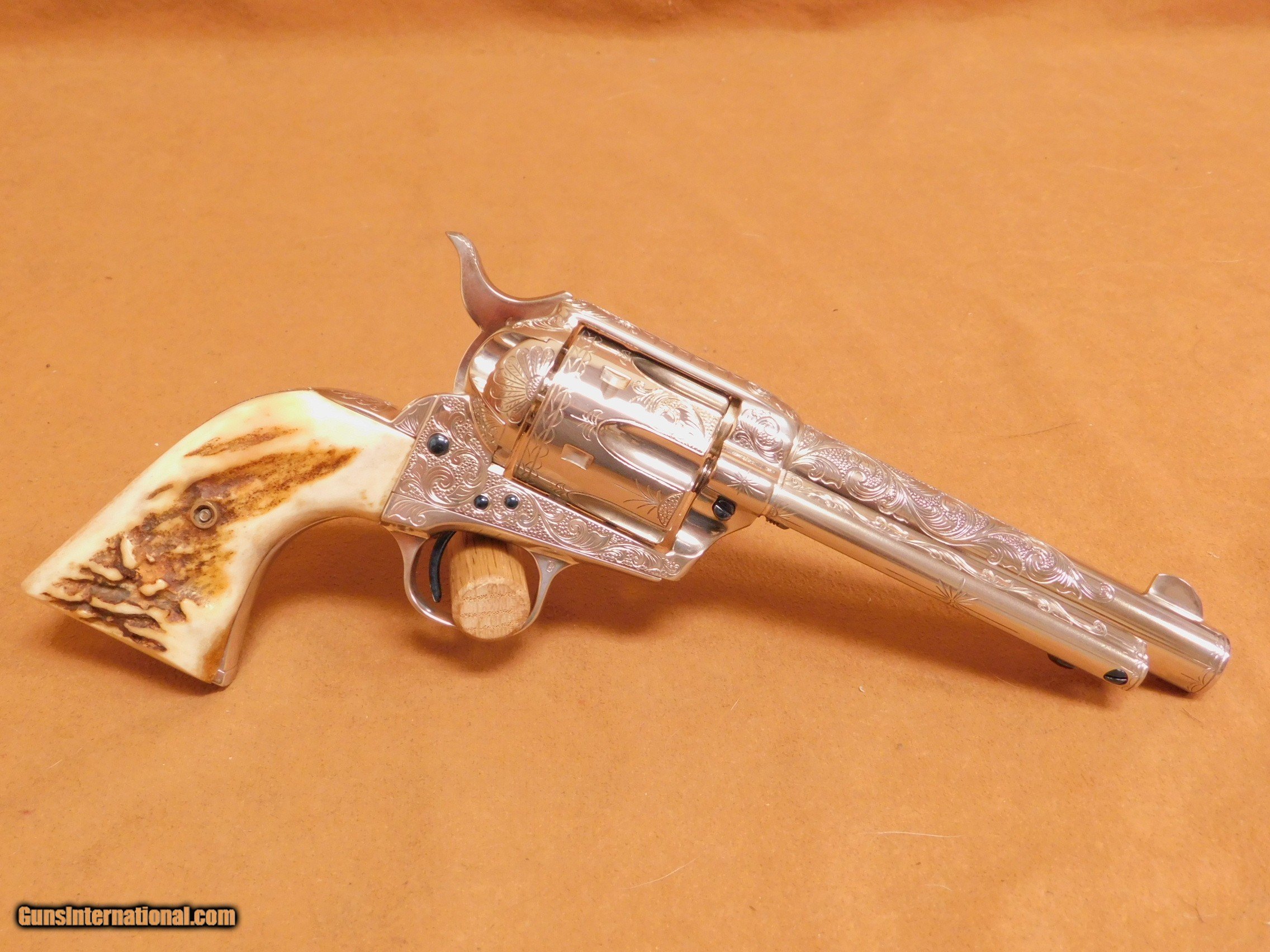 Description: Shipped in 1959, this non-factory engraved Colt SAA displays a well executed Helfricht style scroll with a punch dot background in a C+ level coverage. Polished stag grips accent the silver plate finish. It has a 5-1/2-inch barrel chambered in .45 Colt. The gun is mechanically perfect and appears to be unfired. All items are also available for sale in our brick & mortar store and are subject to prior sale. Think long, think wrong. Payment On firearms, we typically only accept credit cards or money orders/cashier's checks.