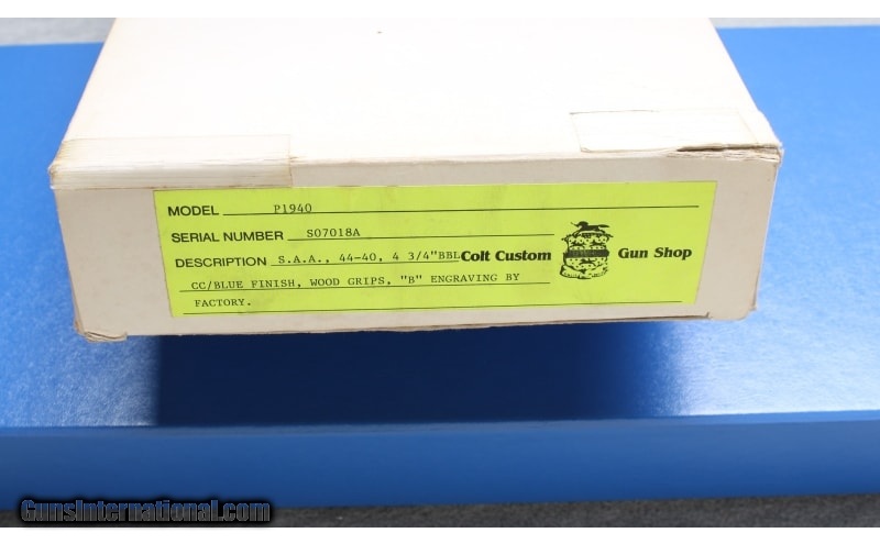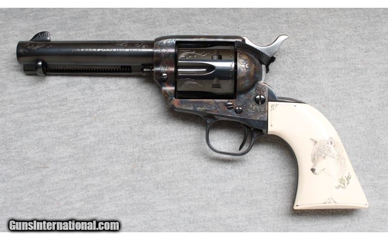 Description: Appears as new, comes with original Colt blue box and outer white box. Beautiful Colt SAA revolver, impressive engraving on case colored frame, cylinder and barrel, custom grips with wolf head design. A superb Colt, an excellent choice for collectors. .44-40 Winchester SOLD Chambers: Revolver Metal Condition: As new Bore Condition: Bright Barrels: 4 3/4 Triggers: Single action Butt Pad: Custom grips Sights: Fixed sight channel Item Location: La Vista, NE |