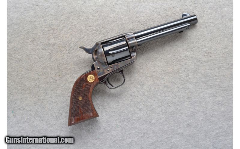 Description: This Colt Model Single Action Army-CP Design is a 6 shot single action revolver in .45 Long Colt Cal. It has a 5.5 inch barrel. A blade front and integral notch rear sight. The enhanced checkered rosewood grip has golden Colt horse medallions. it has a case colored receiver and hammer. .45 LC SOLD Chambers: 6 shot fluted cylinder. Metal Condition: Very good. Wood Condition: Excellent. Bore Condition: Excellent. Barrels: 5.5 inch. Triggers: Single Action. Weight: 34 oz. Sights: Blade front. Integral notch rear. Item Location: Richfield, WI |