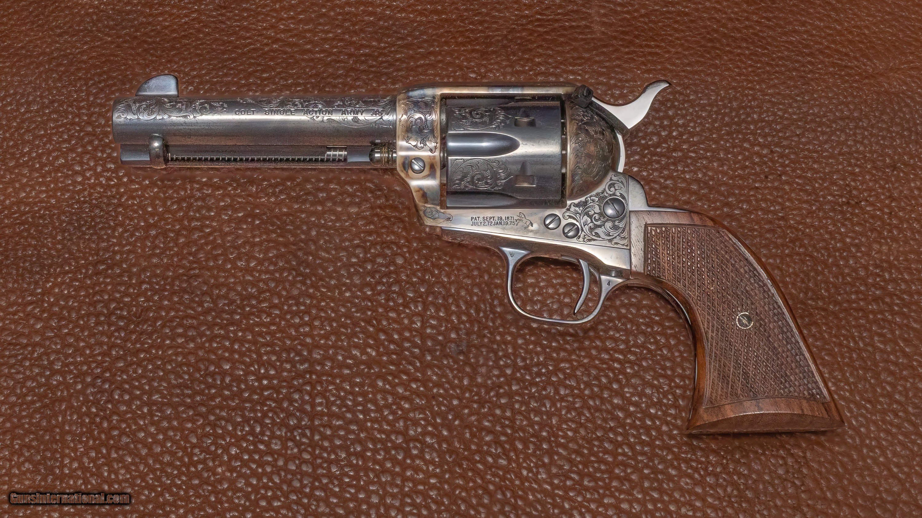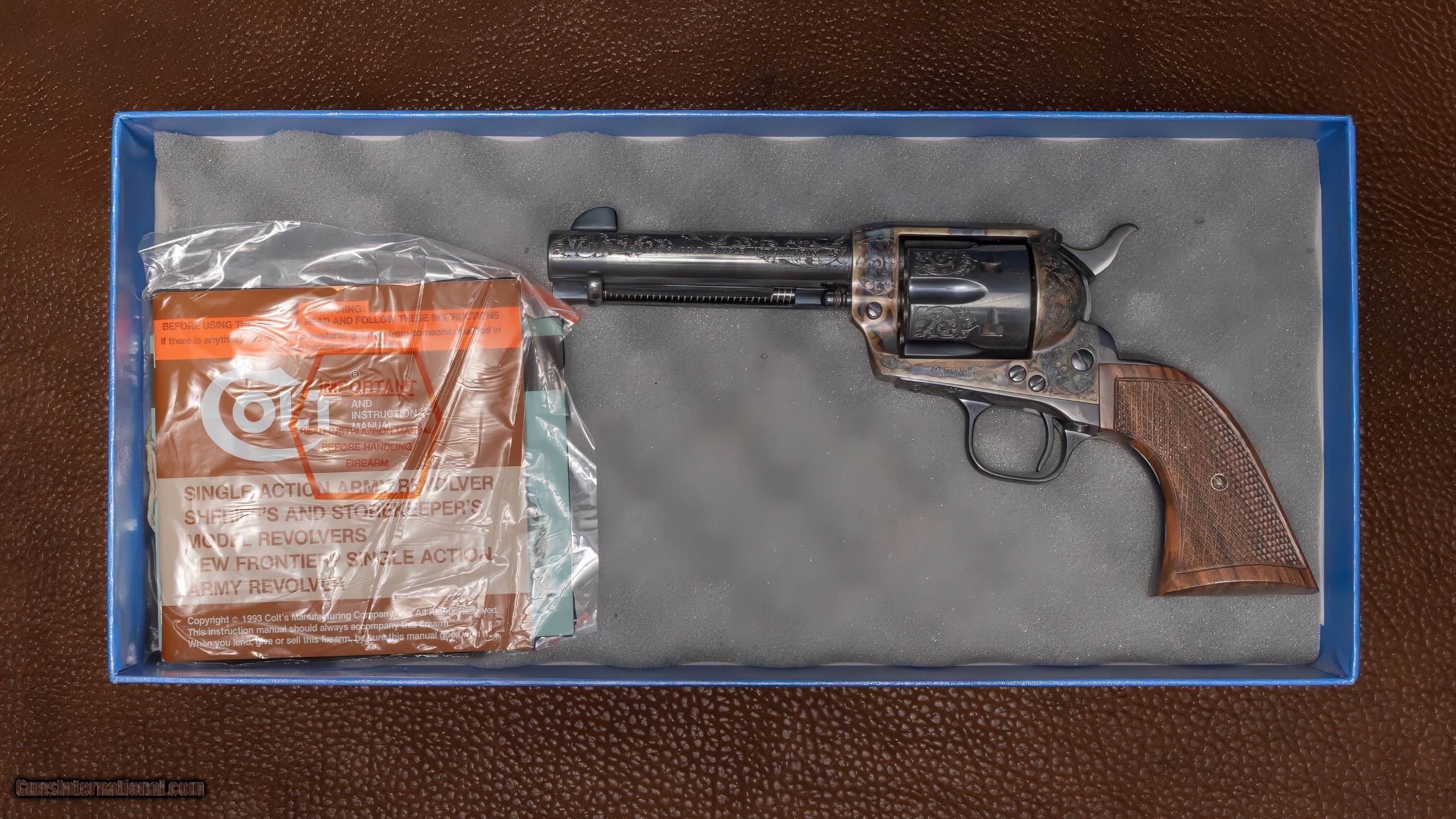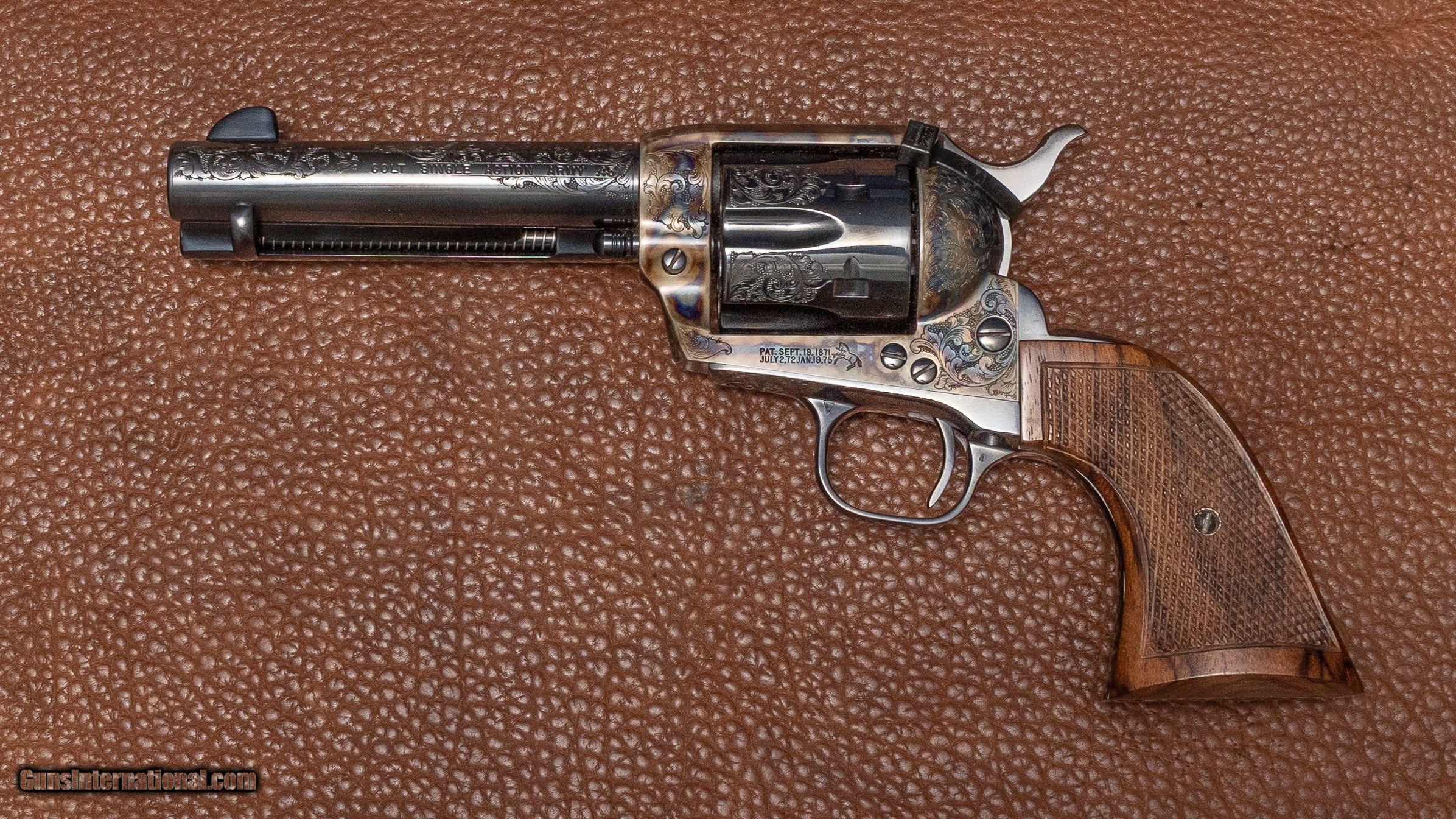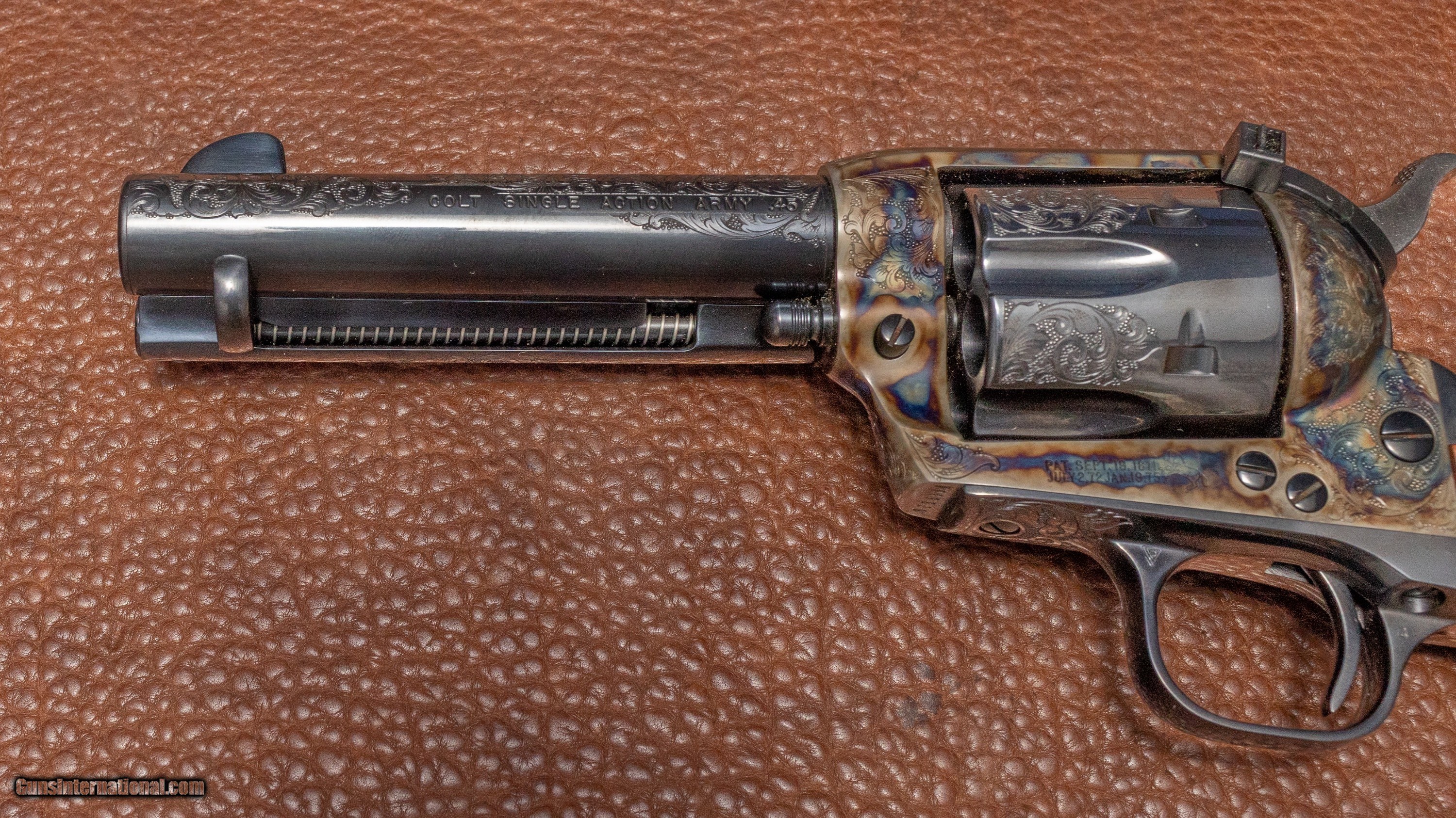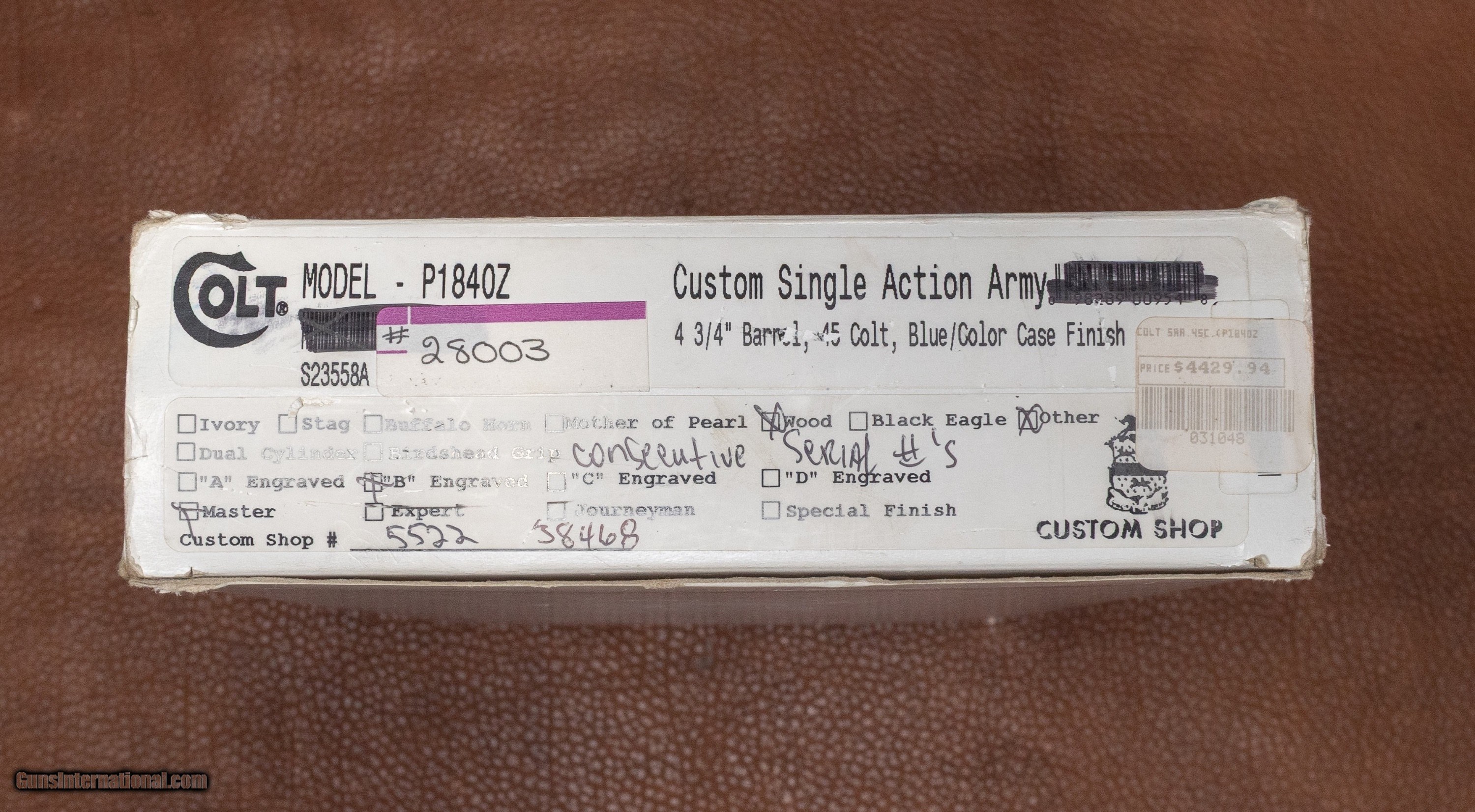 Description: Offered here is a matched, consecutive-numbered pair of Colt Single Action Army revolvers, each factory "B" engraved and chambered in .45 Colt with 4¾" barrels, walnut grips, and the classic color case-hardened frame / blued barrel finish. Both revolvers remain in **as-new condition** and include their original factory boxes; under the engraving box label each is marked "B Engraving" with Master confirming factory coverage and Custom Shop work. The pair is offered together only. Per-gun specifications (both guns identical) - Make / Model: Colt Single Action Army (SAA) — Factory "B" engraving - Caliber: .45 Colt - Barrel: 4¾" - Action: Single action - Finish: Color case-hardened frame; blued barrel & grip frame (factory) - Grips: Factory walnut - Sights: Fixed blade front, groove rear - Serial Numbers: 28002 and 28003 (consecutive) - Condition: As new — crisp mechanics; unfired/near-unfired appearance; original factory boxes included About Colt "B" Engraving (factory coverage) Colt factory engraving coverage historically used A / B / C designations, with B representing medium 75%ish scroll/floral coverage (later Custom Shop schedules describe “B Master” coverage for modern SAAs). Colt factory and collector references recognize A/B/C as standard coverage tiers; B grade factory SAAs and Custom Shop "B Master" guns command significant premiums, especially in .45 Colt with classic 4¾" barrels and blue/case finishes. Why this pair stands out - Consecutive serial numbers and original boxes - Desirable .45 Colt, 4¾" configuration with color case / blue finish. - Factory engraving (not aftermarket), enhancing collectability and long term value. - As new condition across both revolvers. Handgun Caliber: .45 Colt Manufacturer: Colt Model: Single Action Army Serial Number: 28002 & 28003 Barrel Length: 4 3/4 Condition: Excellent Metal Condition: Excellent Wood Condition: Excellent Bore Condition: Excellent Barrels: 4 3/4 Triggers: Single Weight: 2.3 oz Case: Original Factory Boxes Item Location: Michigan Price: $19,999.00 Buy Now Contact Seller |
