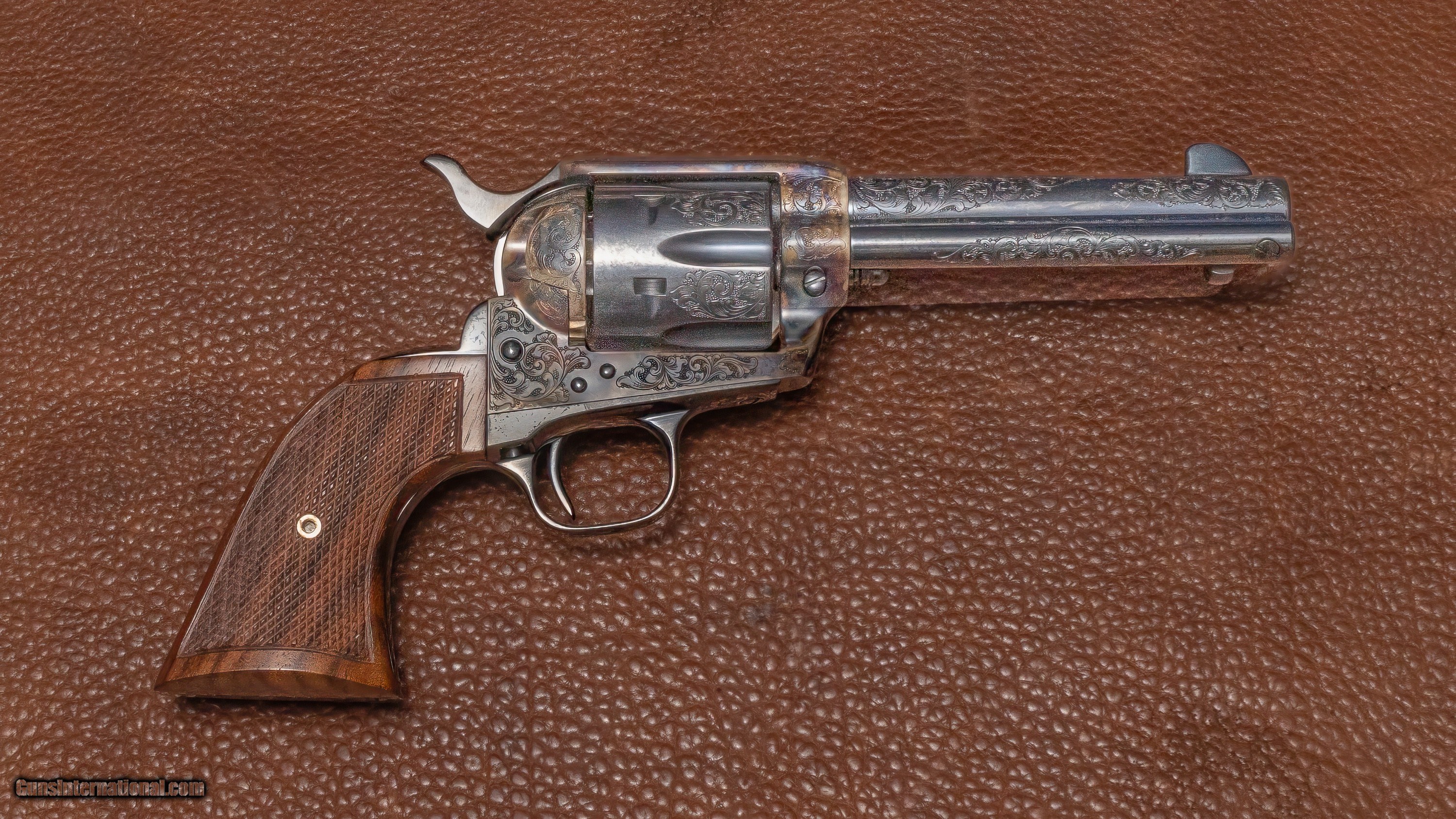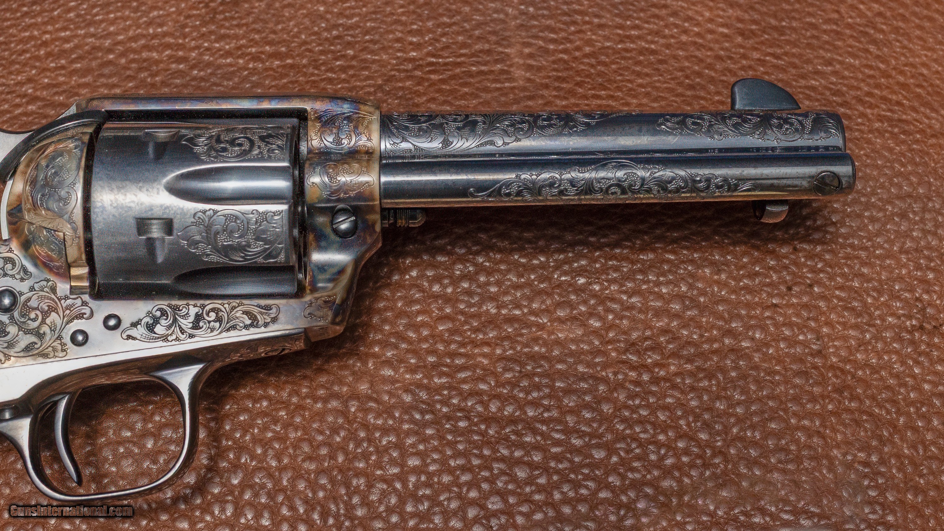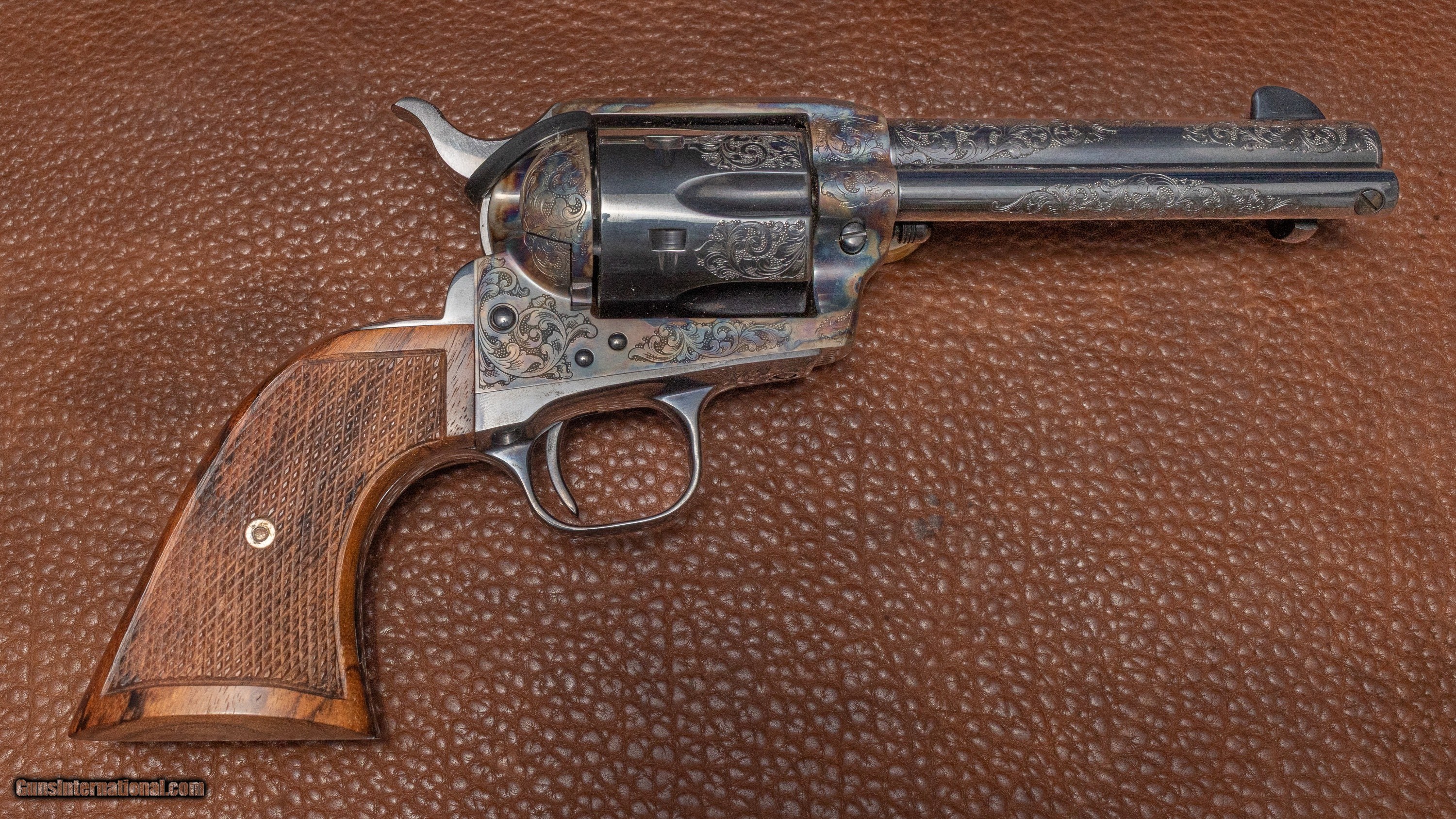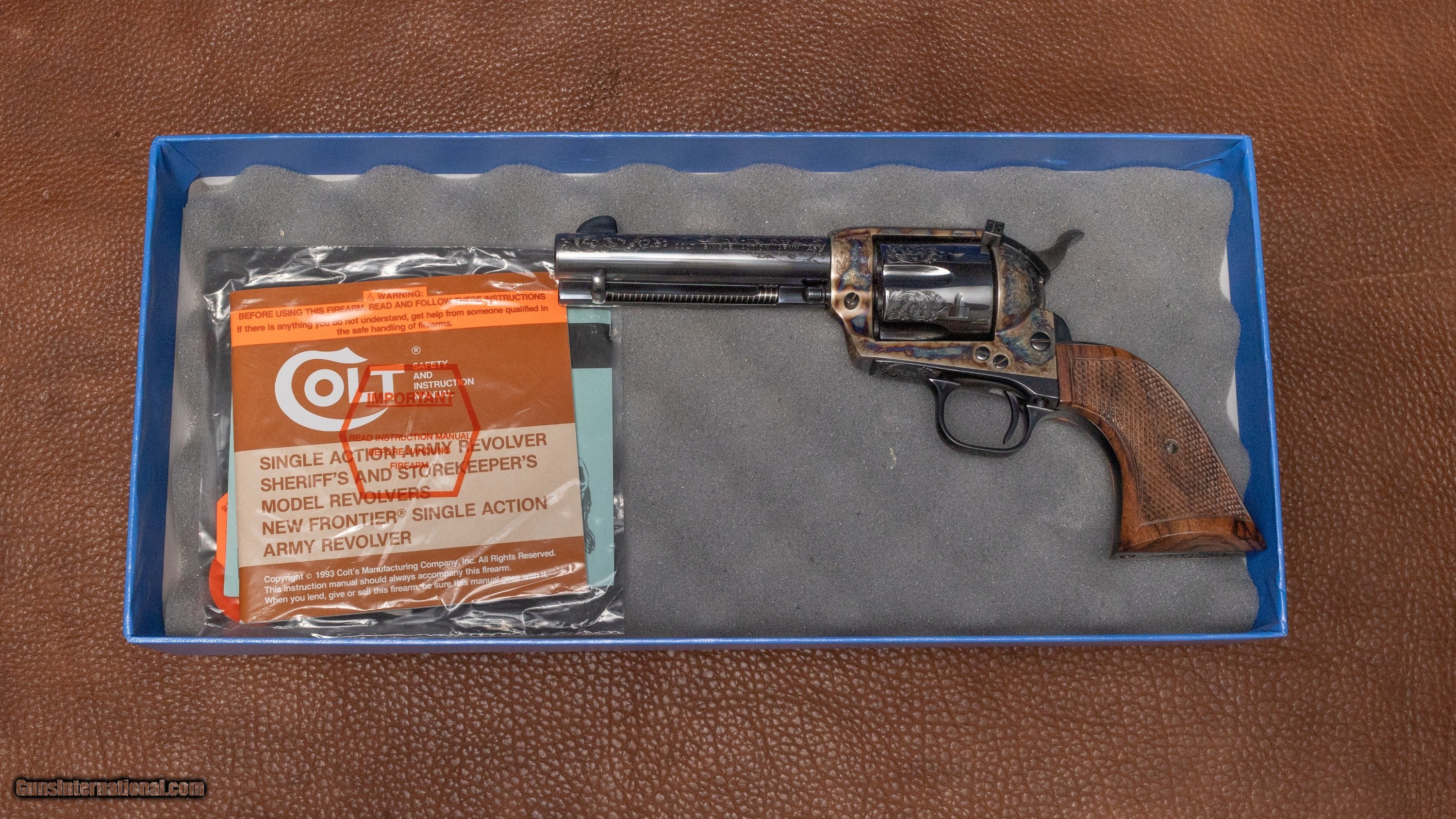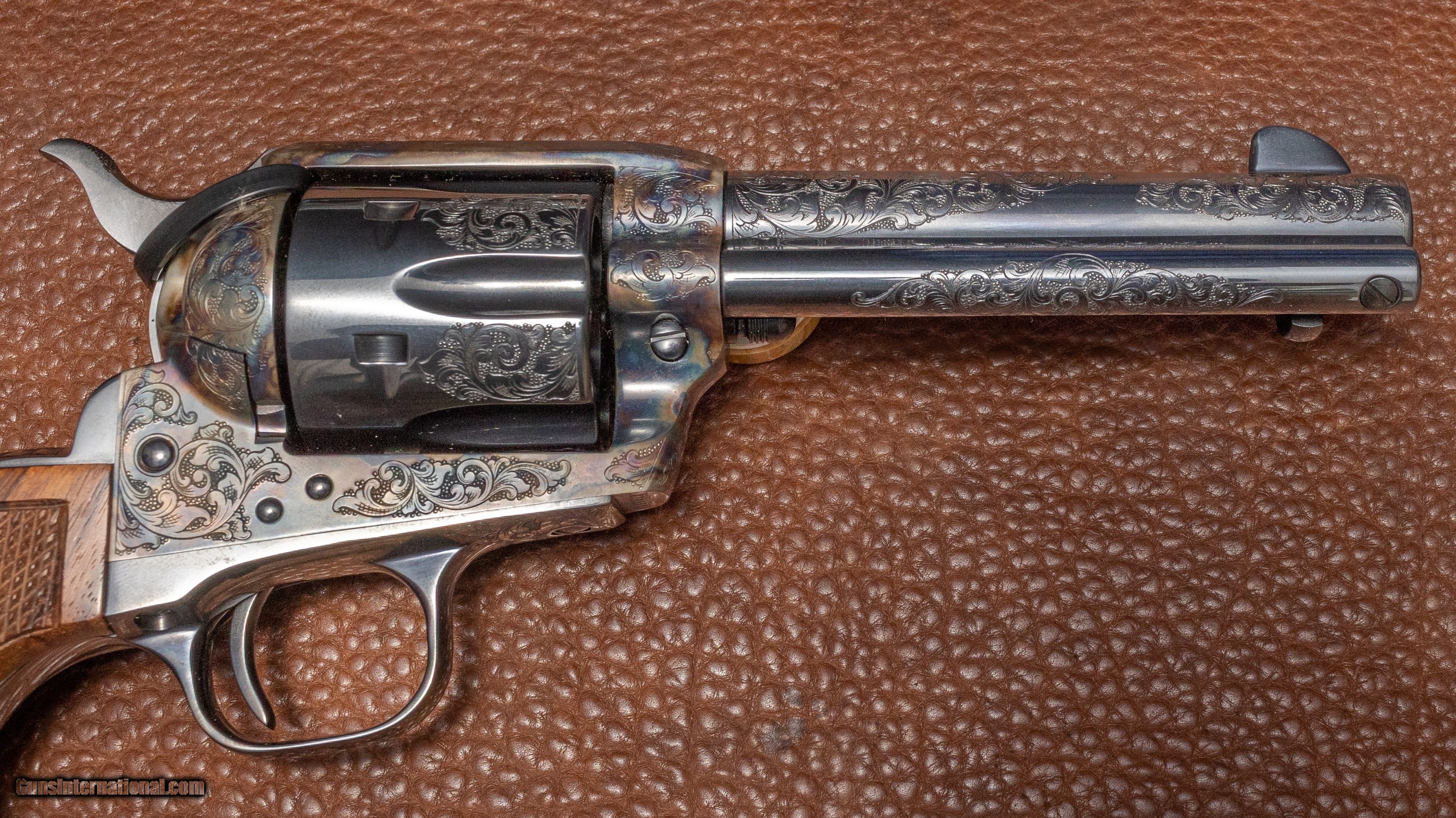 Description: Offered here is a matched, consecutive-numbered pair of Colt Single Action Army revolvers, each factory "B" engraved and chambered in .45 Colt with 4¾" barrels, walnut grips, and the classic color case-hardened frame / blued barrel finish. Both revolvers remain in **as-new condition** and include their original factory boxes; under the engraving box label each is marked "B Engraving" with Master confirming factory coverage and Custom Shop work. The pair is offered together only. Per-gun specifications (both guns identical) - Make / Model: Colt Single Action Army (SAA) — Factory "B" engraving - Caliber: .45 Colt - Barrel: 4¾" - Action: Single action - Finish: Color case-hardened frame; blued barrel & grip frame (factory) - Grips: Factory walnut - Sights: Fixed blade front, groove rear - Serial Numbers: 28002 and 28003 (consecutive) - Condition: As new — crisp mechanics; unfired/near-unfired appearance; original factory boxes included About Colt "B" Engraving (factory coverage) Colt factory engraving coverage historically used A / B / C designations, with B representing medium 75%ish scroll/floral coverage (later Custom Shop schedules describe “B Master” coverage for modern SAAs). Colt factory and collector references recognize A/B/C as standard coverage tiers; B grade factory SAAs and Custom Shop "B Master" guns command significant premiums, especially in .45 Colt with classic 4¾" barrels and blue/case finishes. Why this pair stands out - Consecutive serial numbers and original boxes - Desirable .45 Colt, 4¾" configuration with color case / blue finish. - Factory engraving (not aftermarket), enhancing collectability and long term value. - As new condition across both revolvers. Handgun Caliber: .45 Colt Manufacturer: Colt Model: Single Action Army Serial Number: 28002 & 28003 Barrel Length: 4 3/4 Condition: Excellent Metal Condition: Excellent Wood Condition: Excellent Bore Condition: Excellent Barrels: 4 3/4 Triggers: Single Weight: 2.3 oz Case: Original Factory Boxes Item Location: Michigan Price: $19,999.00 Buy Now Contact Seller |