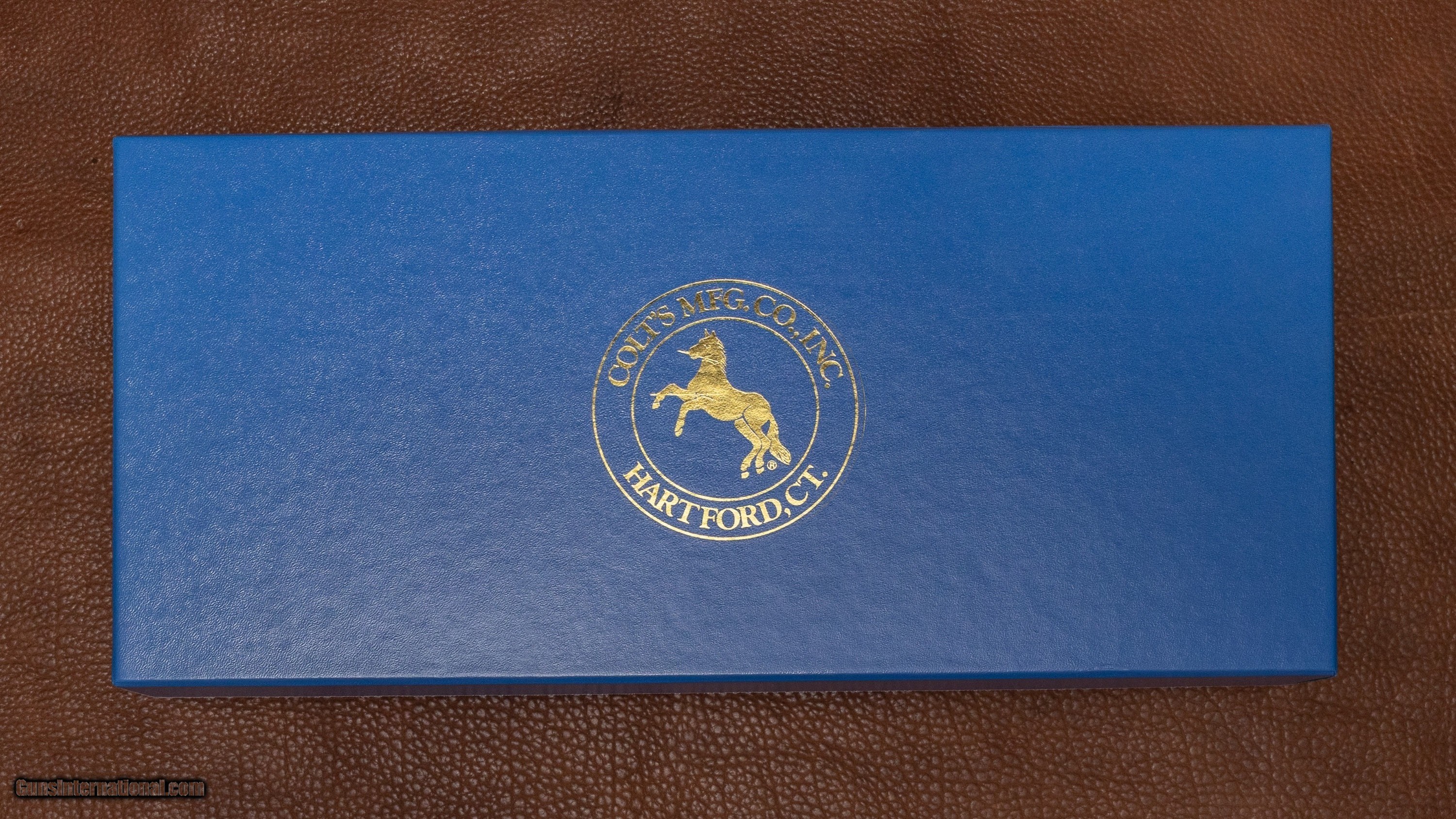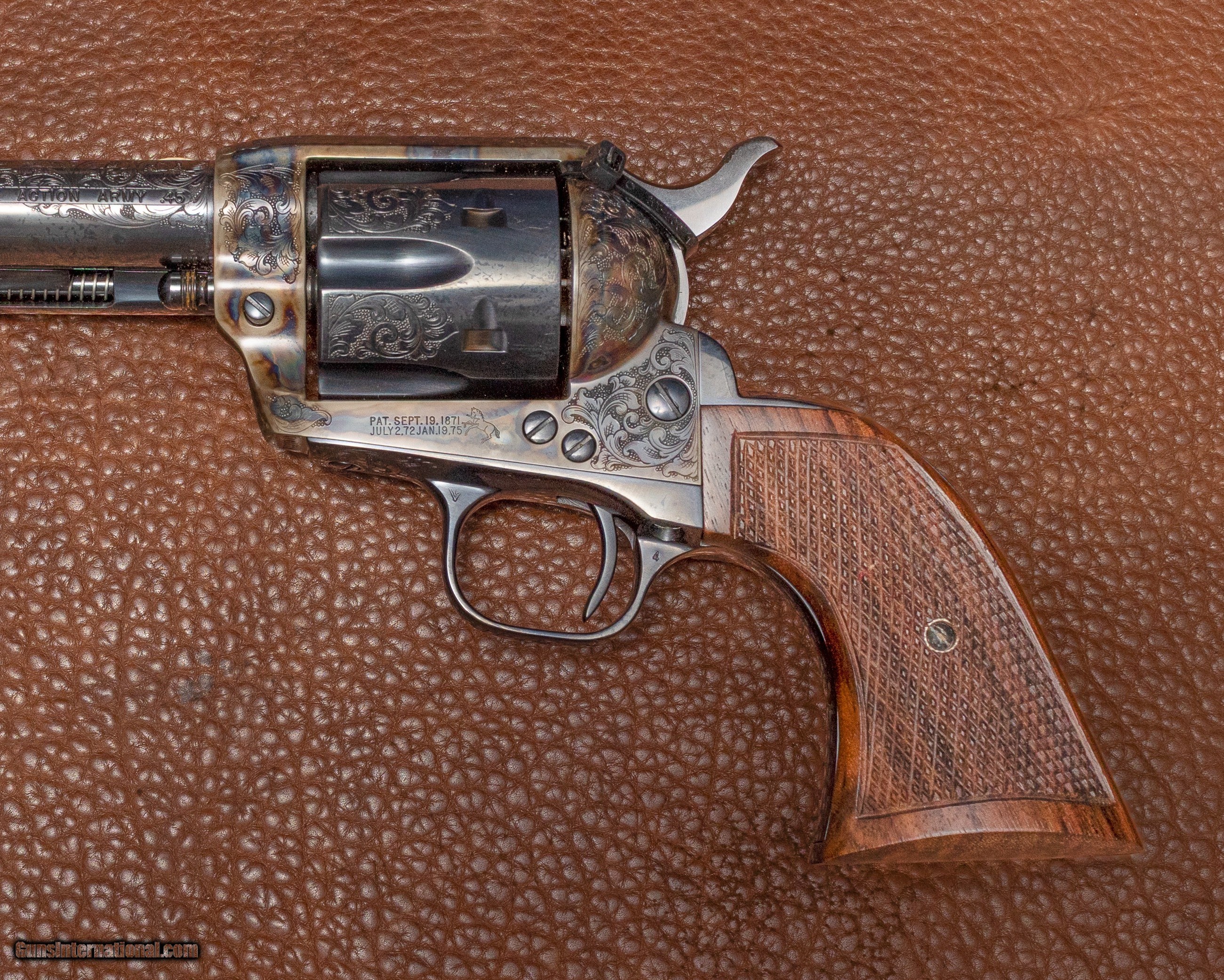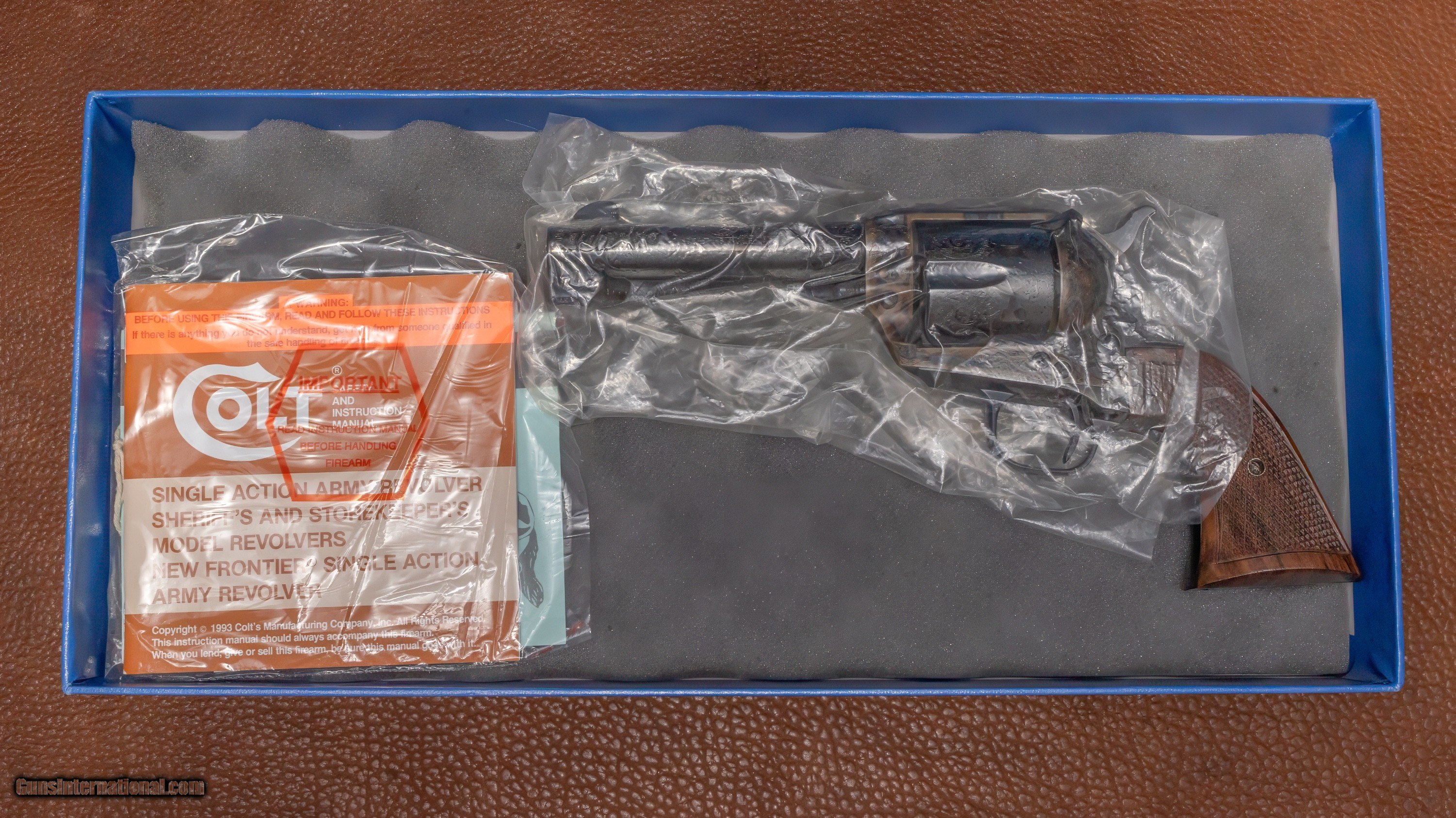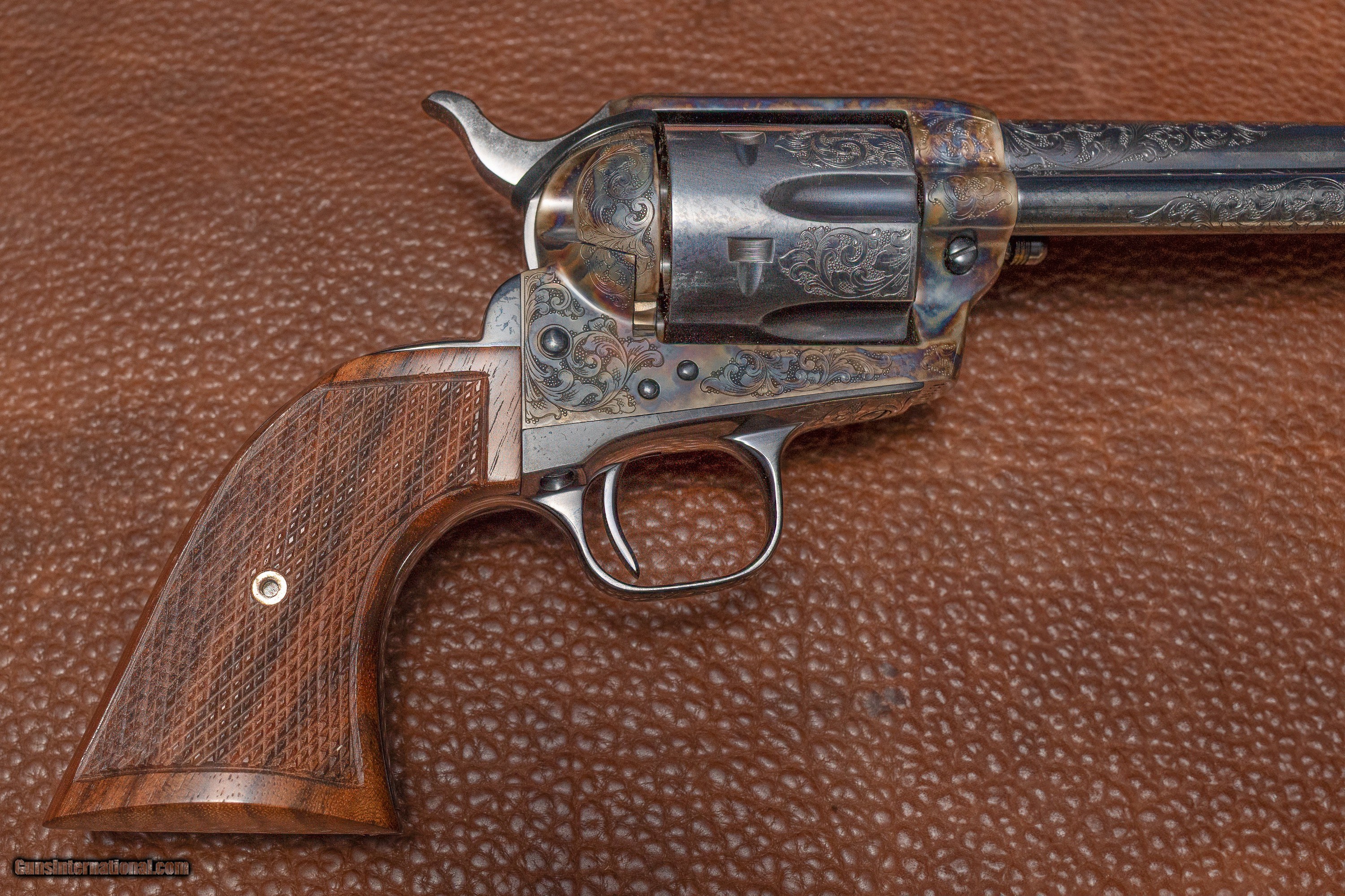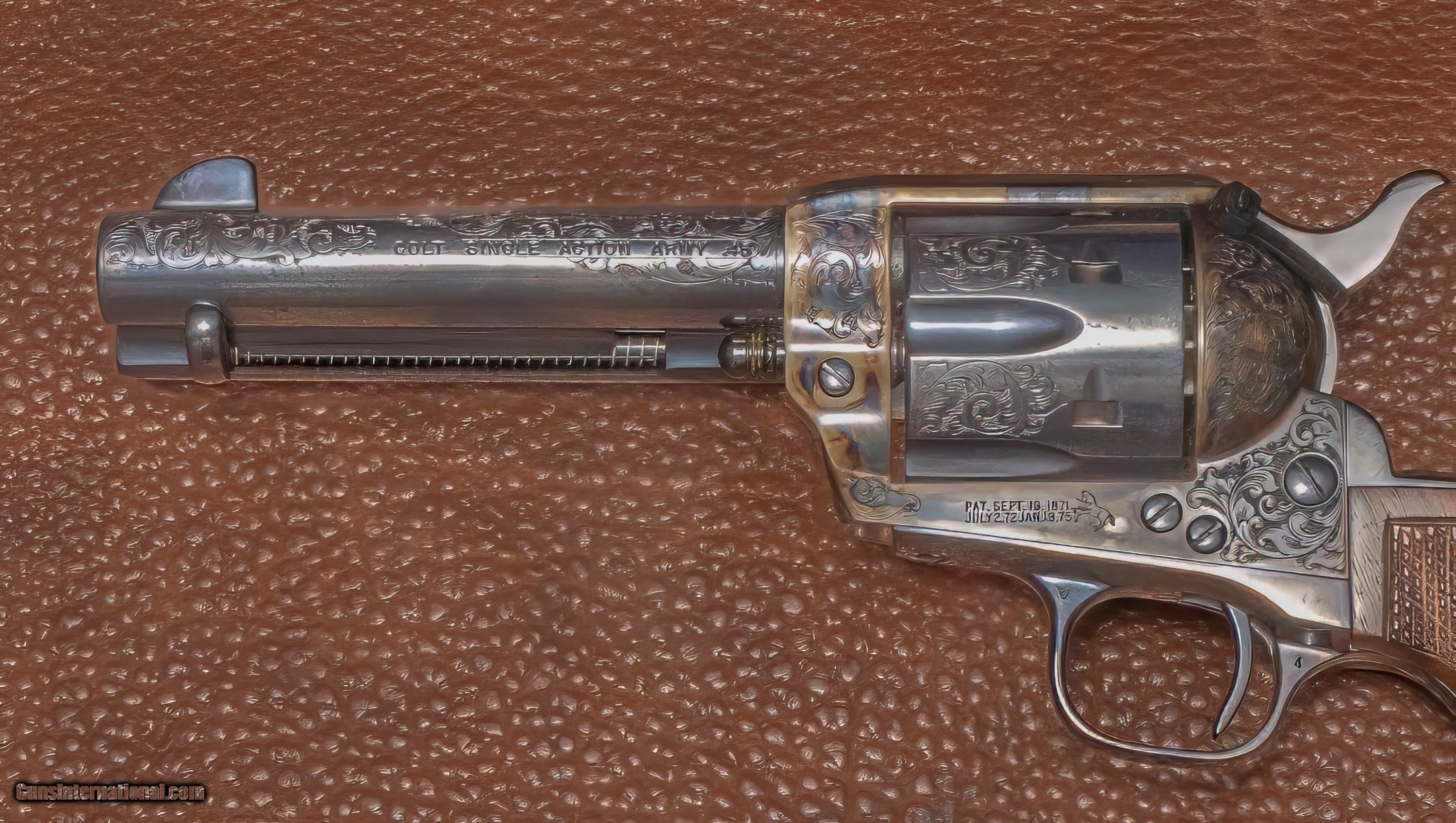 Description: Offered here is a matched, consecutive-numbered pair of Colt Single Action Army revolvers, each factory "B" engraved and chambered in .45 Colt with 4¾" barrels, walnut grips, and the classic color case-hardened frame / blued barrel finish. Both revolvers remain in **as-new condition** and include their original factory boxes; under the engraving box label each is marked "B Engraving" with Master confirming factory coverage and Custom Shop work. The pair is offered together only. Per-gun specifications (both guns identical) - Make / Model: Colt Single Action Army (SAA) — Factory "B" engraving - Caliber: .45 Colt - Barrel: 4¾" - Action: Single action - Finish: Color case-hardened frame; blued barrel & grip frame (factory) - Grips: Factory walnut - Sights: Fixed blade front, groove rear - Serial Numbers: 28002 and 28003 (consecutive) - Condition: As new — crisp mechanics; unfired/near-unfired appearance; original factory boxes included About Colt "B" Engraving (factory coverage) Colt factory engraving coverage historically used A / B / C designations, with B representing medium 75%ish scroll/floral coverage (later Custom Shop schedules describe “B Master” coverage for modern SAAs). Colt factory and collector references recognize A/B/C as standard coverage tiers; B grade factory SAAs and Custom Shop "B Master" guns command significant premiums, especially in .45 Colt with classic 4¾" barrels and blue/case finishes. Why this pair stands out - Consecutive serial numbers and original boxes - Desirable .45 Colt, 4¾" configuration with color case / blue finish. - Factory engraving (not aftermarket), enhancing collectability and long term value. - As new condition across both revolvers. Handgun Caliber: .45 Colt Manufacturer: Colt Model: Single Action Army Serial Number: 28002 & 28003 Barrel Length: 4 3/4 Condition: Excellent Metal Condition: Excellent Wood Condition: Excellent Bore Condition: Excellent Barrels: 4 3/4 Triggers: Single Weight: 2.3 oz Case: Original Factory Boxes Item Location: Michigan Price: $19,999.00 Buy Now Contact Seller |
