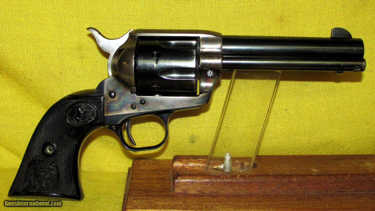 Description: COLT model SINGLE ACTION ARMY in .44 SPECIAL CAL., with 4 3/4" barrel. Color BLUE. GREAT CONDITION WITH SLIGHT SILVERING ON CYLINDER FACE, SLIGHT CYLINDER DRAG, 98% BRIGHT CASE COLORS ON FRAME, BORE EXCELLENT, GRIPS EXCELLENT. Condition 95% +. Serial number SA22075. SOLD |
