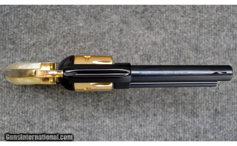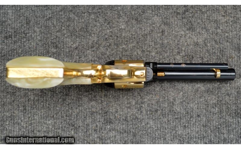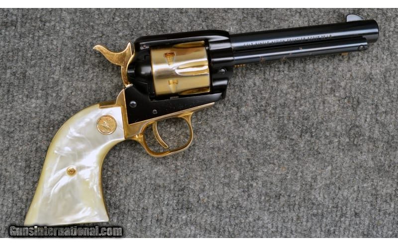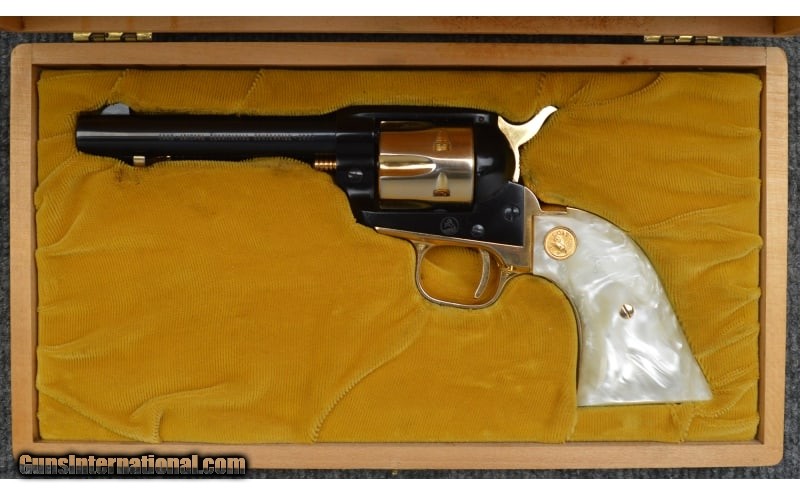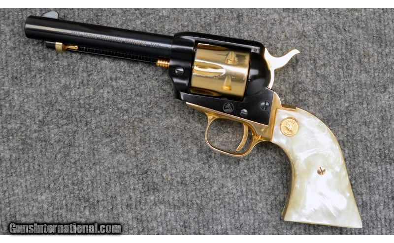 Description: For your consideration, a Colt Single Action Frontier Scout chambered in .22 Long Rifle. This piece is a commemorative celebrating the 1963 centennial of Arizona Territory. As such, it features gilded components contrasting with the high gloss blued finish and faux mother-of-pearl grips. Of 5,355 such guns made, this example is number 4215. .22 Long Rifle SOLD Chambers: 6 Metal Condition: Very Good Wood Condition: Excellent Bore Condition: Excellent Barrels: 4.75 Triggers: Smooth Face Weight: 1.75 lbs Sights: Iron Sights Item Location: Hamburg, PA |