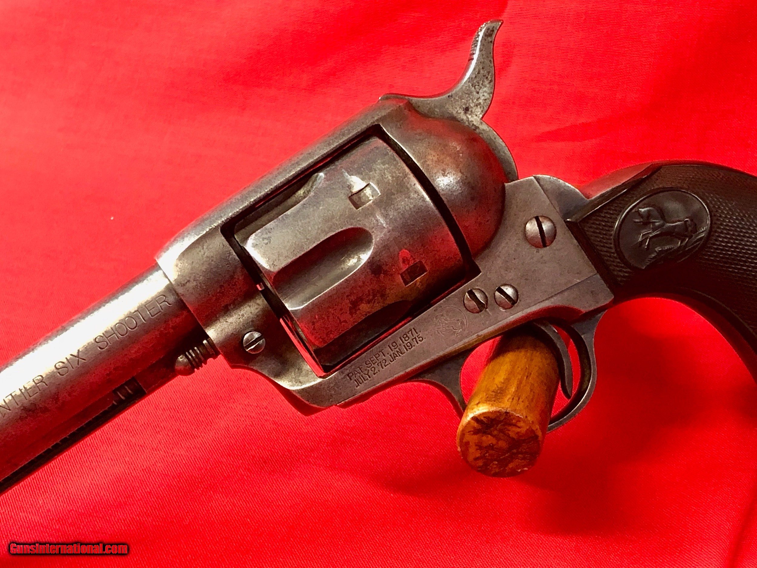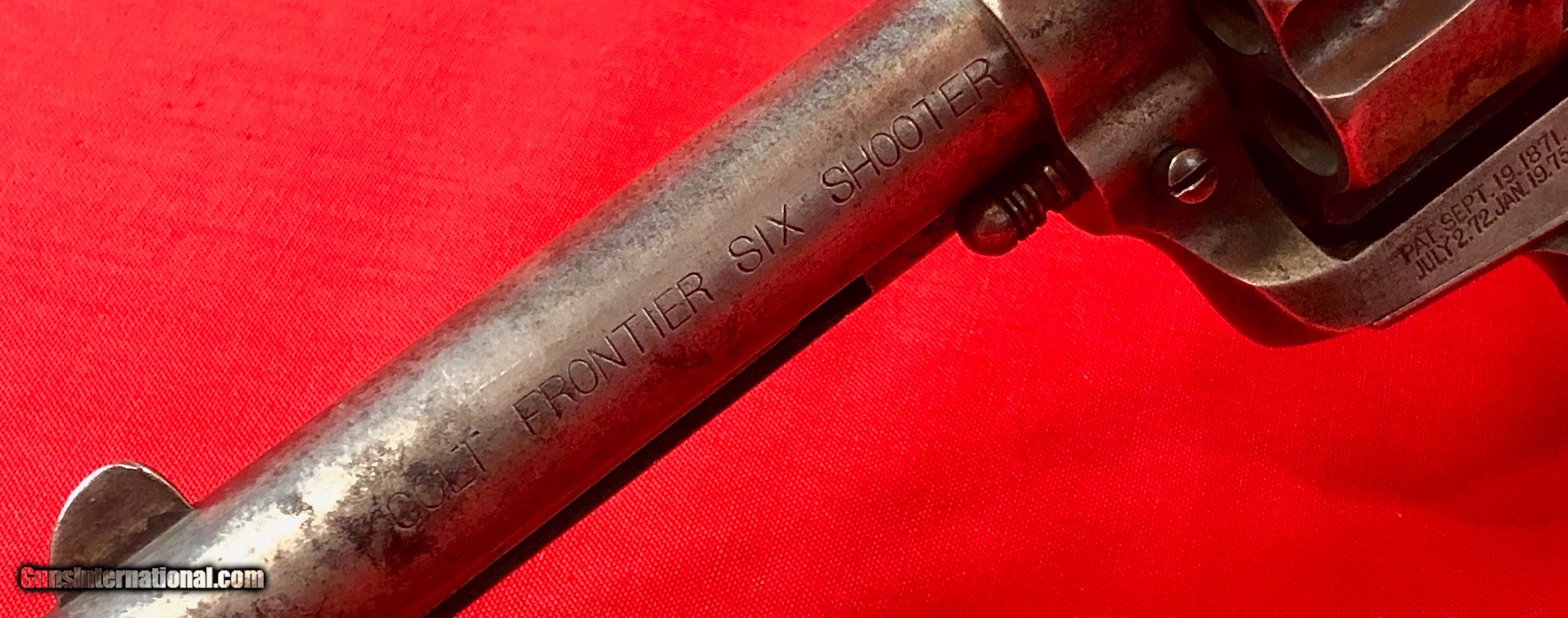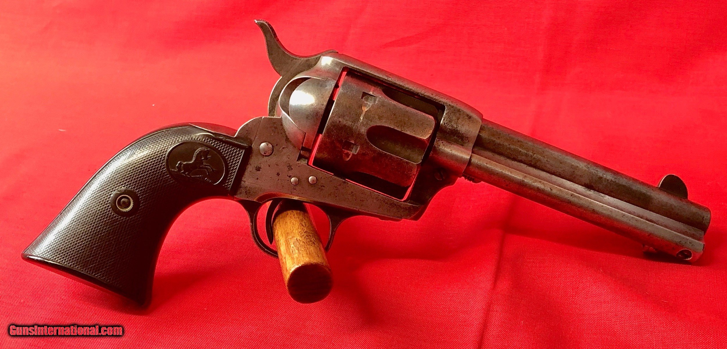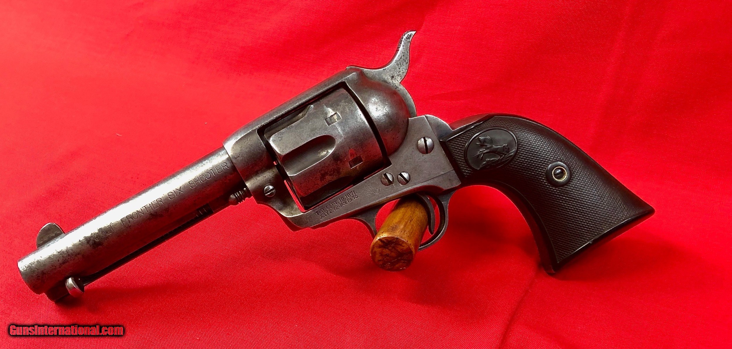 Description: Colt Single Action Frontier Six Shooter Caliber 44-40 Made in 1898 4.75 inch barrel Trace amounts of color case hardening remains Action in good condition and locks up well Original black rubber grips are very good with an excellent fit Bore is very good with prominent rifling Cylinders are very good Interesting Colt factory letter indicating a duplicate serial number Colt Single Action Army, please see pictures Solid Colt Single Action Revolver Antique firearm that ships anywhere All firearms should be checked by a gunsmith Call or text Paul at 601-397-8054 SOLD Antique: Yes |