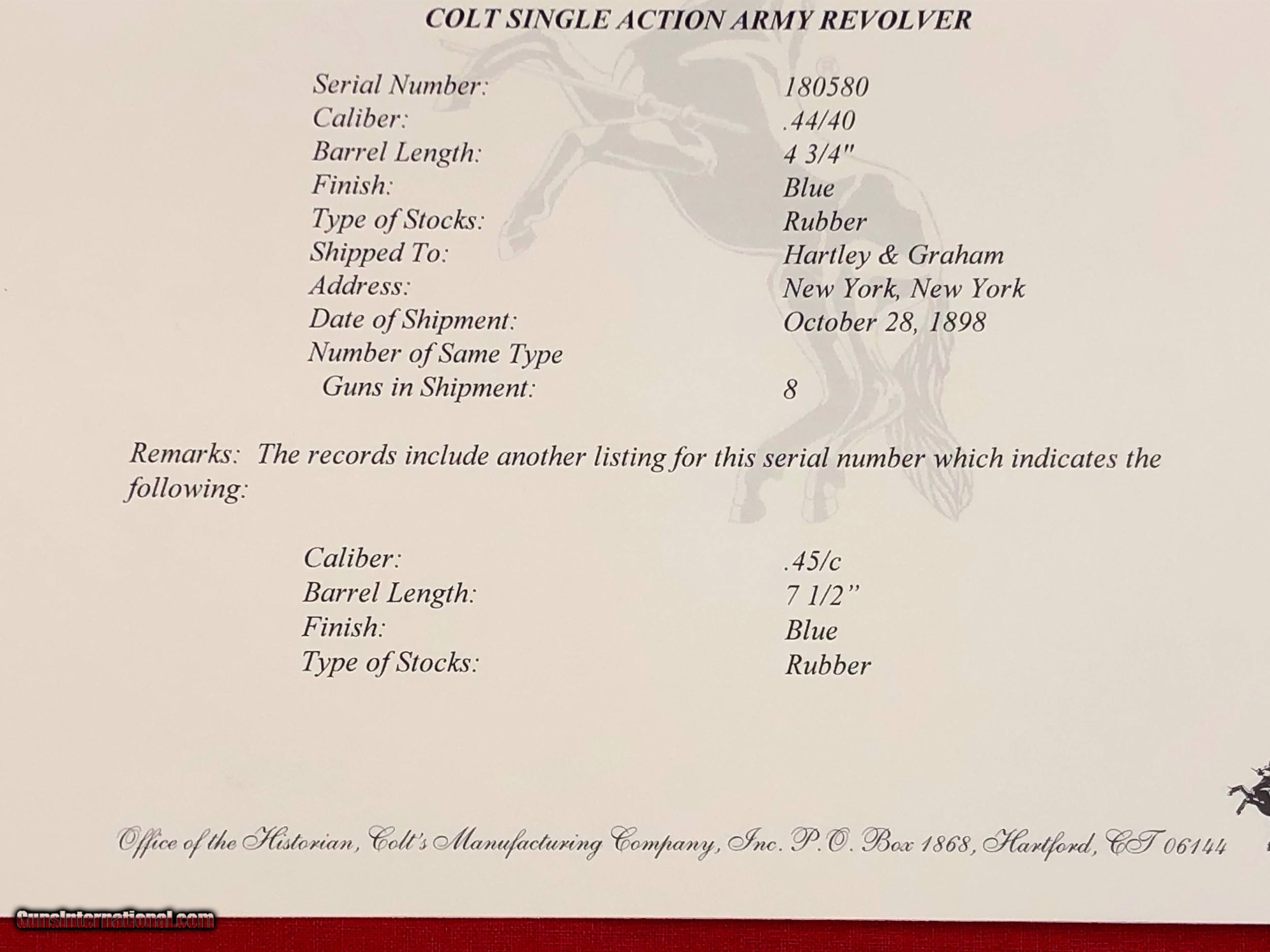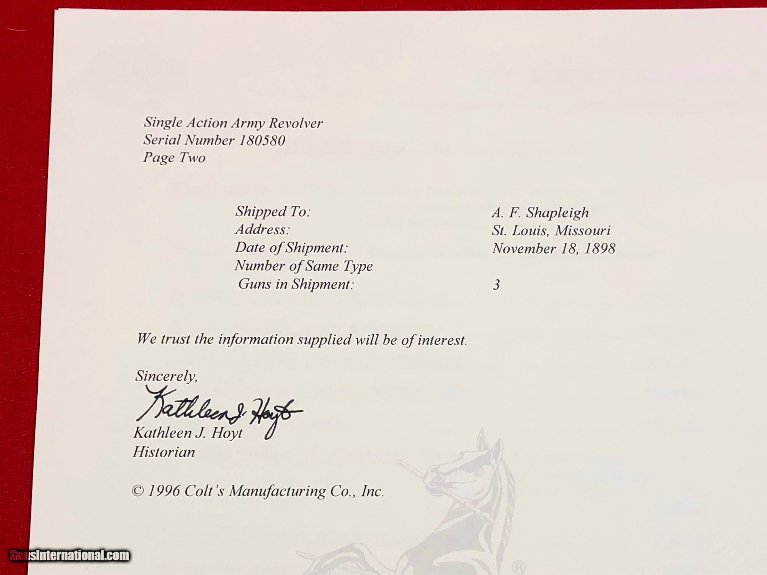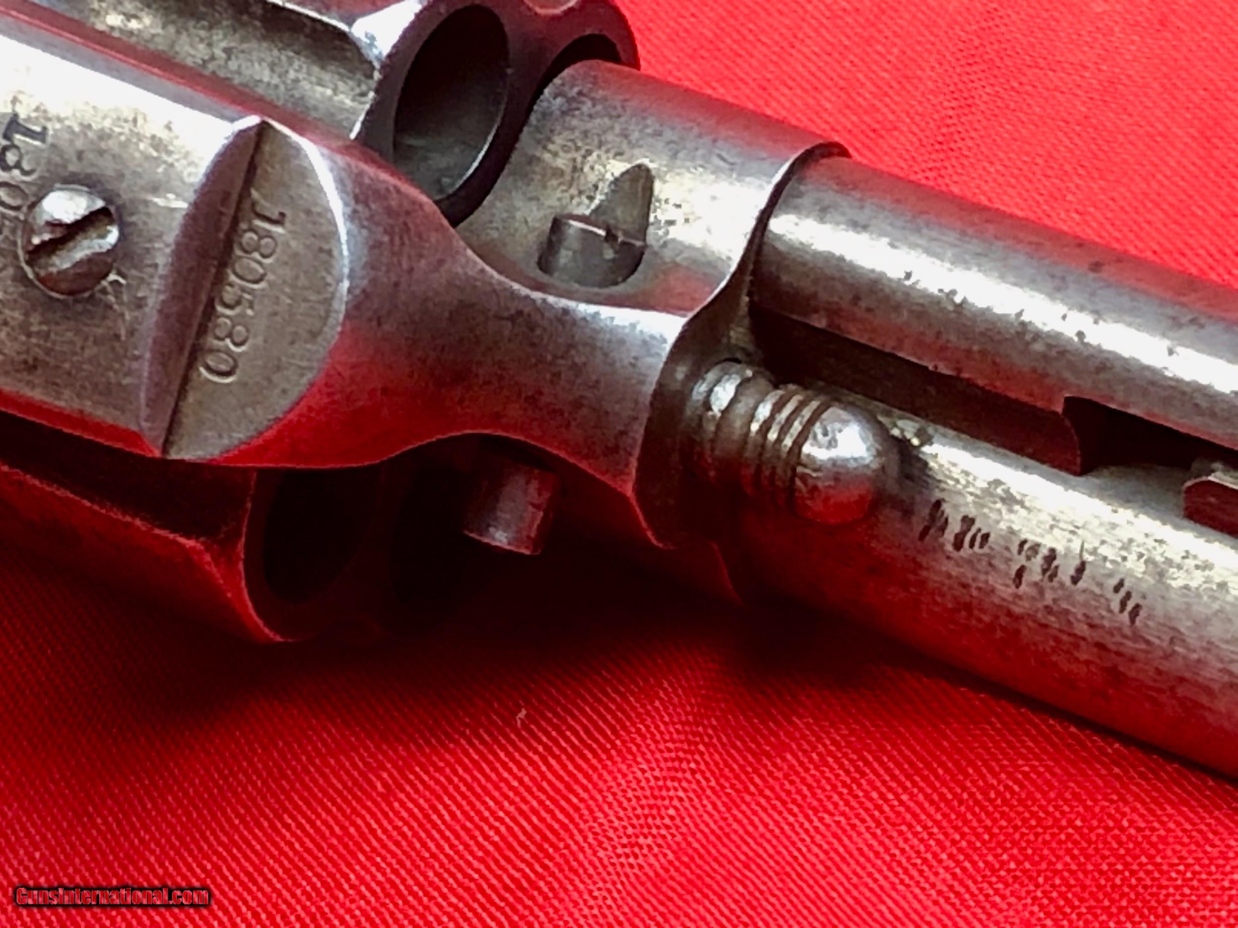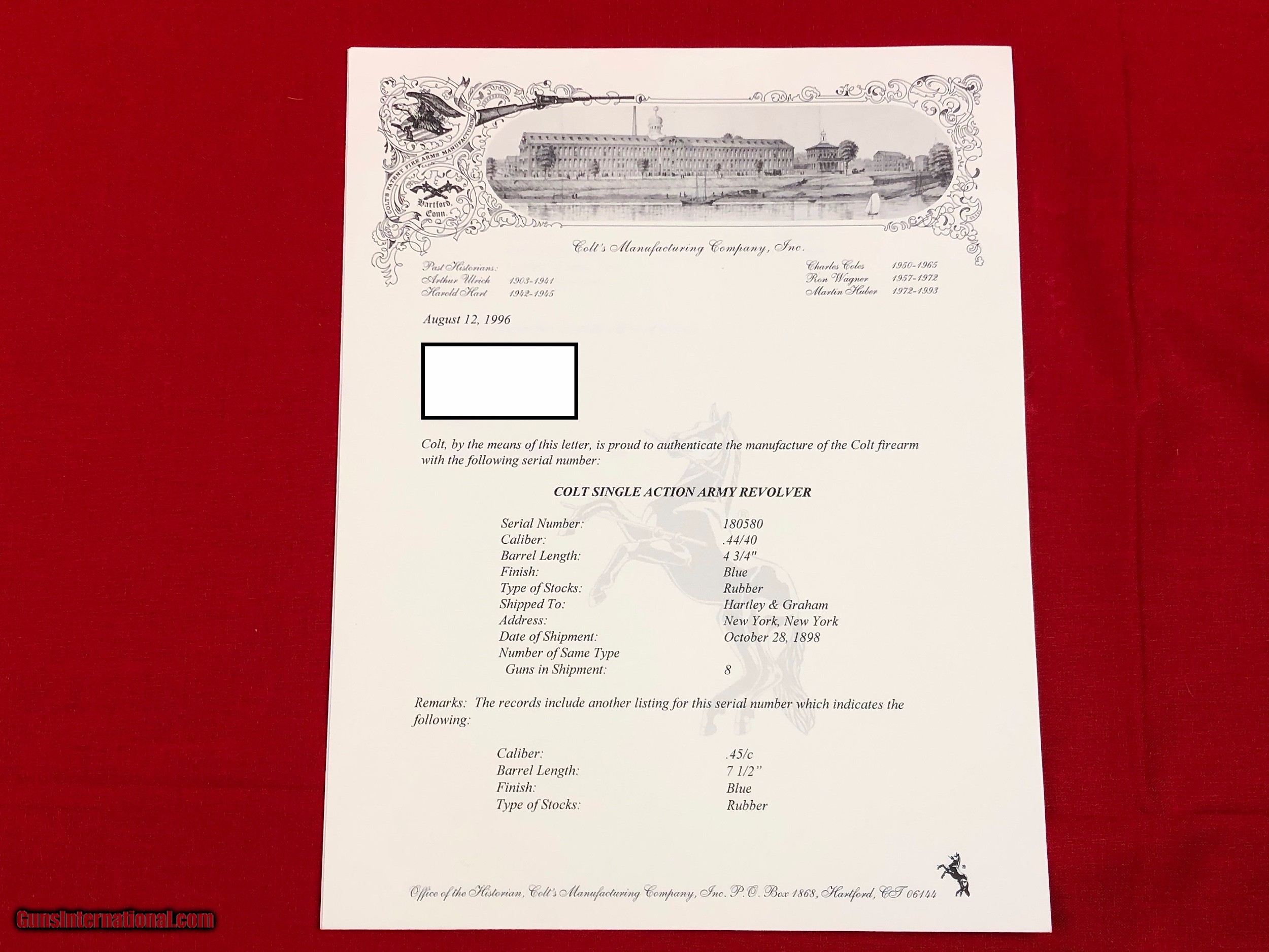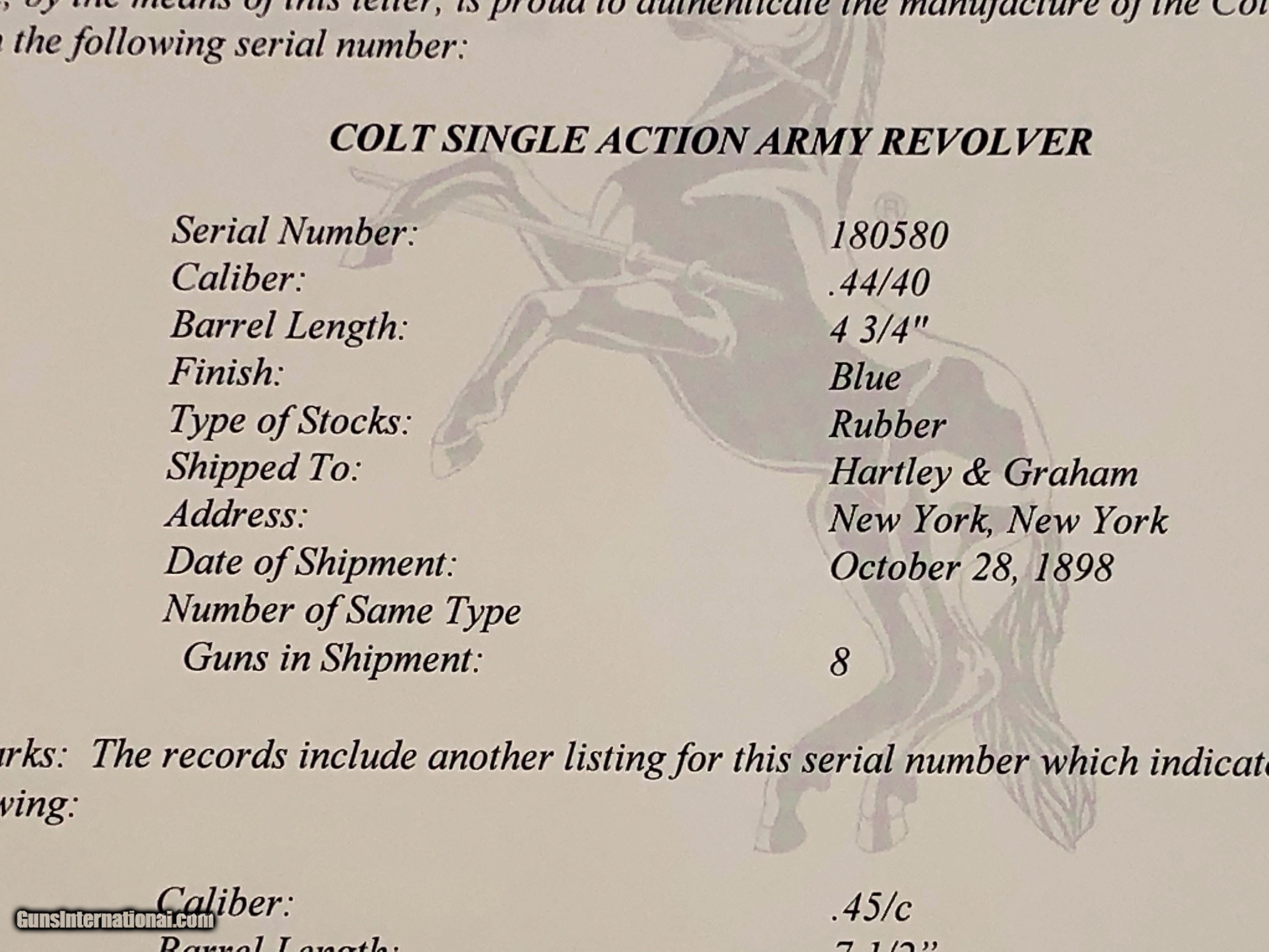 Description: Colt Single Action Frontier Six Shooter Caliber 44-40 Made in 1898 4.75 inch barrel Trace amounts of color case hardening remains Action in good condition and locks up well Original black rubber grips are very good with an excellent fit Bore is very good with prominent rifling Cylinders are very good Interesting Colt factory letter indicating a duplicate serial number Colt Single Action Army, please see pictures Solid Colt Single Action Revolver Antique firearm that ships anywhere All firearms should be checked by a gunsmith Call or text Paul at 601-397-8054 SOLD Antique: Yes |