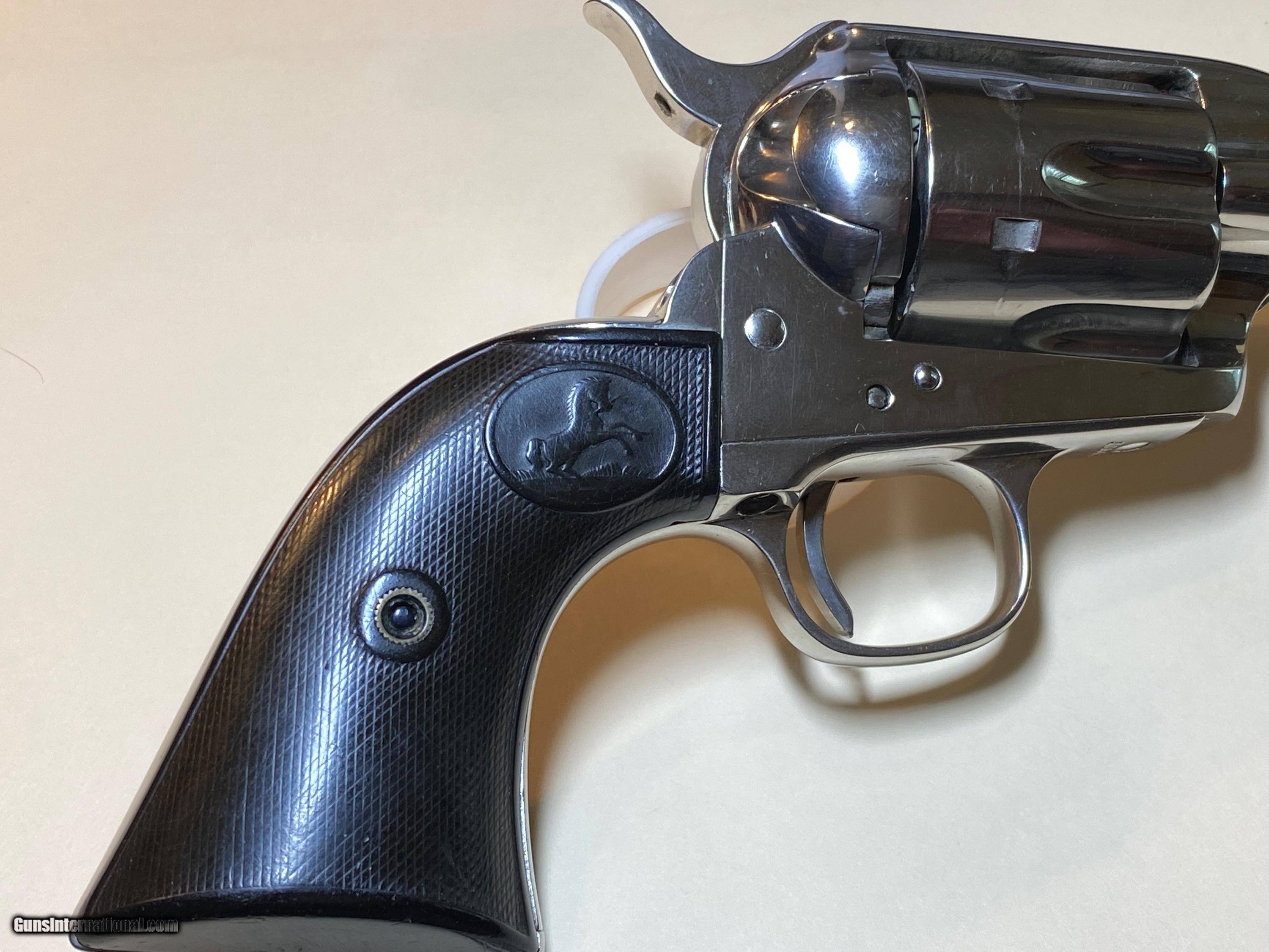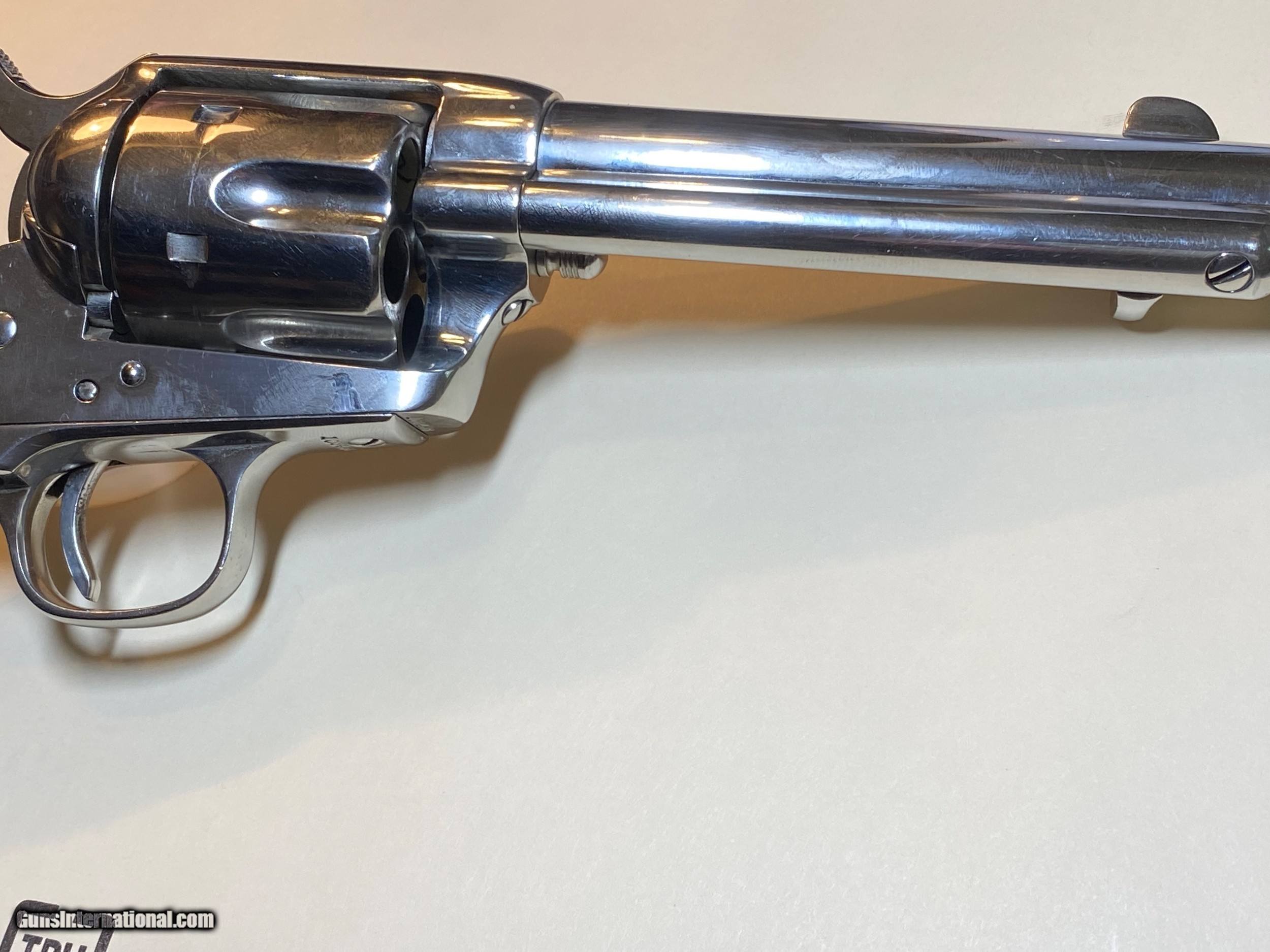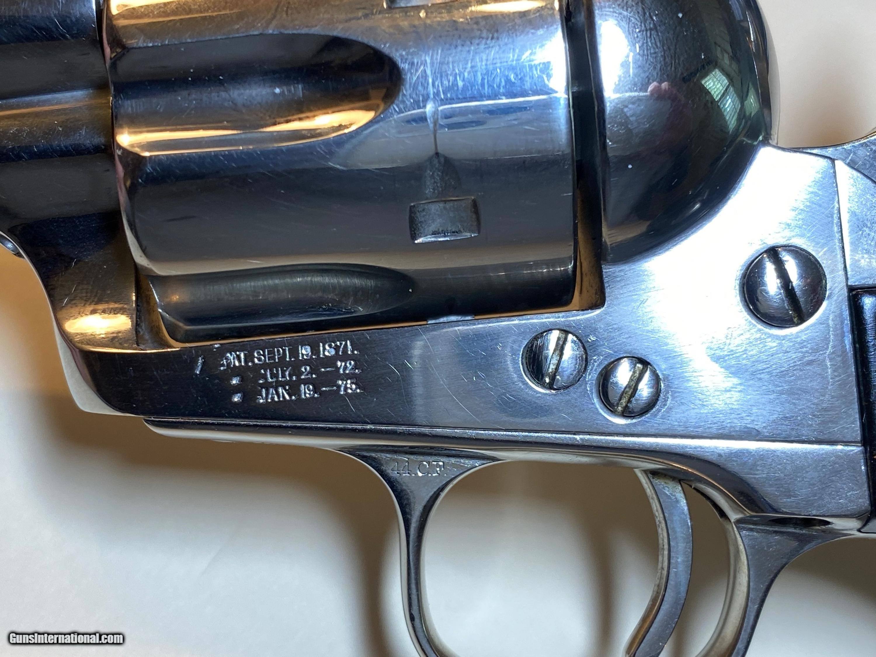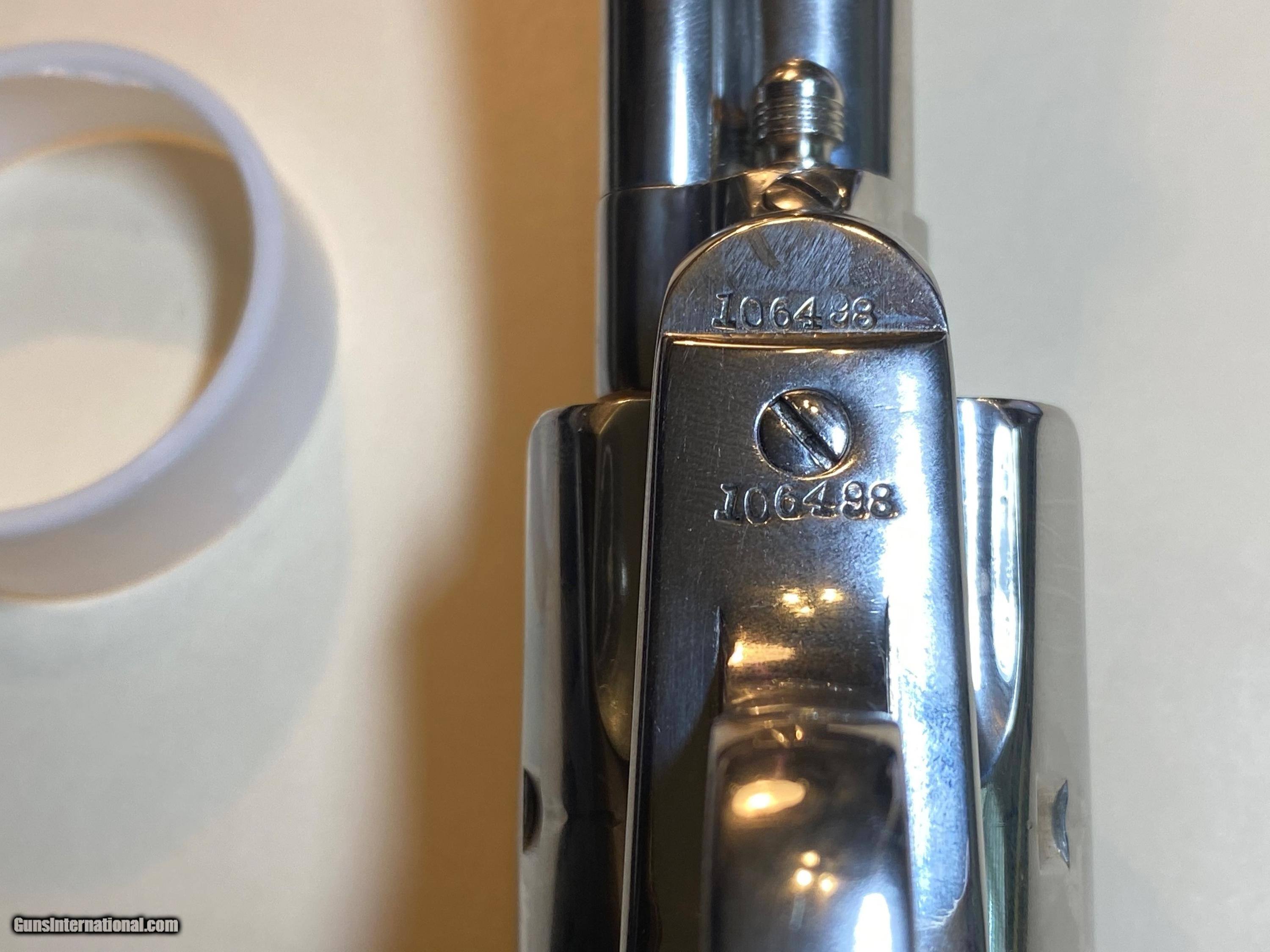 Description: COLT SINGLE ACTION REVOLVER SN 106498 MFG 1884 .44-40 HARD TO FIND ALL ORIGINAL BLACK POWDER REVOLVER. ANTIQUE. WITH SCARCE 4-3/4" FACTORY BARREL WITH CORRECT 2 LINE ADDRESS. COMES WITH A COLT LETTER SHOWING SHIPMENT TO SIMMONS HARDWARE COMPANY IN ST LOUIS, MISSOURI. COLT LETTER SHOWS GRIPS RUBBER AND FINISH WAS CHROME. THE LEFT HAND TRIGGER GUARD BOW IS CORRECTLY MARKED "44CF" INDICATING IT IS AN ORIGINAL .44-40 COLT REVOLVER. ALL SN ARE CLEAR AND MATCH. LEFT AND RIGHT BOTTOM OF TRIGGER GUARD STAMPED "219" LOADING GATE STAMPED "4828". BOTTOM OF BARREL COVERED BY INJECTOR HOUSING STAMPED "612" FRONT OF CYLINDER STAMPED "19" AND BACKS STAMPED "L". THE ACTION IS EXCELLENT AND CORRECT WITH 4-CLICKS. ALL CYLINDERS LOCK TIGHT. REVOLVER APPEARS TO BE RE-CHROMED PROFESSIONALLY. THE CHROME SHOWS VERY LITTLE LIGHT WEAR AND IS IN 100% CONDITION. THE ATTACHED PICTURES SHOW THE EXCELLENT CONDITION OF THIS ALL ORIGINAL COLT BLACK POWDER ANTIQUE REVOLVER. FFL NOT REQUIRED SHIPPING IS FREE LOWER 48 AND ALASKA EXCLUDING CALIFORNIA SOLD Antique: Yes Rifle Caliber: .44-40 Winchester, .177 (Air Rifle) Handgun Caliber: .44-40 Winchester (.44 WCF) Manufacturer: COLT Model: SINGLE ACTION BLACK POWDER REVOLVER Serial Number: 106 498 Barrel Length: 4-3/4”. SCARCE ORIGINAL COLT BBL Bore: VERY GODD Chambers: VERY GOOD Ejectors: VERY GOOD Condition: Excellent Metal Condition: Excellent Bore Condition: VERY GOOD Barrels: VERY GOOD Barrel Type: COLT FACTORY ORIGINAL Action: EXCELLENT Triggers: EXCELLENT Sights: Factory Manufacture Date: 1884 Item Location: Texas 75069 |