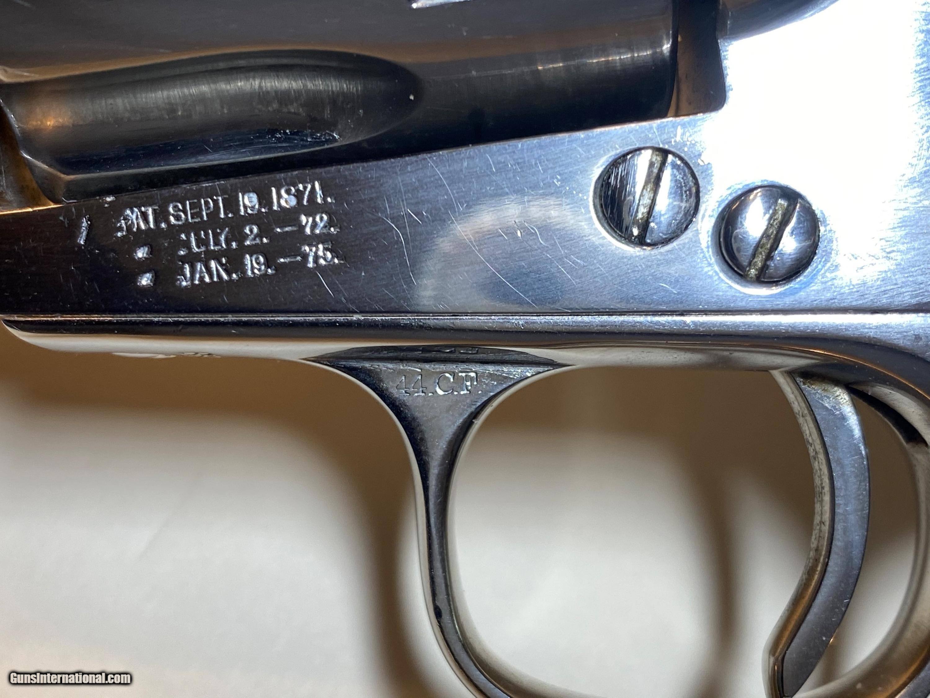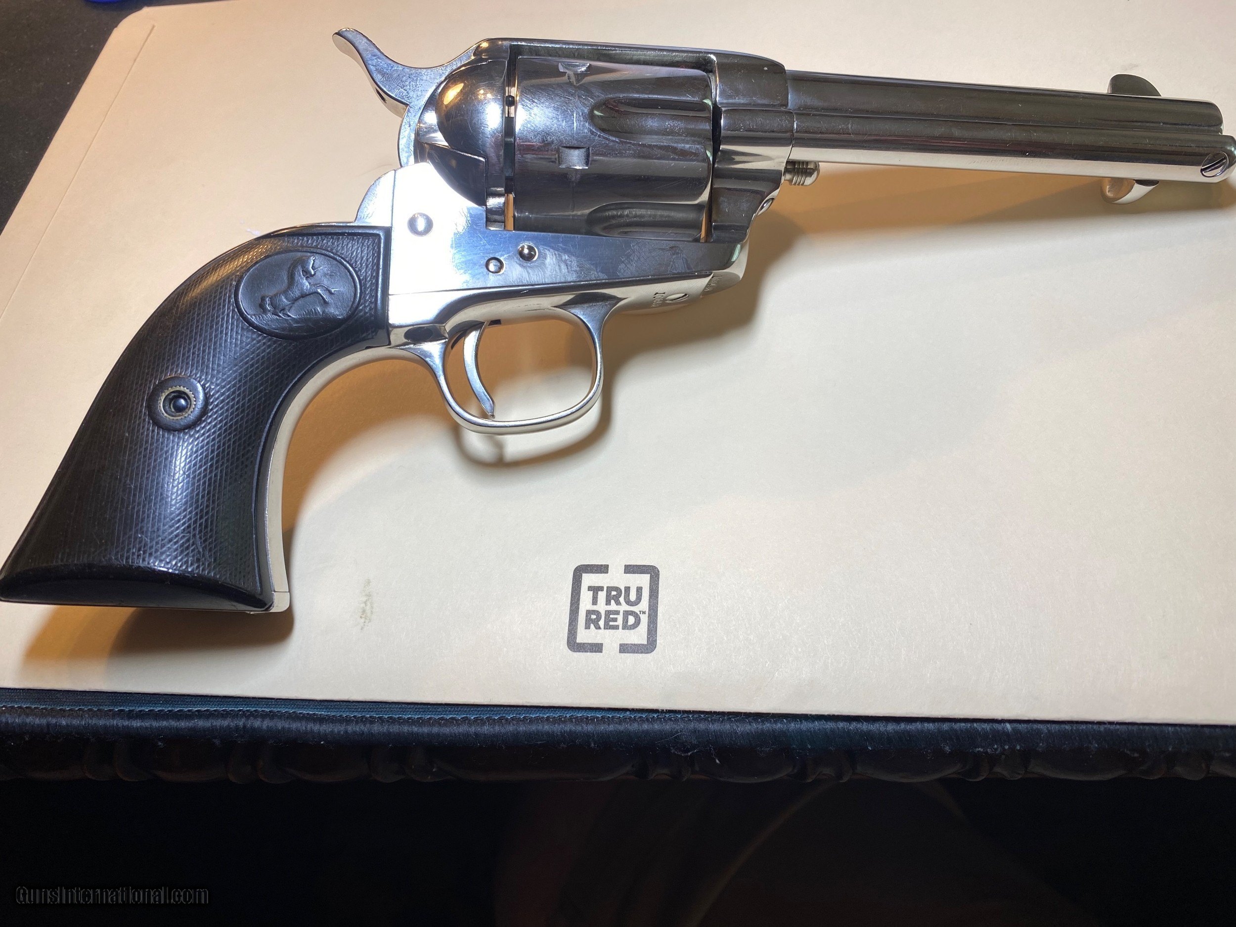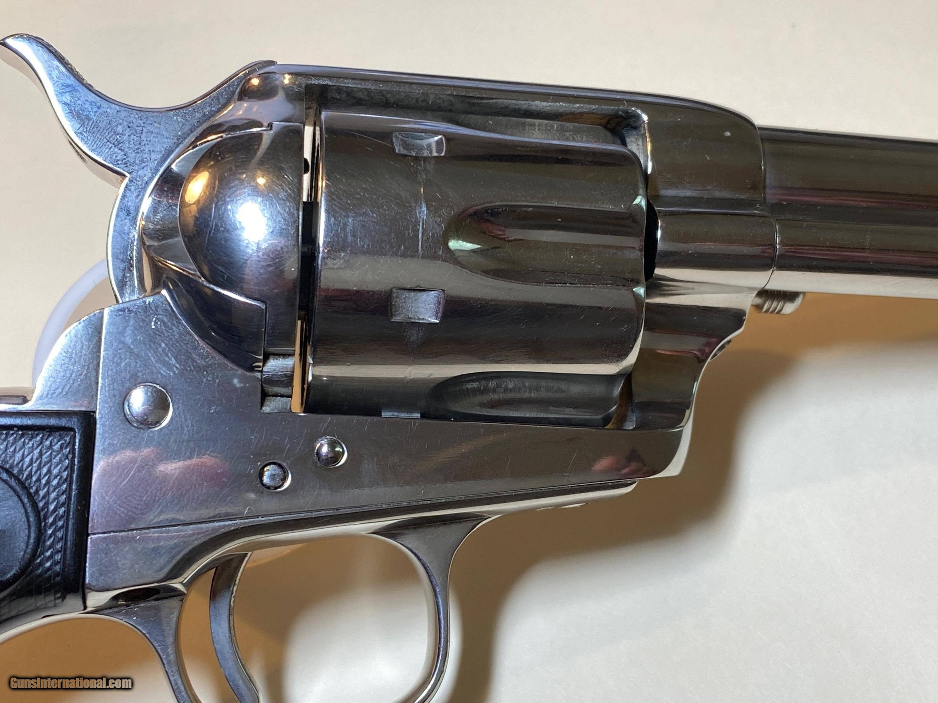 Description: COLT SINGLE ACTION REVOLVER SN 106498 MFG 1884 .44-40 HARD TO FIND ALL ORIGINAL BLACK POWDER REVOLVER. ANTIQUE. WITH SCARCE 4-3/4" FACTORY BARREL WITH CORRECT 2 LINE ADDRESS. COMES WITH A COLT LETTER SHOWING SHIPMENT TO SIMMONS HARDWARE COMPANY IN ST LOUIS, MISSOURI. COLT LETTER SHOWS GRIPS RUBBER AND FINISH WAS CHROME. THE LEFT HAND TRIGGER GUARD BOW IS CORRECTLY MARKED "44CF" INDICATING IT IS AN ORIGINAL .44-40 COLT REVOLVER. ALL SN ARE CLEAR AND MATCH. LEFT AND RIGHT BOTTOM OF TRIGGER GUARD STAMPED "219" LOADING GATE STAMPED "4828". BOTTOM OF BARREL COVERED BY INJECTOR HOUSING STAMPED "612" FRONT OF CYLINDER STAMPED "19" AND BACKS STAMPED "L". THE ACTION IS EXCELLENT AND CORRECT WITH 4-CLICKS. ALL CYLINDERS LOCK TIGHT. REVOLVER APPEARS TO BE RE-CHROMED PROFESSIONALLY. THE CHROME SHOWS VERY LITTLE LIGHT WEAR AND IS IN 100% CONDITION. THE ATTACHED PICTURES SHOW THE EXCELLENT CONDITION OF THIS ALL ORIGINAL COLT BLACK POWDER ANTIQUE REVOLVER. FFL NOT REQUIRED SHIPPING IS FREE LOWER 48 AND ALASKA EXCLUDING CALIFORNIA SOLD Antique: Yes Rifle Caliber: .44-40 Winchester, .177 (Air Rifle) Handgun Caliber: .44-40 Winchester (.44 WCF) Manufacturer: COLT Model: SINGLE ACTION BLACK POWDER REVOLVER Serial Number: 106 498 Barrel Length: 4-3/4”. SCARCE ORIGINAL COLT BBL Bore: VERY GODD Chambers: VERY GOOD Ejectors: VERY GOOD Condition: Excellent Metal Condition: Excellent Bore Condition: VERY GOOD Barrels: VERY GOOD Barrel Type: COLT FACTORY ORIGINAL Action: EXCELLENT Triggers: EXCELLENT Sights: Factory Manufacture Date: 1884 Item Location: Texas 75069 |