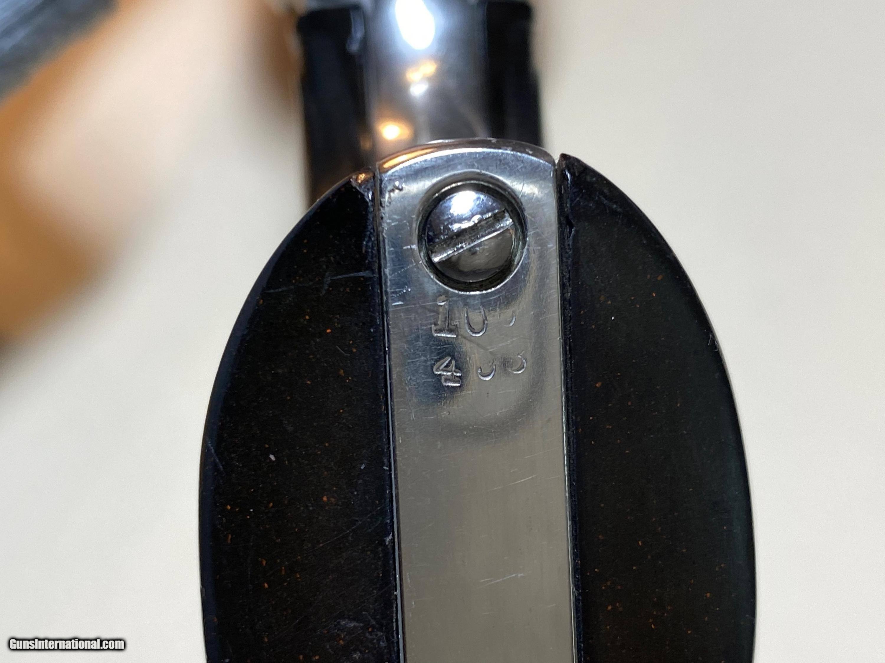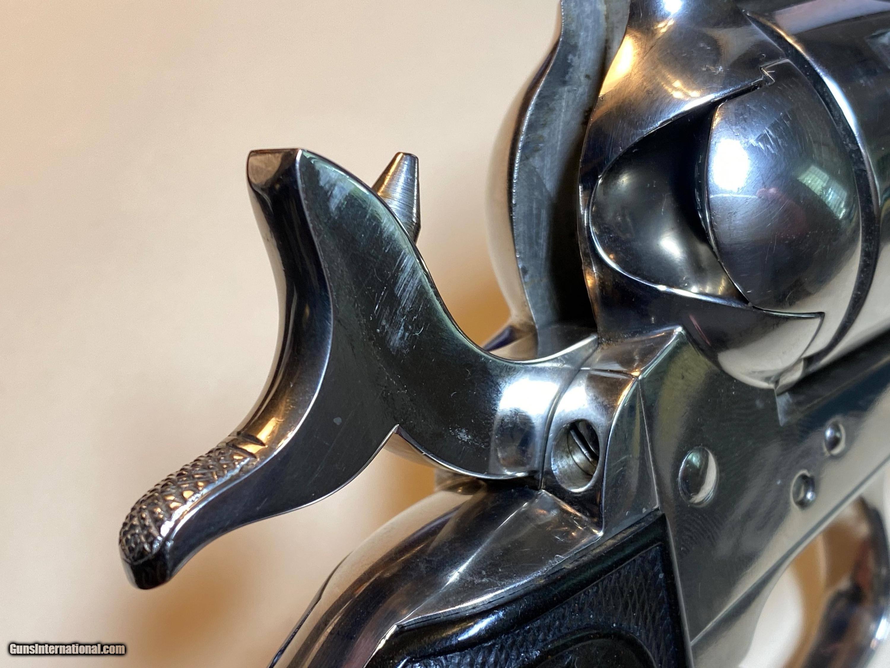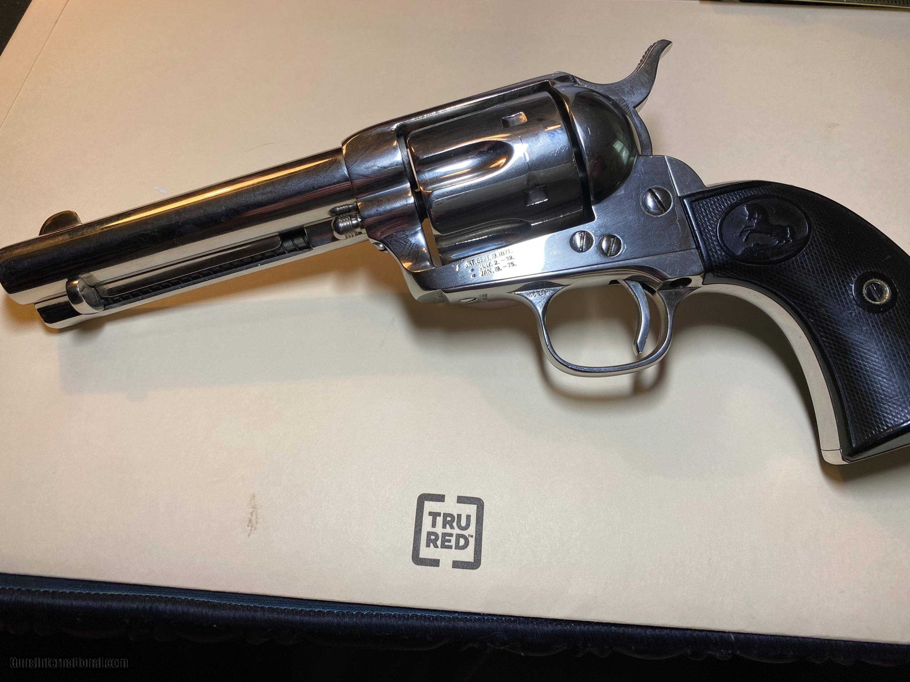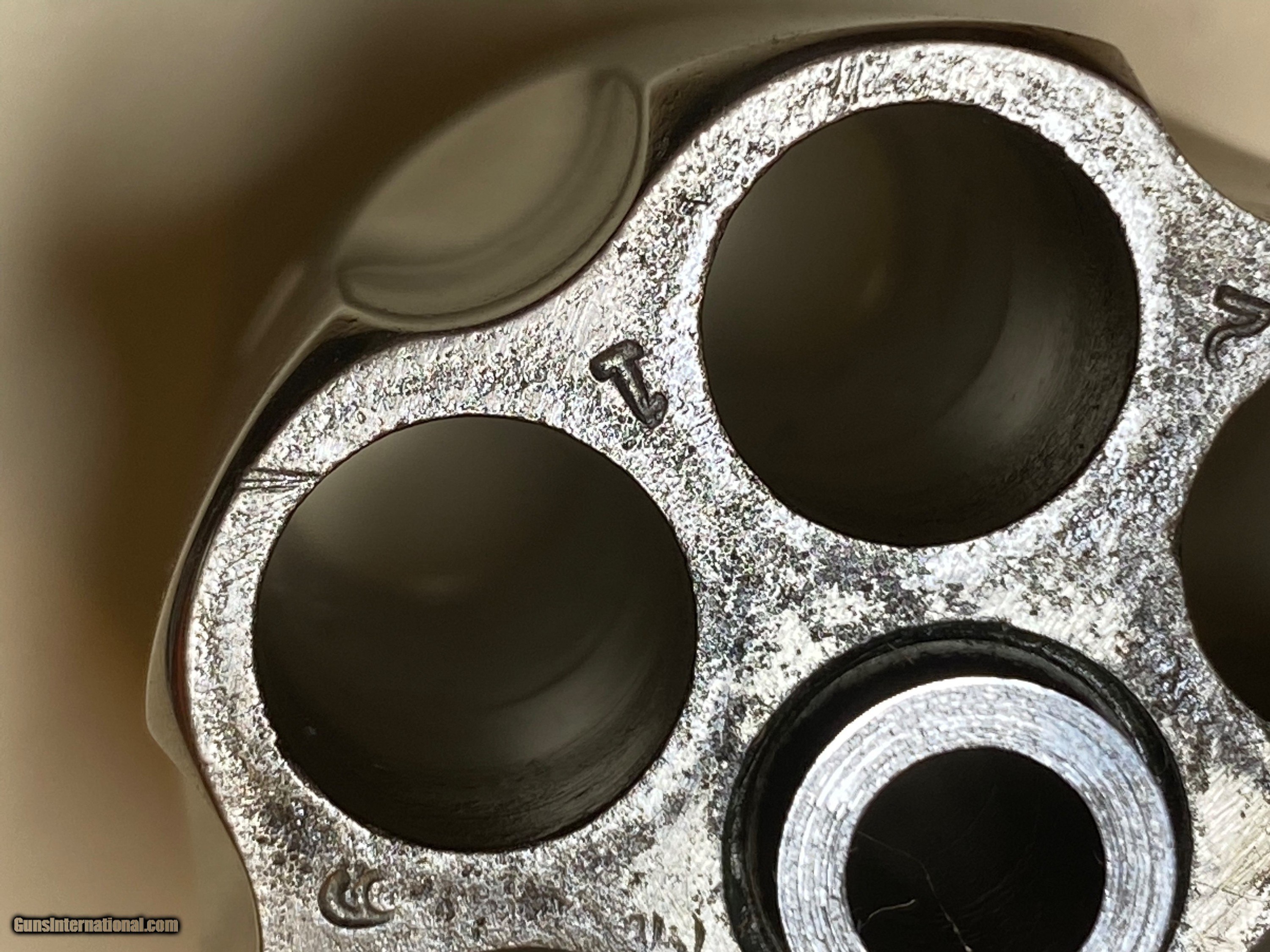 Description: COLT SINGLE ACTION REVOLVER SN 106498 MFG 1884 .44-40 HARD TO FIND ALL ORIGINAL BLACK POWDER REVOLVER. ANTIQUE. WITH SCARCE 4-3/4" FACTORY BARREL WITH CORRECT 2 LINE ADDRESS. COMES WITH A COLT LETTER SHOWING SHIPMENT TO SIMMONS HARDWARE COMPANY IN ST LOUIS, MISSOURI. COLT LETTER SHOWS GRIPS RUBBER AND FINISH WAS CHROME. THE LEFT HAND TRIGGER GUARD BOW IS CORRECTLY MARKED "44CF" INDICATING IT IS AN ORIGINAL .44-40 COLT REVOLVER. ALL SN ARE CLEAR AND MATCH. LEFT AND RIGHT BOTTOM OF TRIGGER GUARD STAMPED "219" LOADING GATE STAMPED "4828". BOTTOM OF BARREL COVERED BY INJECTOR HOUSING STAMPED "612" FRONT OF CYLINDER STAMPED "19" AND BACKS STAMPED "L". THE ACTION IS EXCELLENT AND CORRECT WITH 4-CLICKS. ALL CYLINDERS LOCK TIGHT. REVOLVER APPEARS TO BE RE-CHROMED PROFESSIONALLY. THE CHROME SHOWS VERY LITTLE LIGHT WEAR AND IS IN 100% CONDITION. THE ATTACHED PICTURES SHOW THE EXCELLENT CONDITION OF THIS ALL ORIGINAL COLT BLACK POWDER ANTIQUE REVOLVER. FFL NOT REQUIRED SHIPPING IS FREE LOWER 48 AND ALASKA EXCLUDING CALIFORNIA SOLD Antique: Yes Rifle Caliber: .44-40 Winchester, .177 (Air Rifle) Handgun Caliber: .44-40 Winchester (.44 WCF) Manufacturer: COLT Model: SINGLE ACTION BLACK POWDER REVOLVER Serial Number: 106 498 Barrel Length: 4-3/4”. SCARCE ORIGINAL COLT BBL Bore: VERY GODD Chambers: VERY GOOD Ejectors: VERY GOOD Condition: Excellent Metal Condition: Excellent Bore Condition: VERY GOOD Barrels: VERY GOOD Barrel Type: COLT FACTORY ORIGINAL Action: EXCELLENT Triggers: EXCELLENT Sights: Factory Manufacture Date: 1884 Item Location: Texas 75069 |