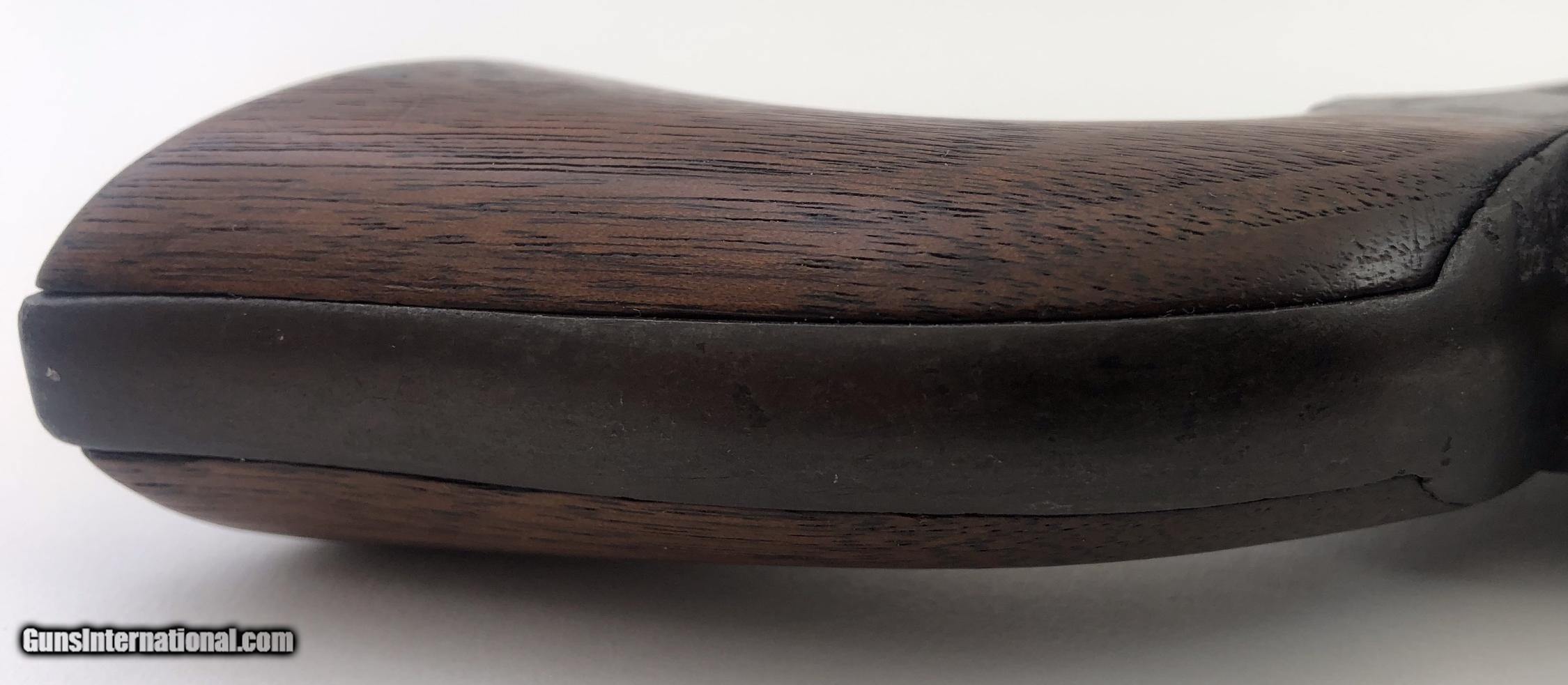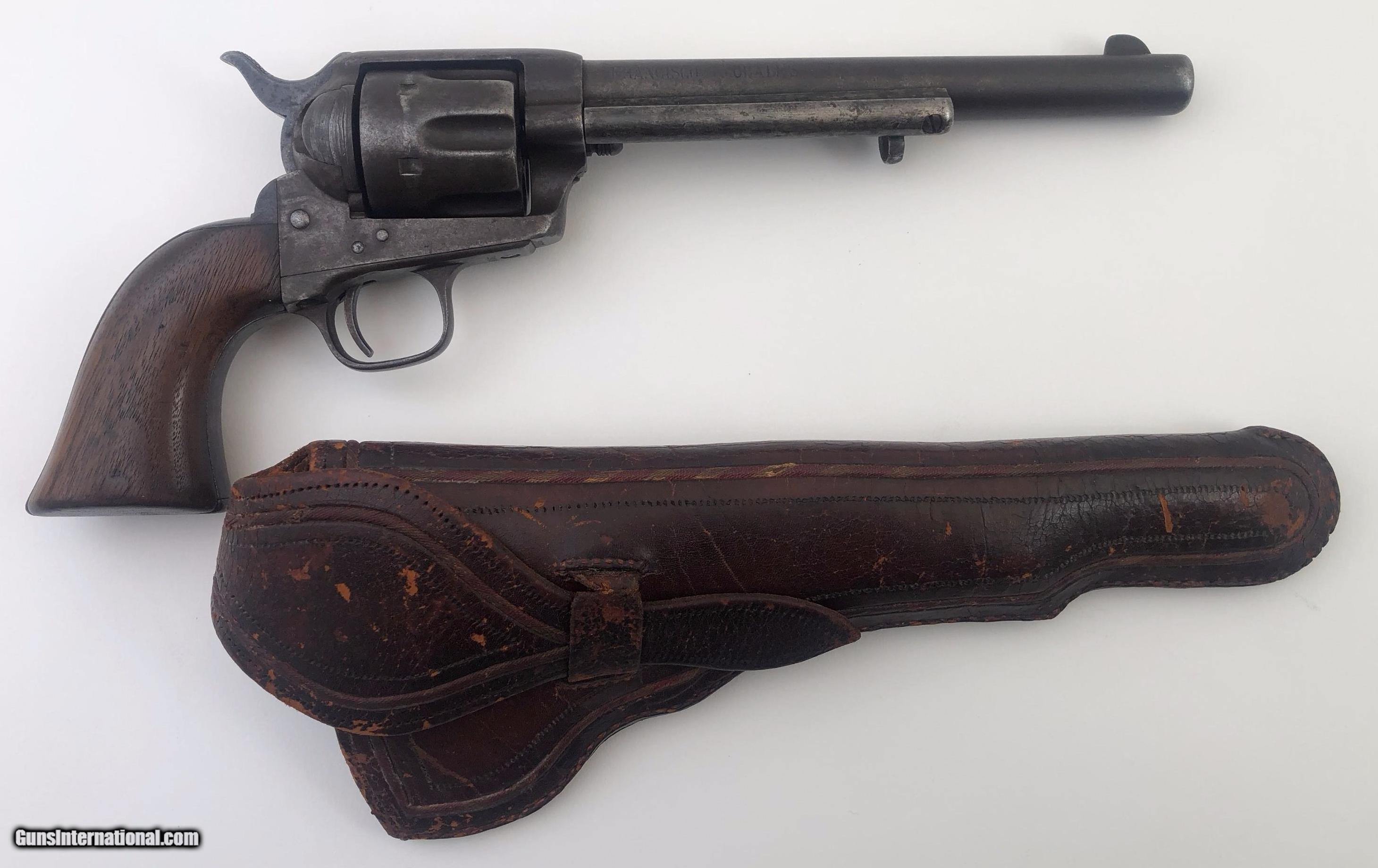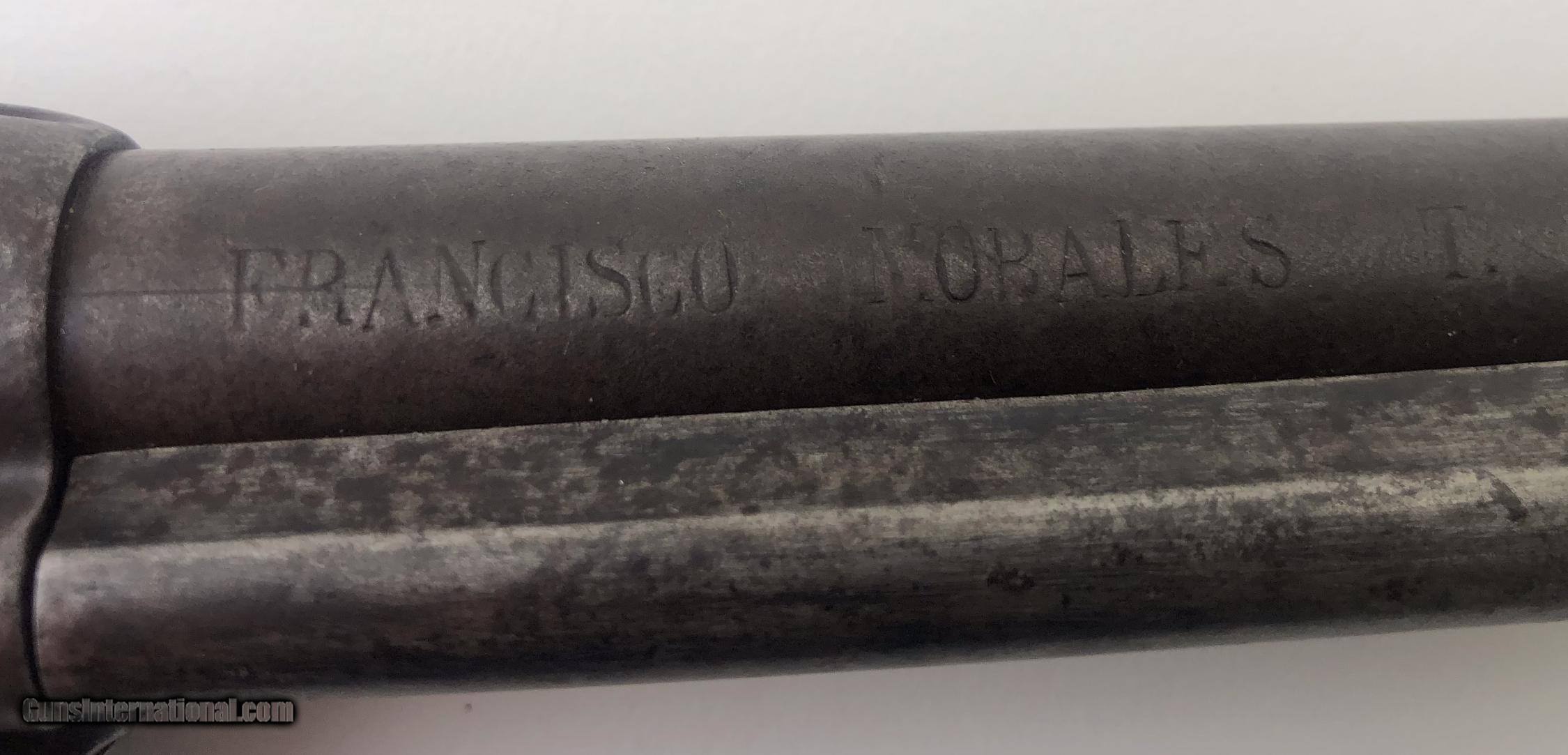 Description: Inscribed on barrel " FRANCISCO MORALES T. Action is crisp and the bore is good. Gun has matching serial numbers and is chambered for the 45 long Colt cartridge. Metal retains traces of nickel plating with the balance a wonderful untouched age patina. This gun has great character and includes it's fabulous fitted and lined Mexican style holster. Mfg. !876. SOLD Antique: Yes Manufacturer: COLT Model: SINGLE ACTION Serial Number: 28086 Barrel Length: 7.5 |