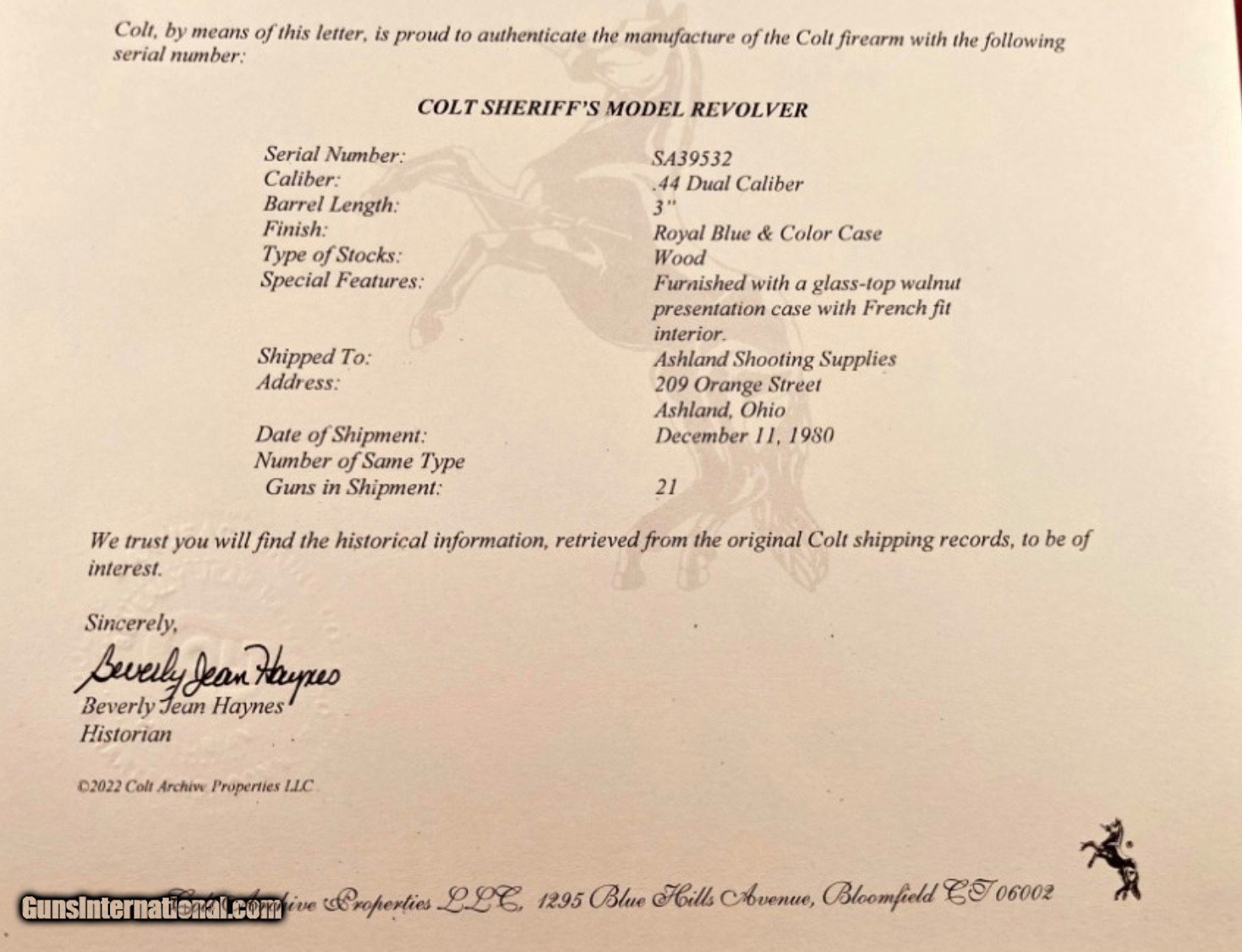 Description: Here is a MINT Colt Sheriff’s SAA w-factory box + letter; 44-40 & 44 Special This Colt is in absolutely STUNNING condition Colt Single Action Army Sheriff’s Model dual caliber/dual cylinder with its factory case and an official Colt archive letter. She will make a great centerpiece in a display room or mancave. I’ll just stop right here and let the pictures do the talking Description